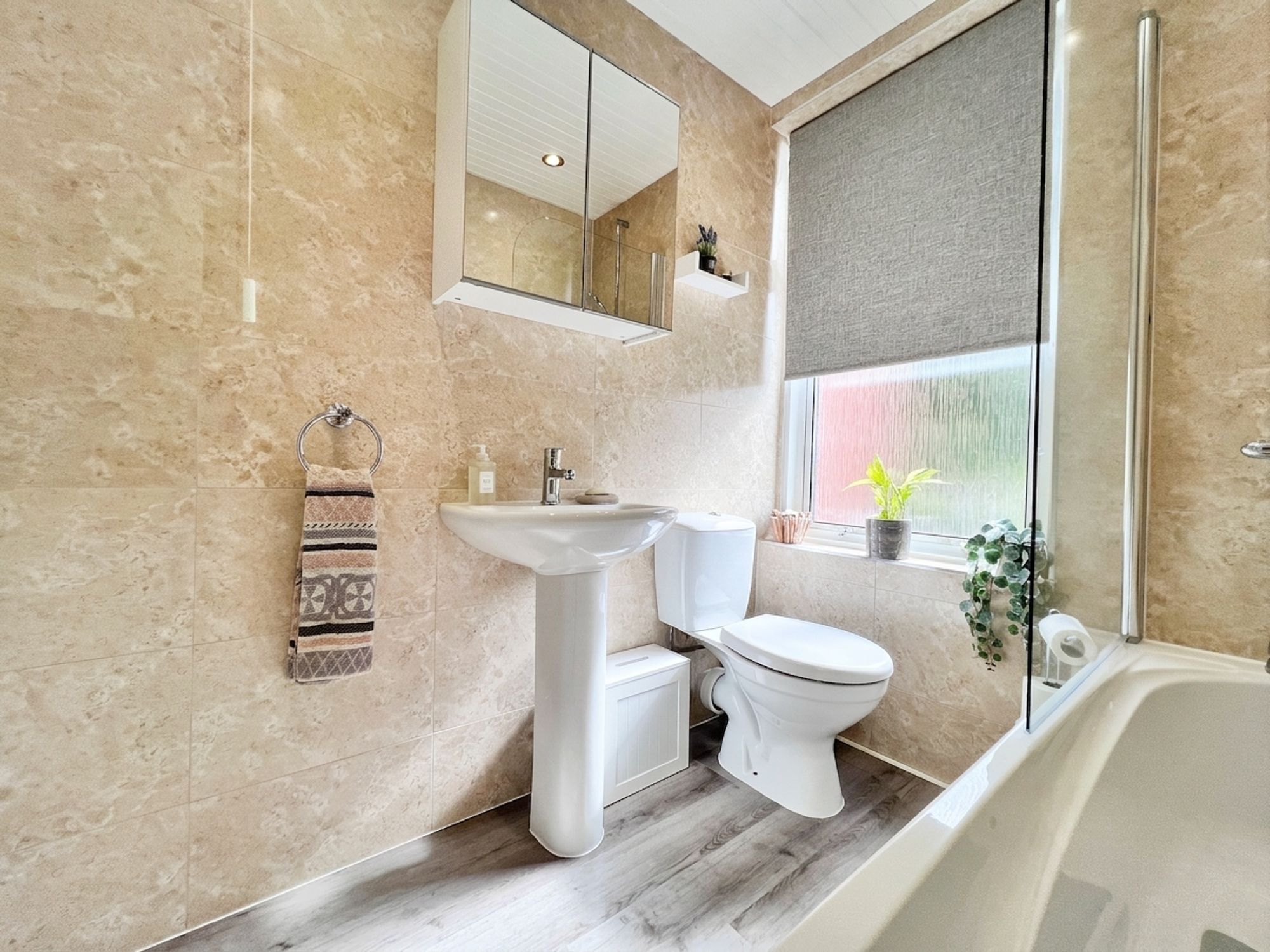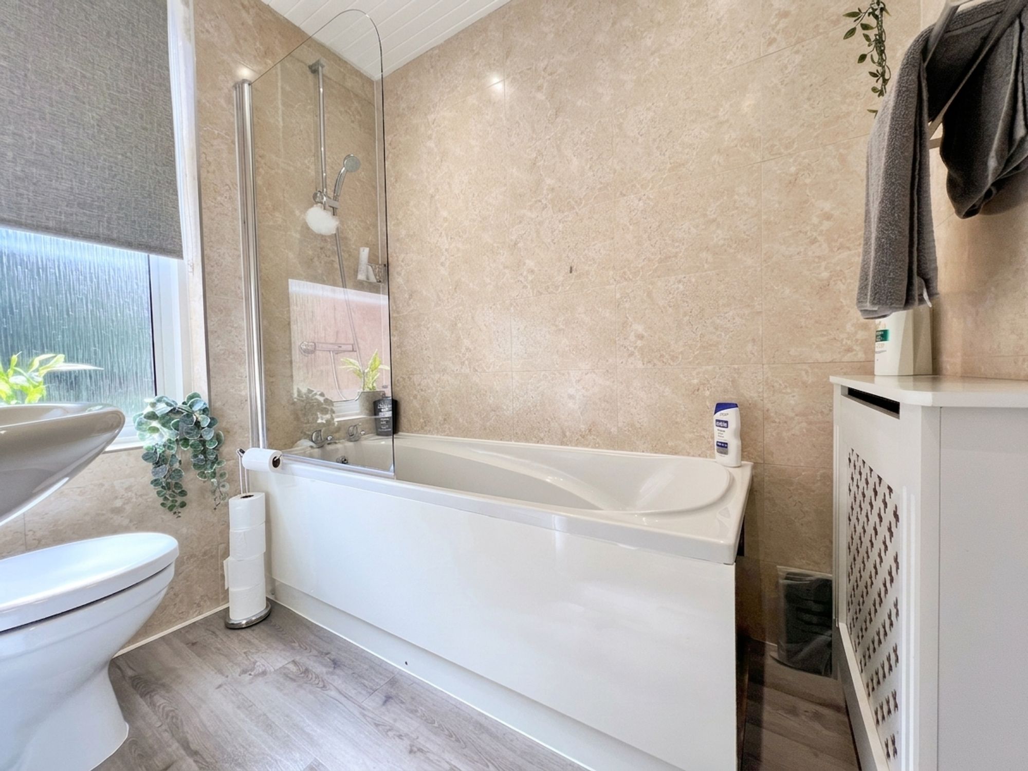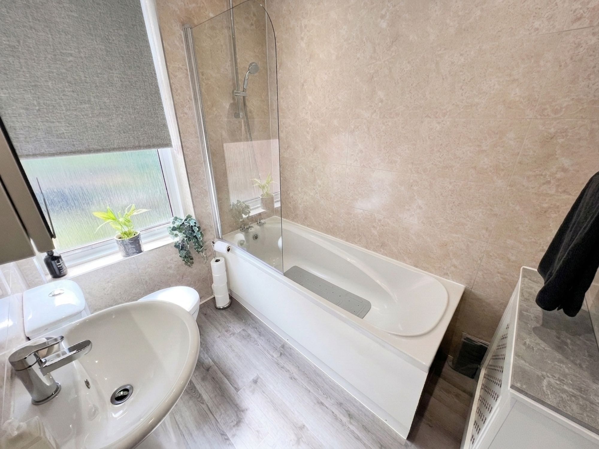 The bathroom is crisp and contemporary in design, featuring a full-size bath with shower over and glass screen, along with a wash basin and W.C. The walls are fully tiled in neutral tones, complemented by wood-effect laminate flooring, creating a stylish and practical finish.