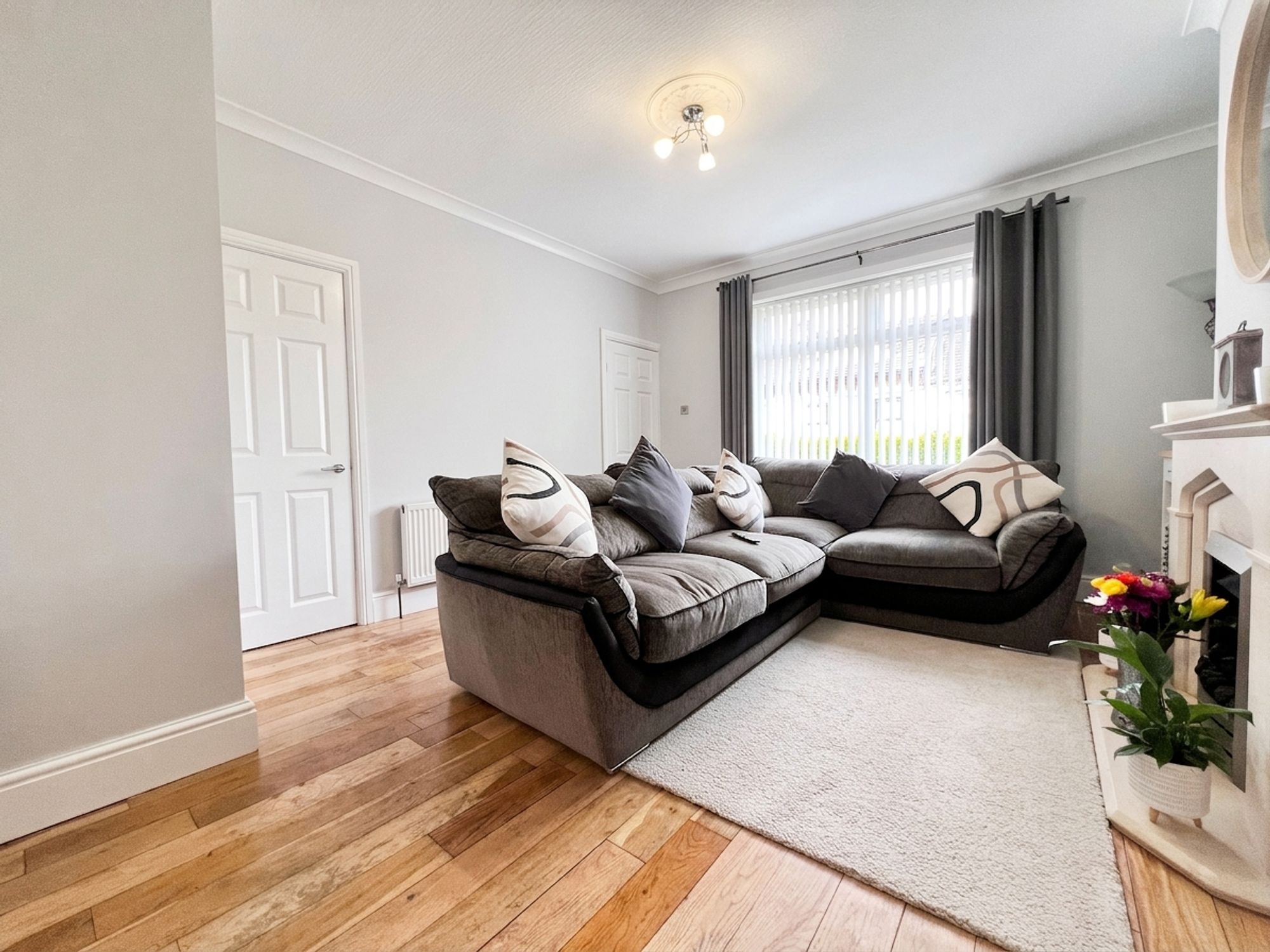A fantastic sized lounge, beautifully presented in tasteful modern décor with stripped wooden flooring tying the whole aesthetic together. The central focal point is the coal-effect gas fireplace, housed within a stylish surround, creating a warm and inviting atmosphere. Flooded with natural light courtesy of the front-facing window, the room feels bright and welcoming, while oak and glass feature double doors open through to the dining room, enhancing the flow and creating a wonderfully sociable living space.