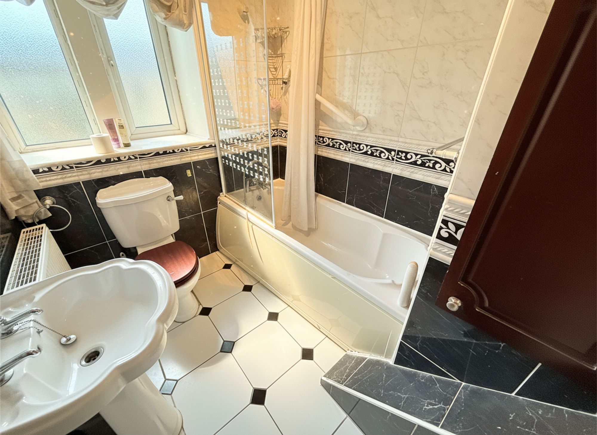 Fitted with a full-sized bath featuring a chrome mixer tap and handheld shower attachment, along with a WC and pedestal sink with chrome mixer tap. The room also benefits from a built-in linen cupboard, providing useful storage. Finished with marble-effect black and white patterned wall tiles and complementary tiled flooring, the bathroom offers a stylish and practical space.