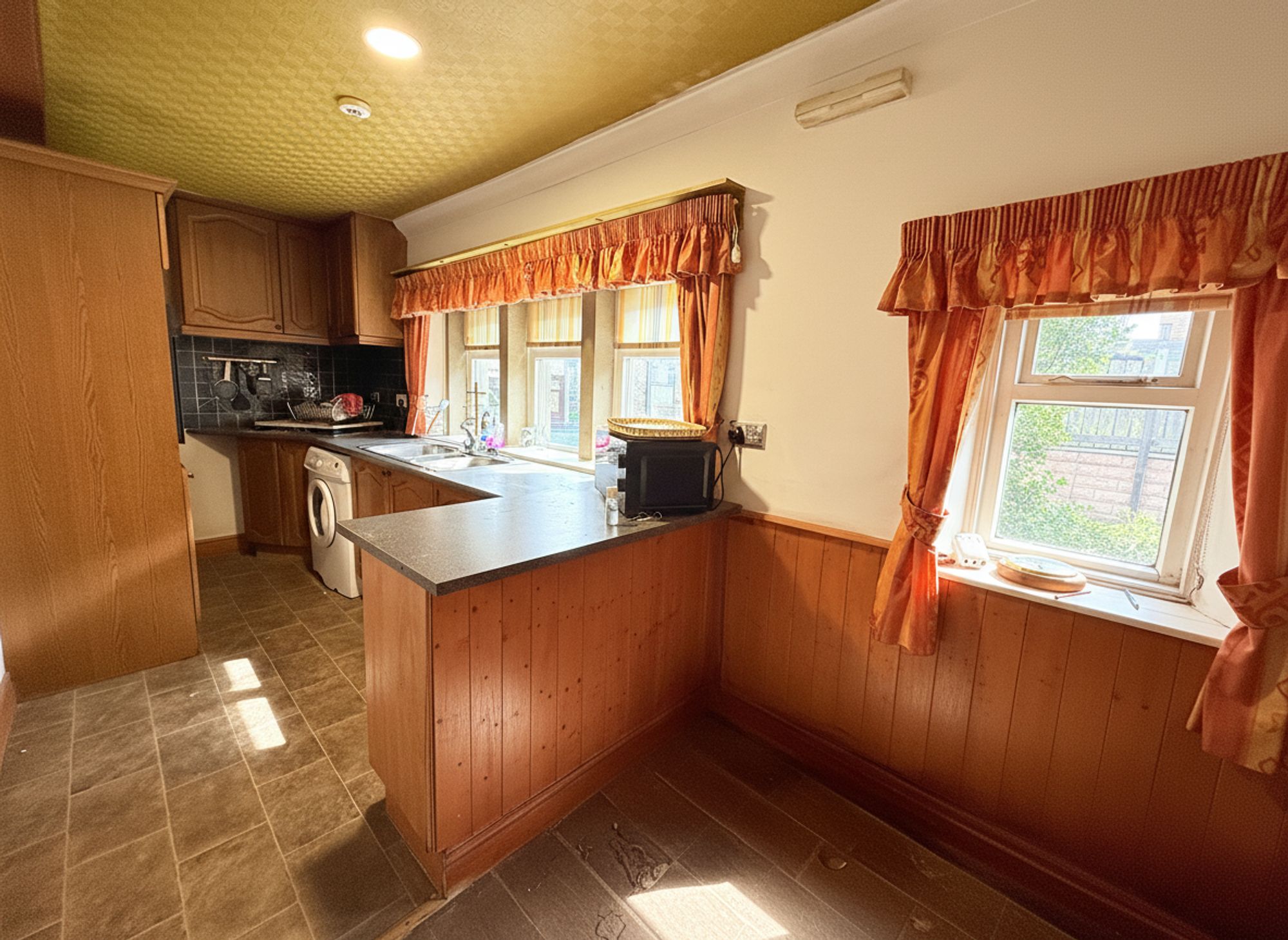 Located to the rear of the property and spanning the full width of the home, this spacious and characterful kitchen is fitted with wood-effect cabinetry complemented by contrasting worktops. It features an integrated chrome sink with mixer tap, gas oven, four-ring gas hob, built-in wine storage, and dedicated space for a washing machine. A handy breakfast bar provides the perfect spot for casual dining or room to accommodate a small dining table if preferred. The kitchen also offers access to the cellar. Exposed wooden beam details, stone mullion windows, and tile-effect linoleum flooring add warmth and charm, creating a welcoming and practical family space.