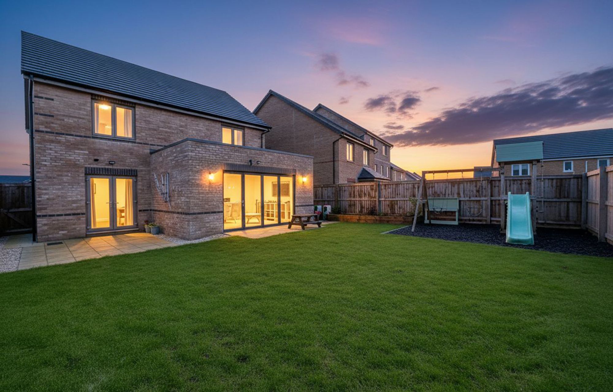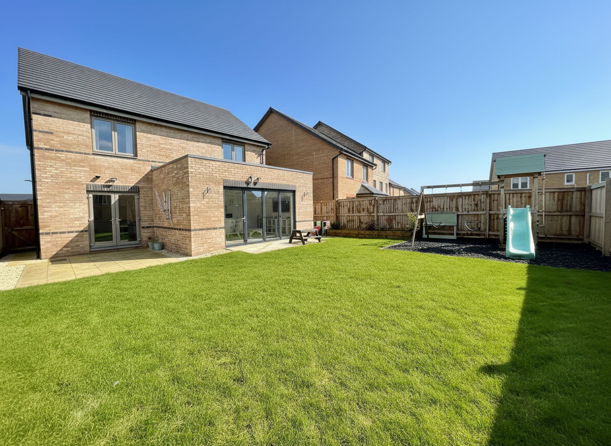 To the front of the property, a private driveway provides off-road parking for two vehicles and leads to a single garage, which benefits from an EV charging point and offers additional secure parking or practical storage. Ambient front lighting, operated by remote control and fully colour-adjustable, adds an impressive touch of modern luxury while enhancing the home’s kerb appeal. To the rear, the fully enclosed level garden provides a safe and secure environment for children and pets. Thoughtfully and lovingly landscaped by the current owners, the space incorporates a dedicated children’s play area and external power points for outdoor lighting. Seamlessly connected to the dining kitchen via bi-fold doors and additional patio doors, the garden allows indoor and outdoor living to flow effortlessly. Perfect for entertaining and socialising, this inviting space lends itself beautifully to summer barbecues, relaxed evenings with friends, and family gatherings.