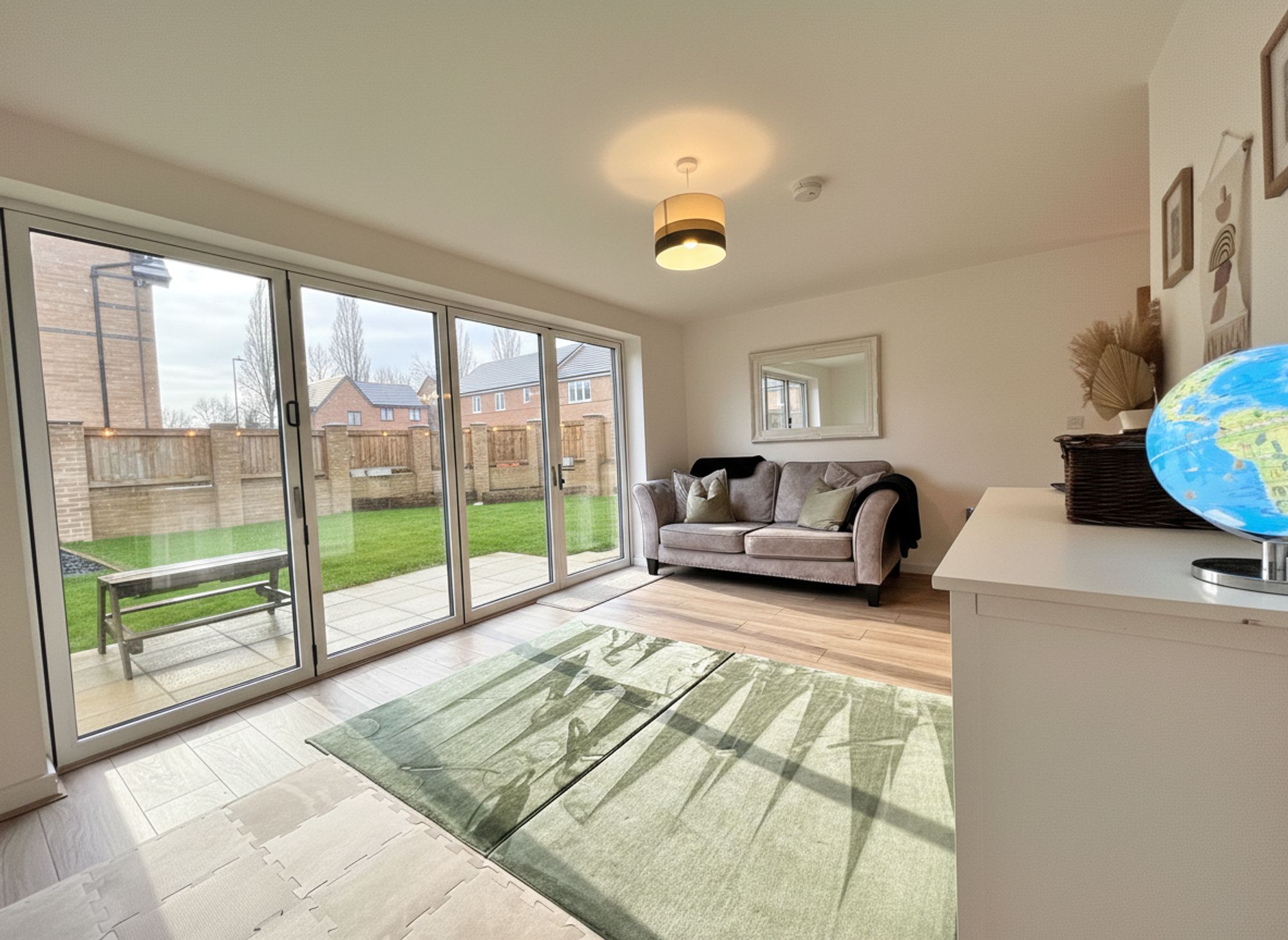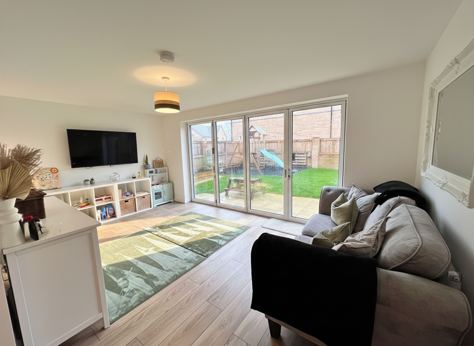 Open-plan to the dining kitchen, this stunning lounge area offers generous proportions and excellent versatility, currently utilised as a playroom but easily adaptable to suit a variety of uses and furniture arrangements. Bi-fold doors open directly onto the rear garden, flooding the space with natural light and enhancing the seamless connection between indoor and outdoor living.