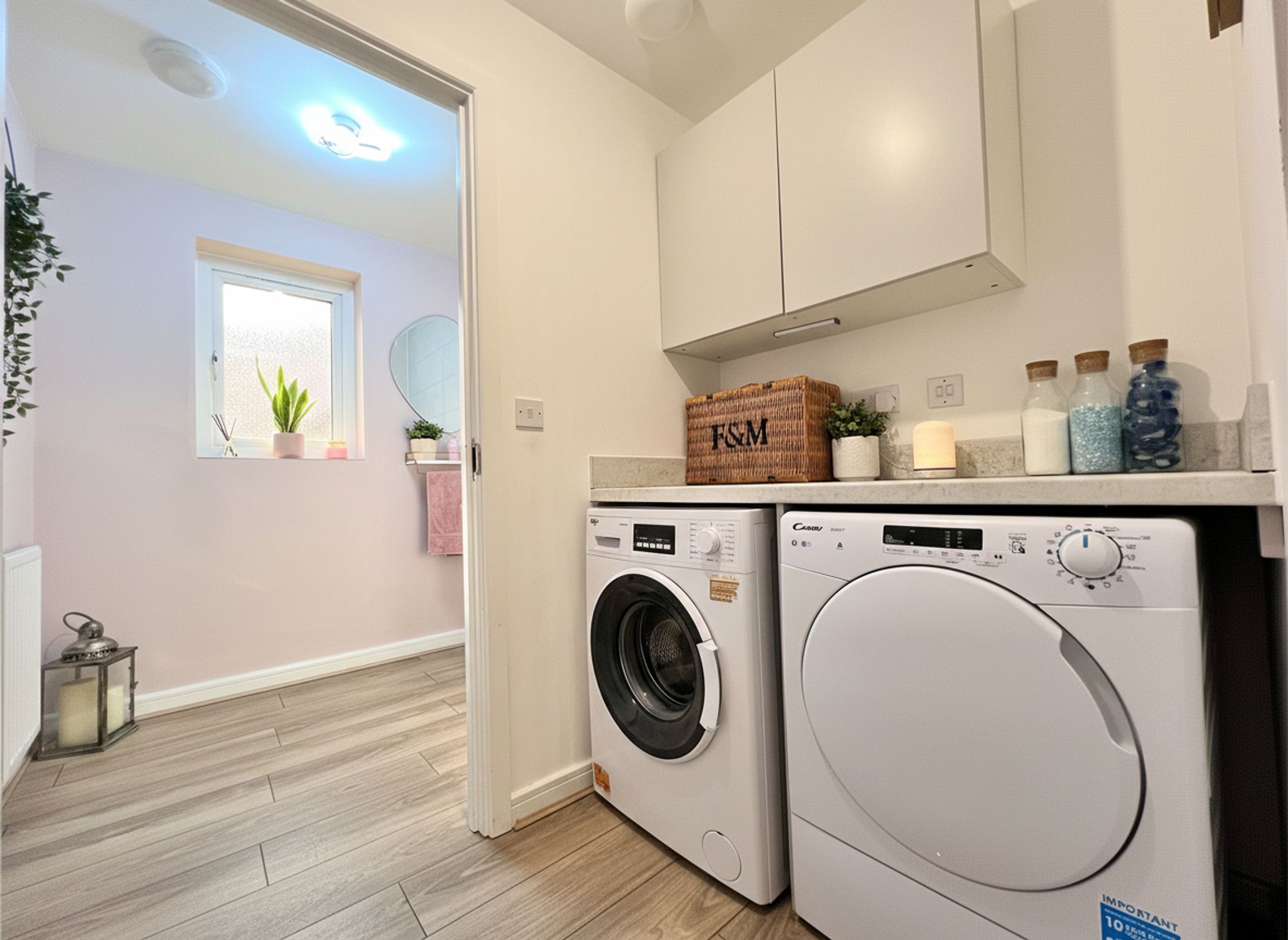 Open plan to the dining kitchen, this useful space benefits from plumbing for a washing machine and provision for a tumble dryer, offering practical functionality while maintaining the home’s seamless design flow.