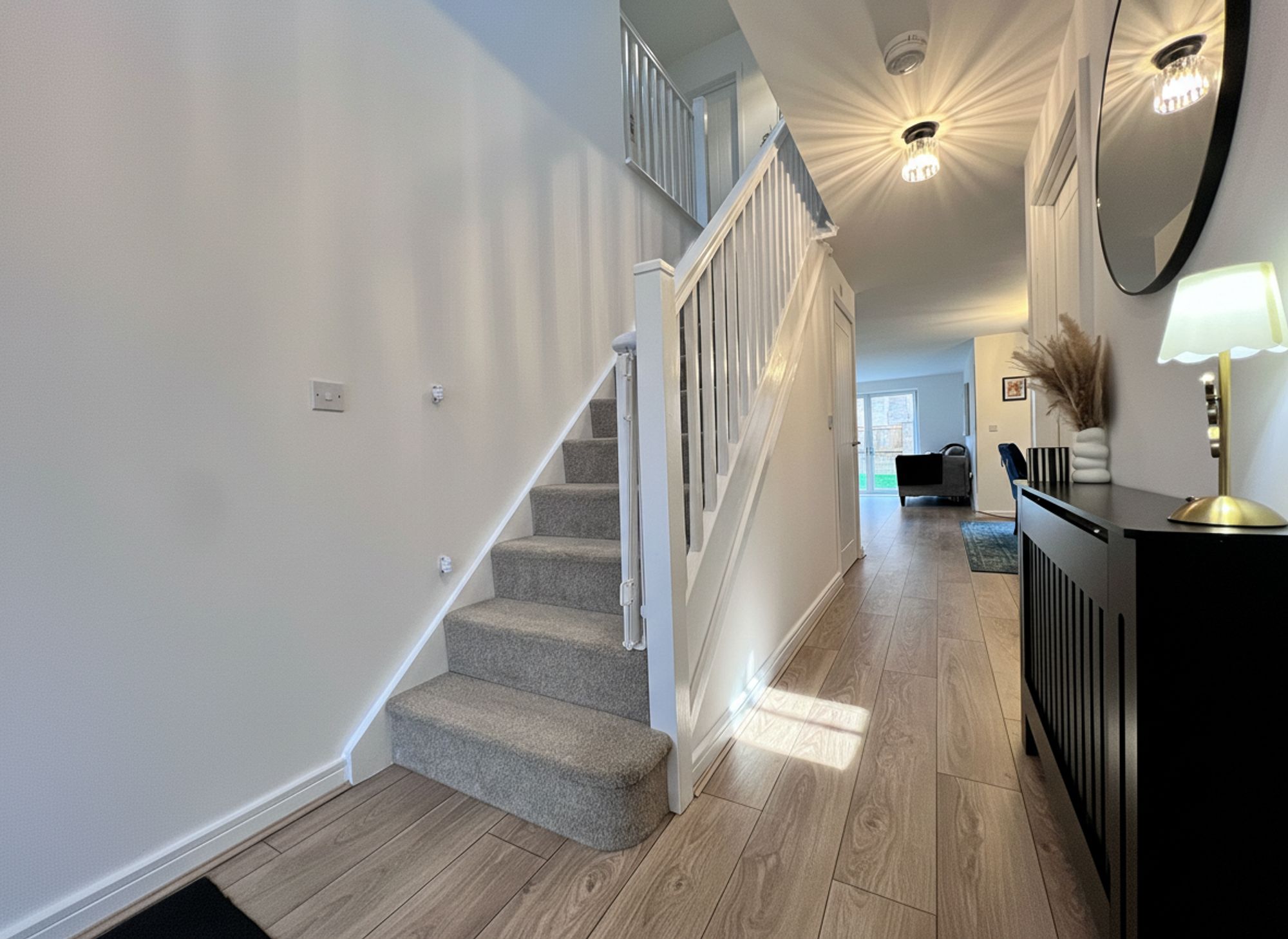 As you step into the light-filled and welcoming hallway, the home’s exceptional interior design and effortless sense of flow are immediately revealed. The staircase rises elegantly to the first floor with a useful storage cupboard beneath, drawing you seamlessly through this impeccably styled residence.