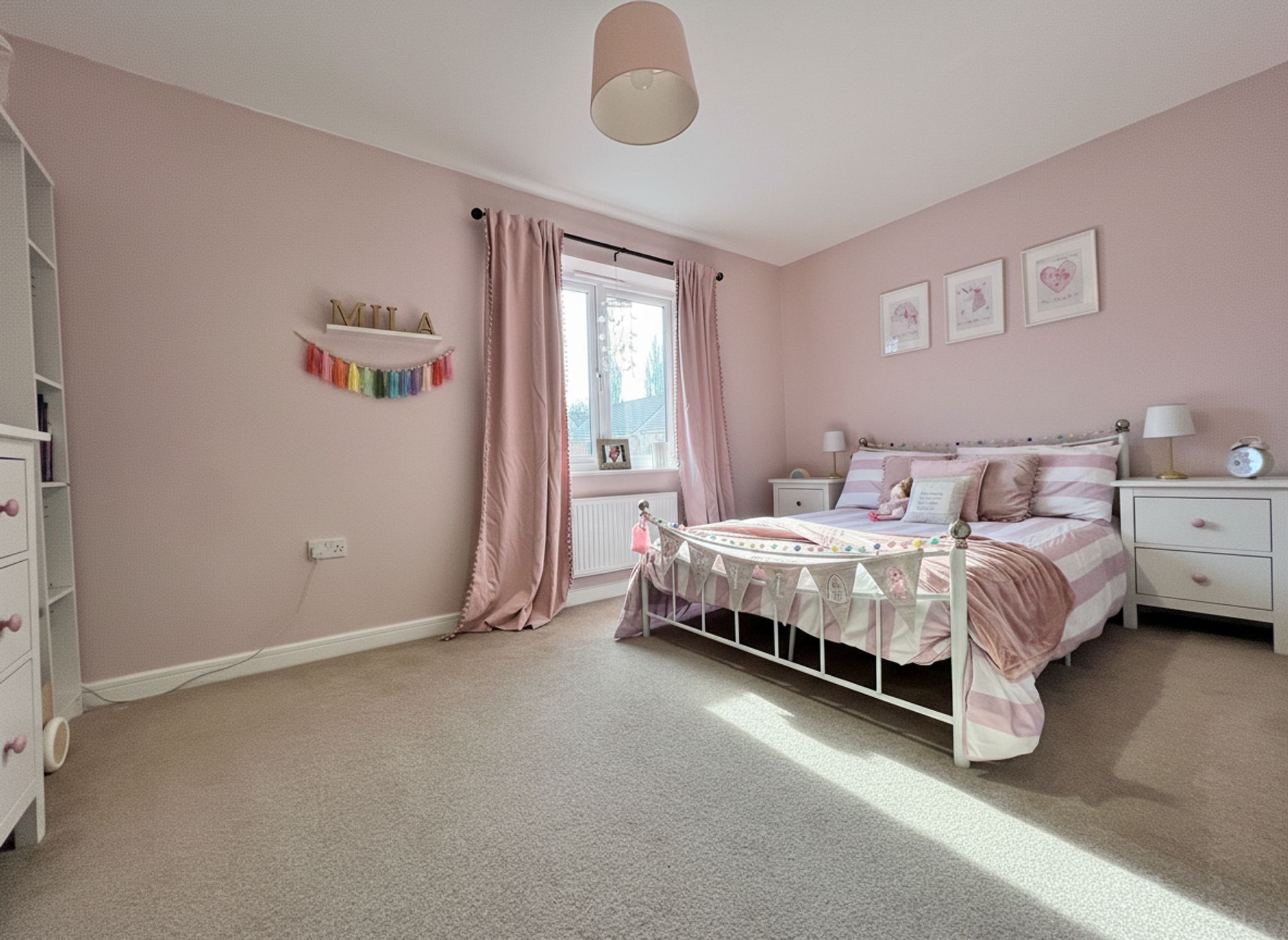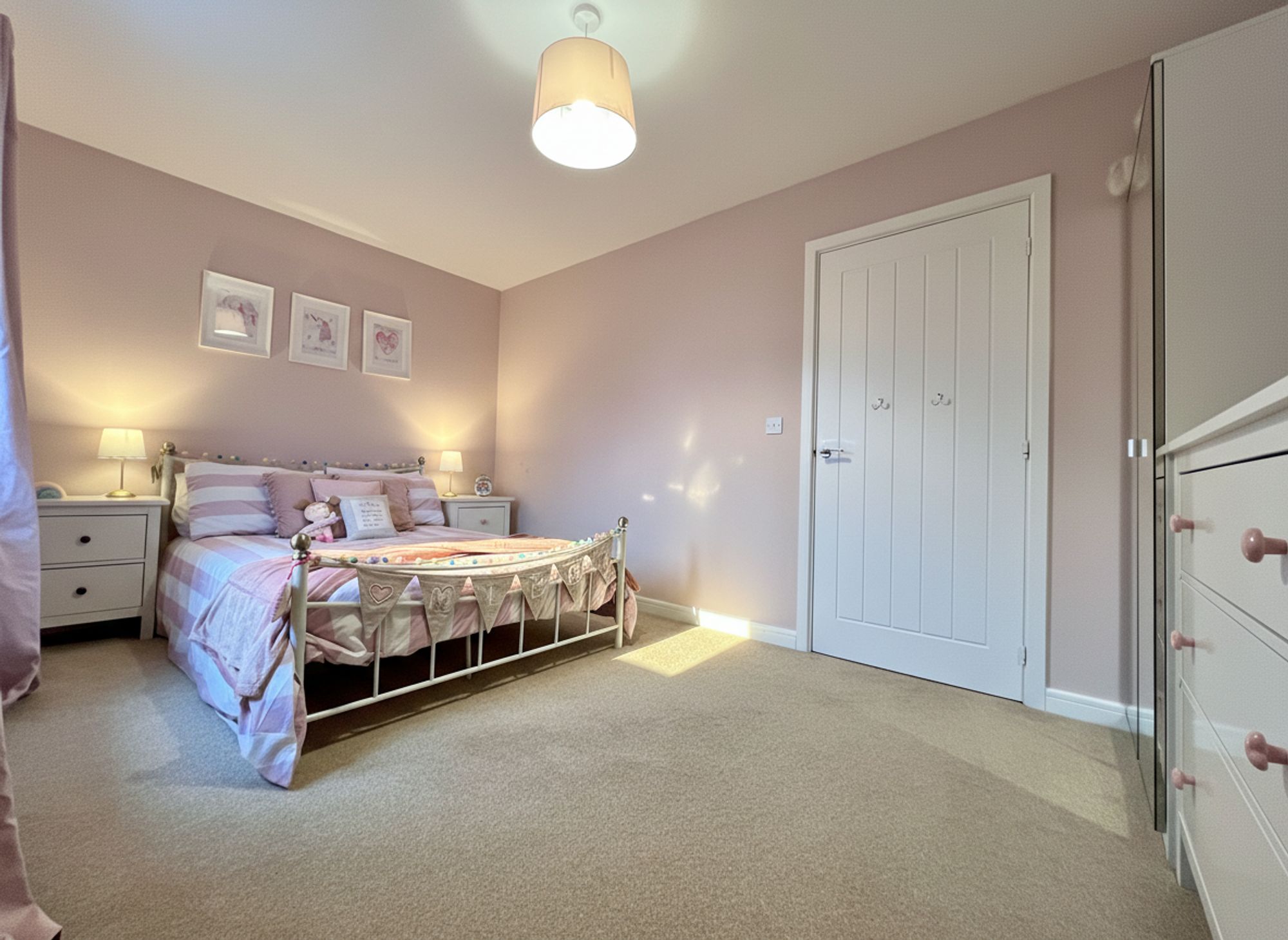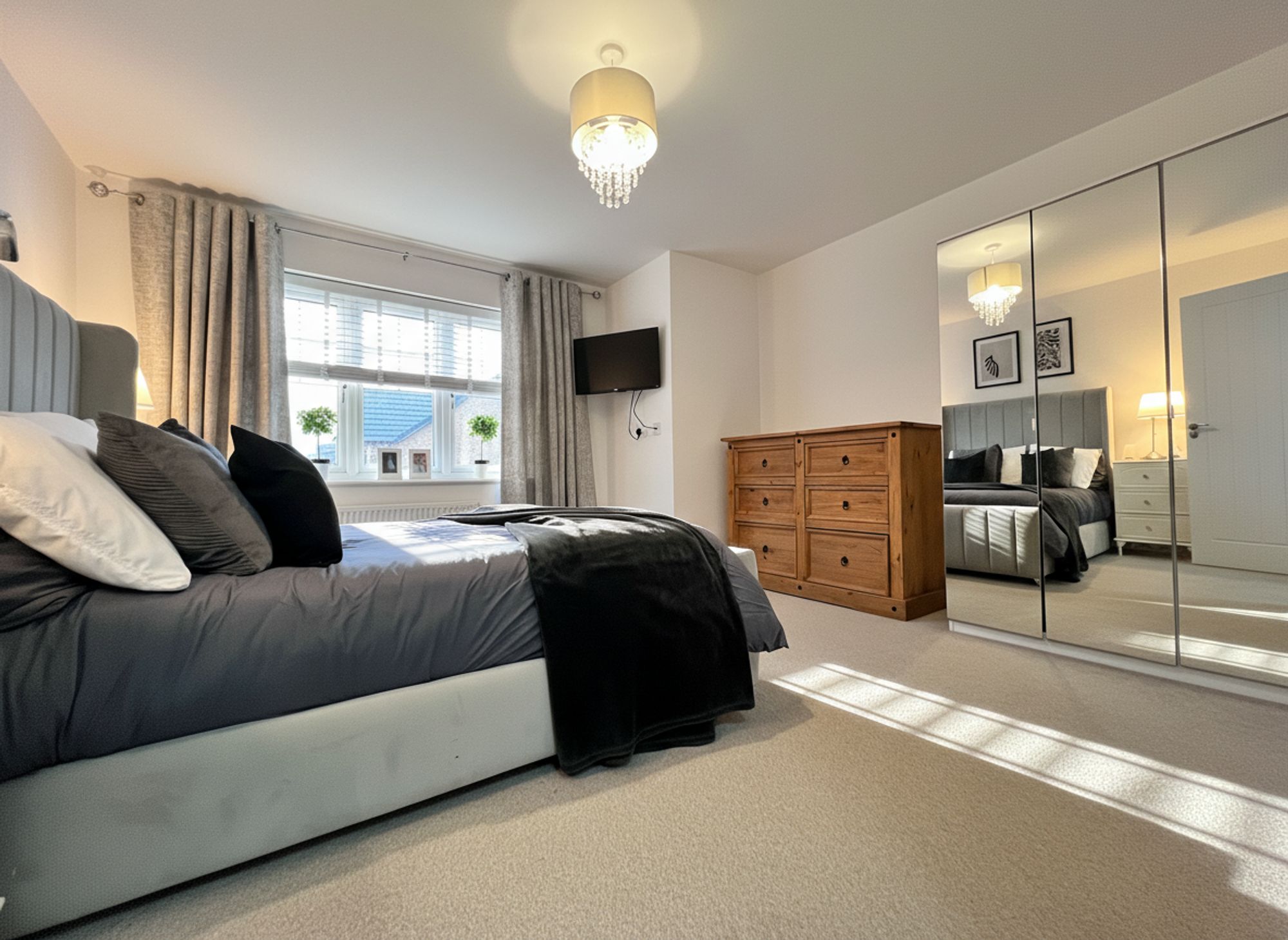 Positioned to the front of the property, this beautifully appointed principal bedroom is styled in soft, calming tones to create a tranquil and restful retreat.