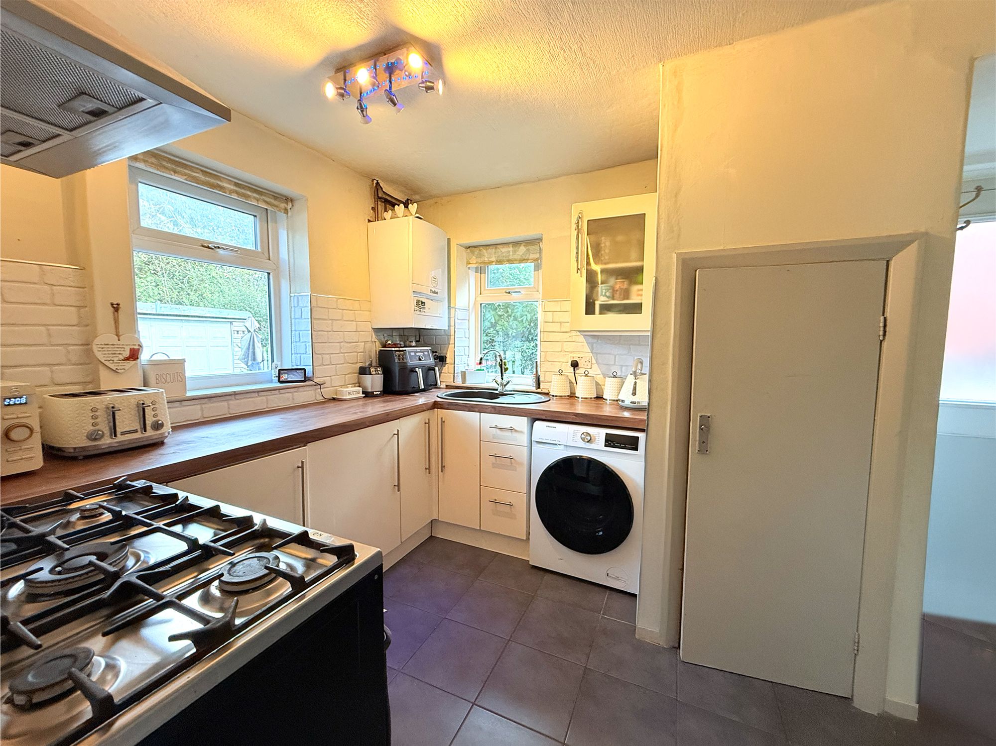 A well-proportioned kitchen featuring a five-ring gas hob and oven, black sink with chrome mixer tap, and designated space for both a full-sized fridge and washing machine. The room is fitted with modern cream gloss cabinets, wood-effect worktops, and a stylish brick-effect splash-back, all complemented by sleek black tiled flooring. An additional storage room provides plumbing for a dishwasher and convenient extra space, while an exterior door gives direct access to the driveway. The boiler is neatly housed above the units, ensuring easy access for maintenance without compromising on usable space.