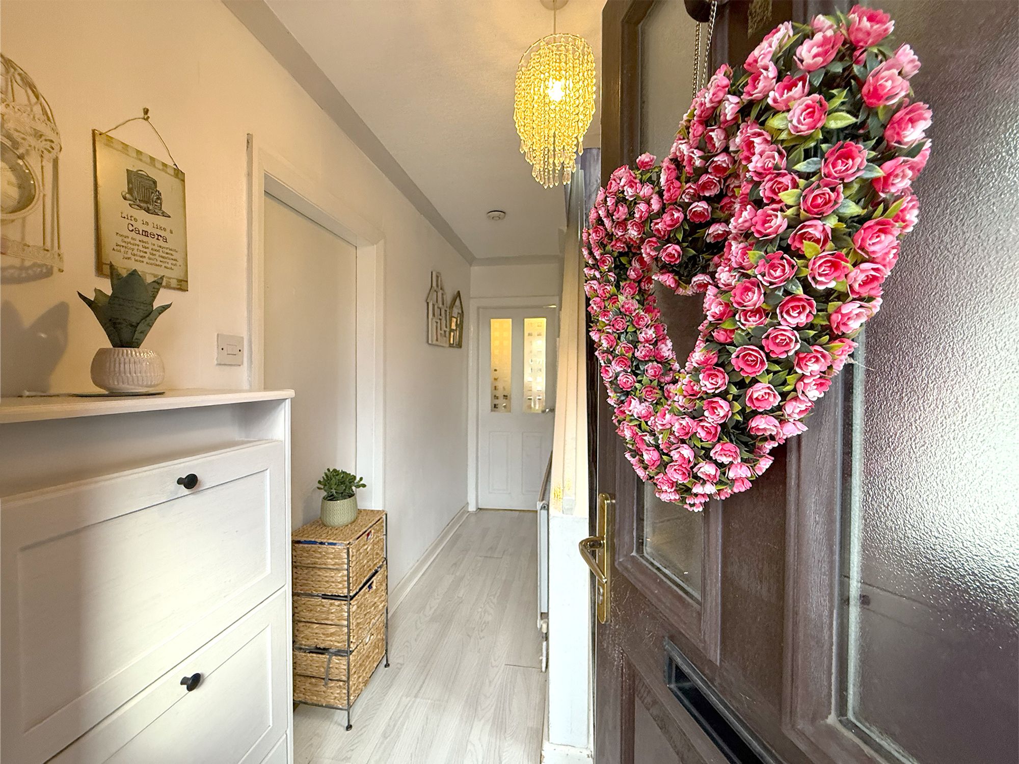 A welcoming entrance hall offering ample space for coats and shoe storage, designed with both practicality and style in mind. The hallway provides access to the kitchen, lounge, and staircase leading to the upper floor. Finished with wood-effect linoleum flooring for durability and easy maintenance, the space is decorated in neutral tones, enhanced by a bold accent wall. Together, these features create a stylish first impression.