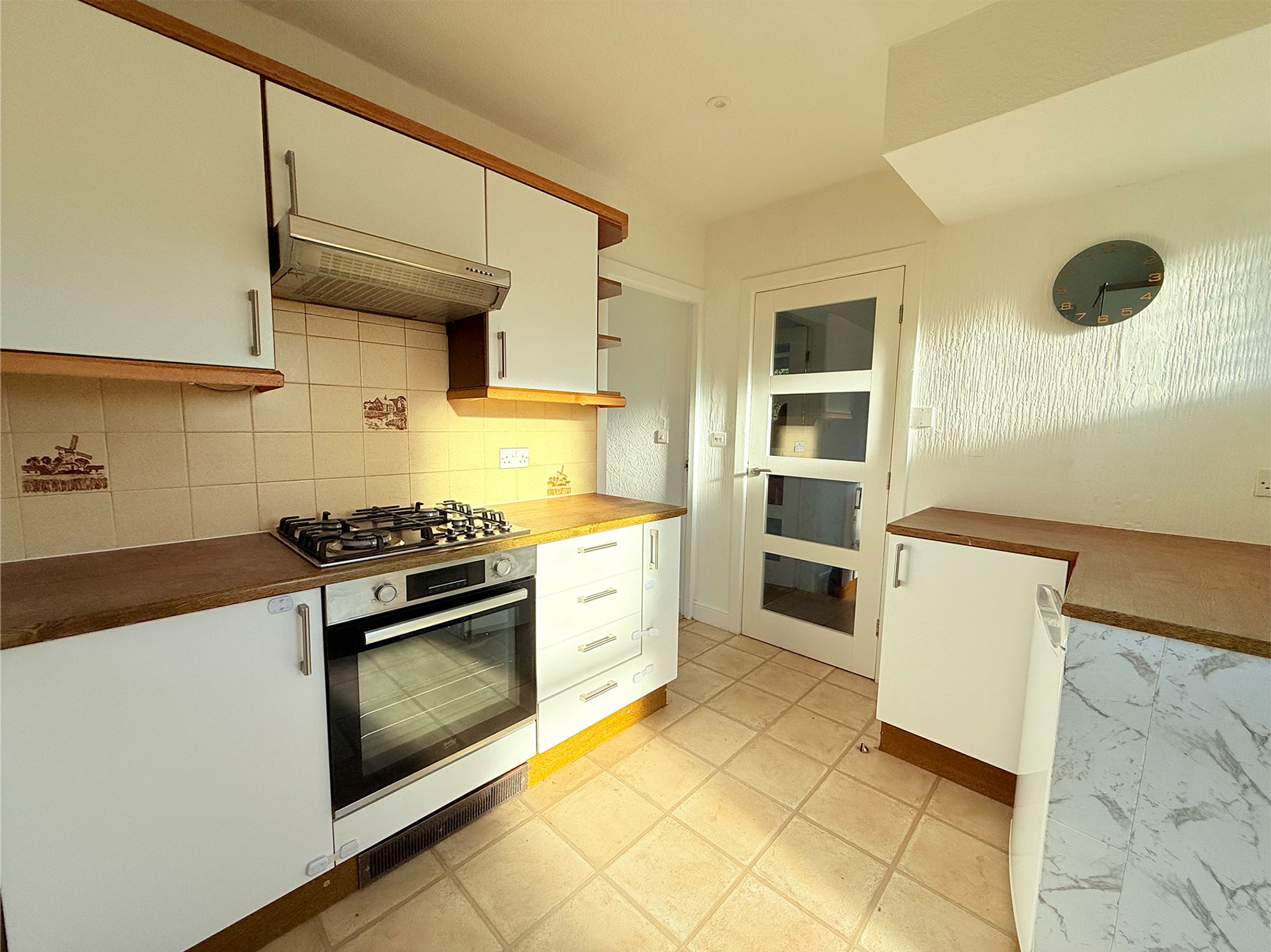 Located to the rear of the property, the kitchen is fitted with modern white cabinetry complemented by wood-effect worktops and practical tiled-effect linoleum flooring. The room is well equipped with a four-ring gas hob, electric oven, and a chrome sink with mixer tap. There is dedicated under-counter space for a washer/dryer, fridge, and freezer, with the current washer/dryer and fridge/freezer available by separate negotiation. Subject to the necessary planning and consents, there is excellent potential to knock through into the adjoining dining room to create a stunning open-plan kitchen diner, with space for bi-fold doors opening onto the patio, ideal for modern family living and entertaining.