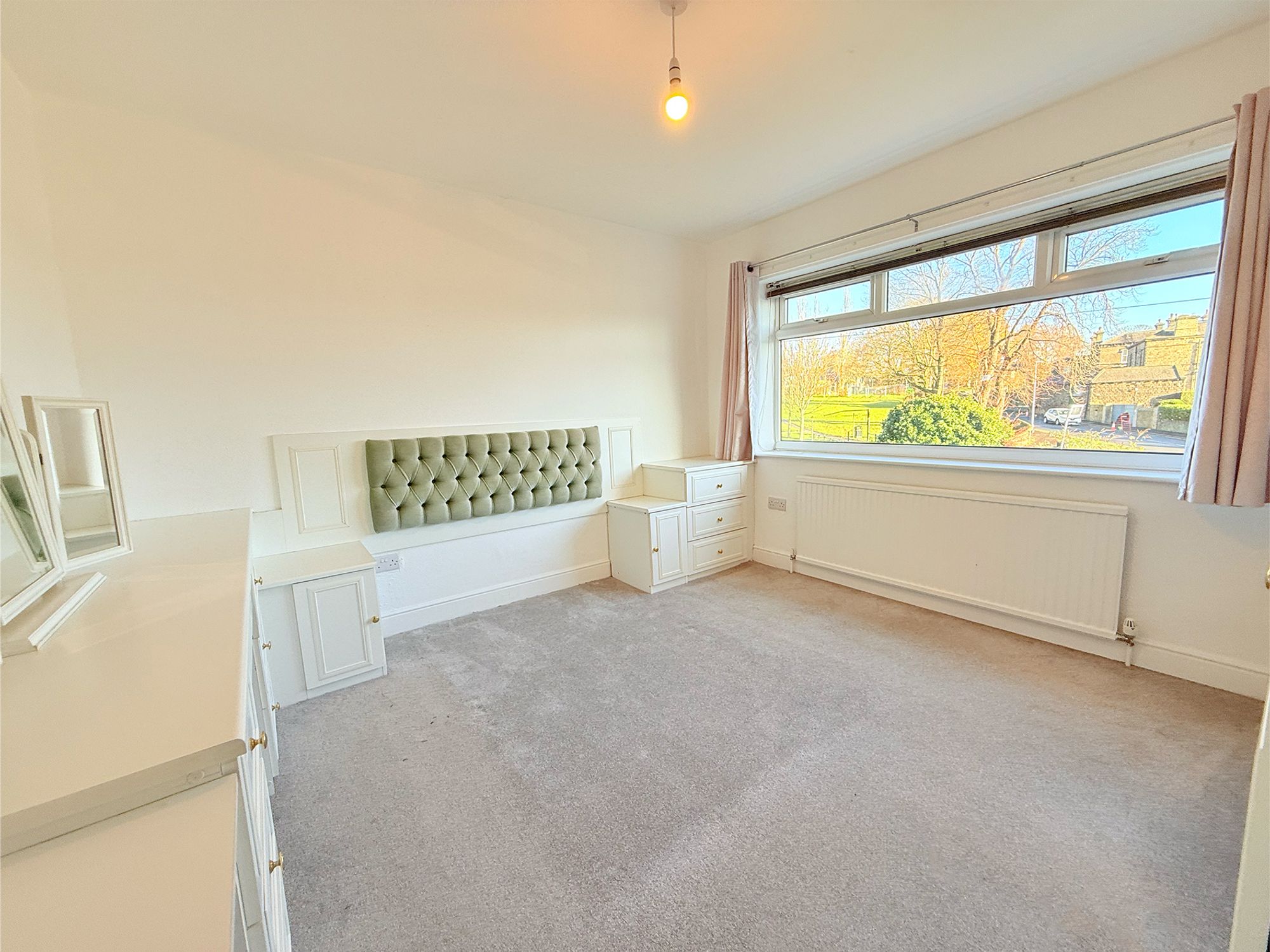 Located to the front of the property, this spacious double bedroom enjoys lovely views over the front garden and across the park. Decorated in neutral tones, the room feels calm and inviting. There is ample space for free-standing furniture, while also benefiting from excellent built-in storage, including floor-to-ceiling fitted wardrobes. A built-in vanity desk with matching bedside units and integrated drawers completes the space, offering a stylish and practical finish.