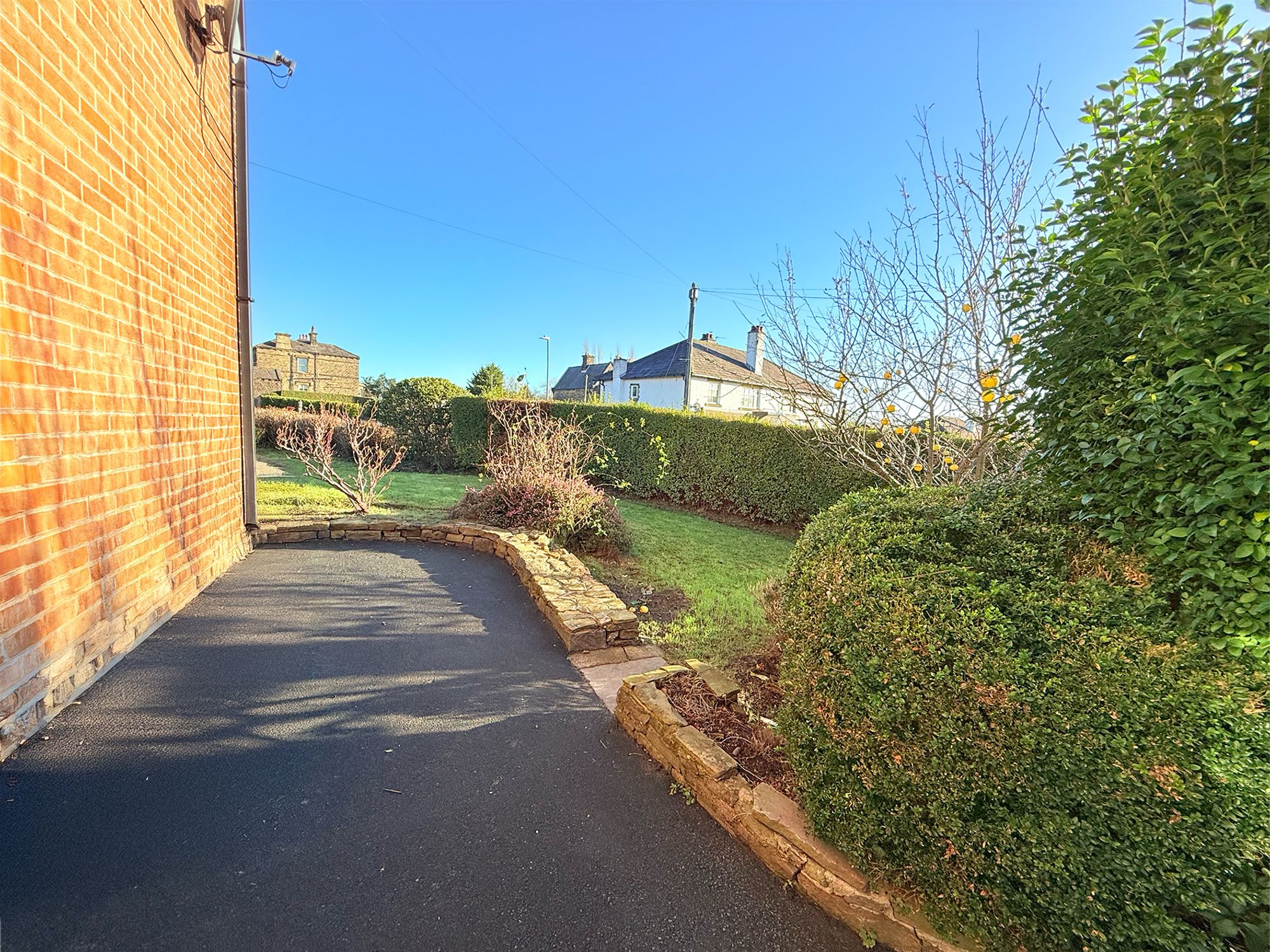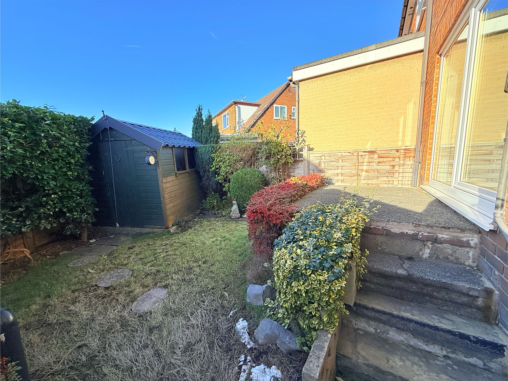 A generous wrap-around garden extending to three sides of the house, bordered by mature hedging that provides a lovely green outlook and added privacy. Well-manicured lawns sweep from the front and down the side of the property, complemented by colourful planted borders and an established apple tree. The garden is secured by a wrought-iron gate leading to the driveway, with additional wrought-iron gates opening through to the enclosed rear garden. To the rear, wooden fencing creates a private outdoor haven, featuring a raised stone patio accessed directly from the dining room, perfect for alfresco dining and socialising. Stone stepping stones lead onwards to a useful garden shed, adding practical storage to this attractive and versatile outdoor space.