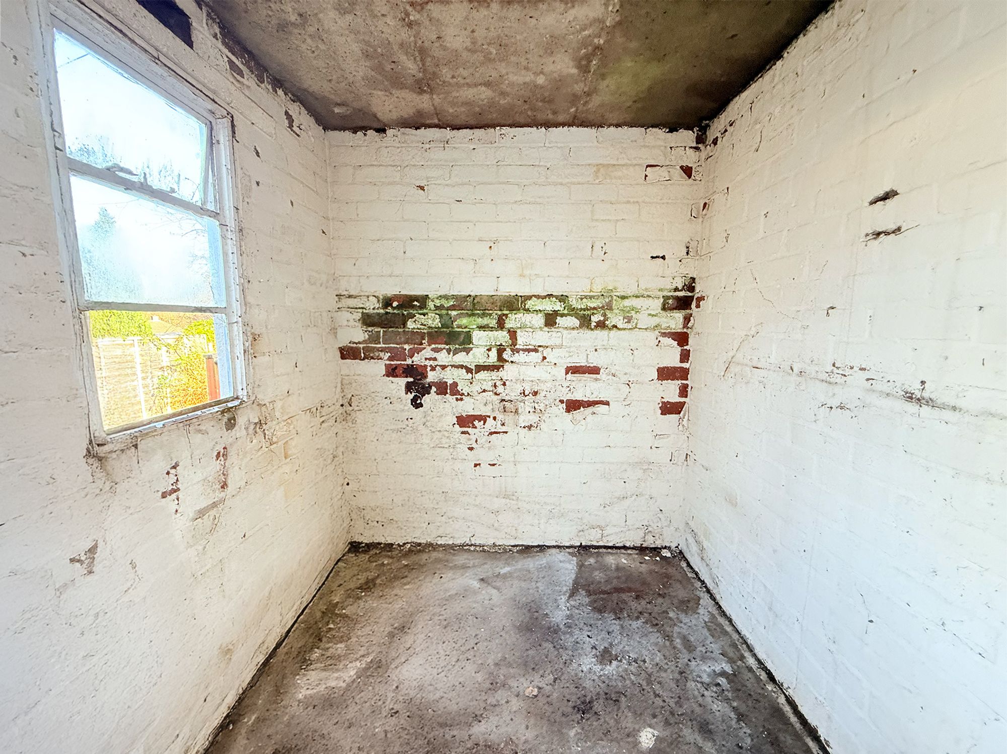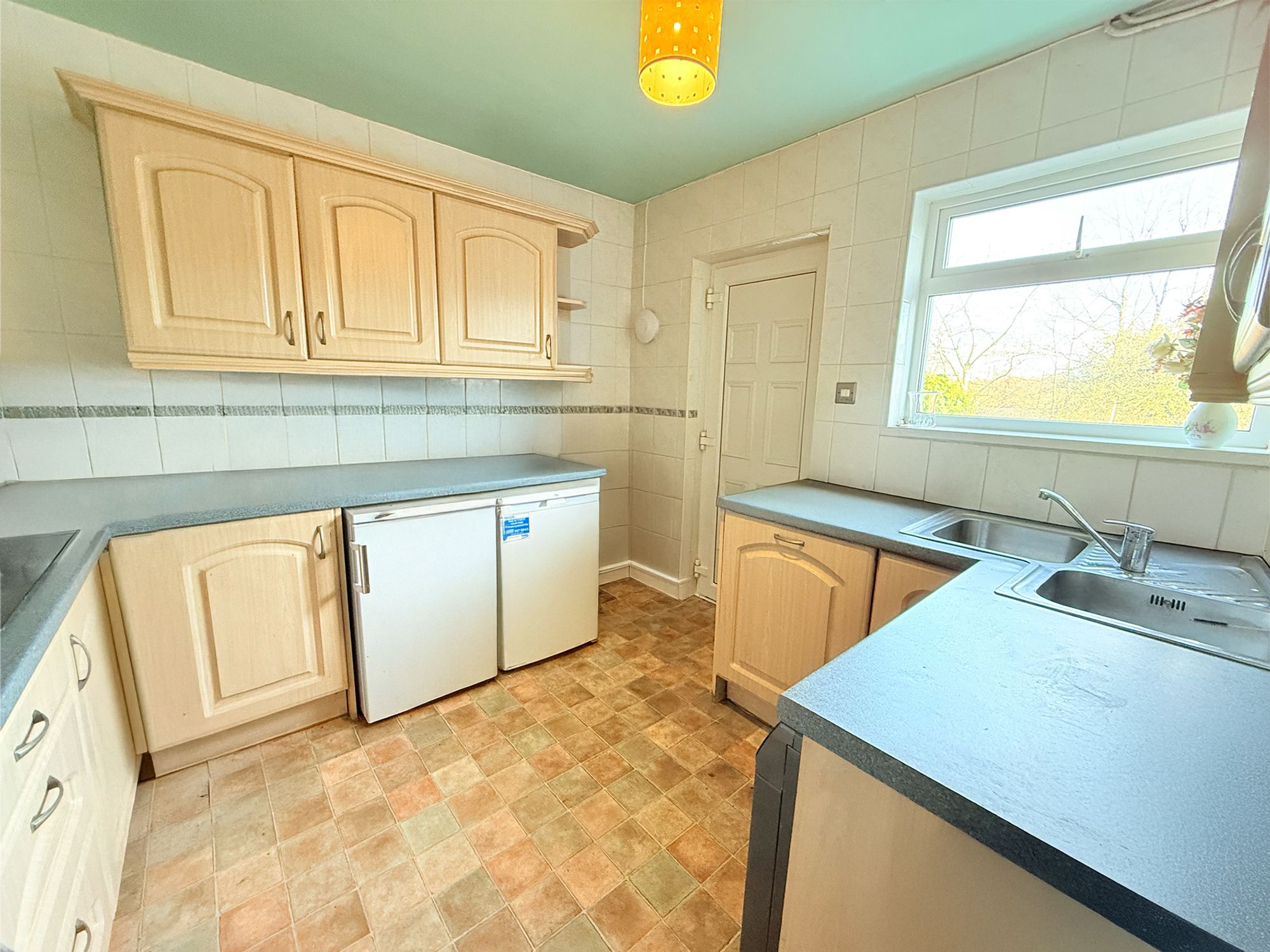 Located to the rear of the property with views over the garden, the kitchen is fitted with wood-effect cabinetry complemented by contrasting worktops and tile-effect linoleum flooring. The space is equipped with an electric oven, four-ring hob, and twin chrome sinks with mixer tap, along with dedicated space for a washing machine and under-counter fridge and freezer. An external door opens directly onto the rear garden decking, making this an ideal space for indoor-outdoor living. The boiler is neatly housed within a kitchen cupboard above the worktop. The kitchen also offers excellent scope for extension into the garden (subject to the necessary consents), allowing for the creation of a striking single-storey extension with Velux windows and an open-plan kitchen, dining, and living area overlooking the garden.