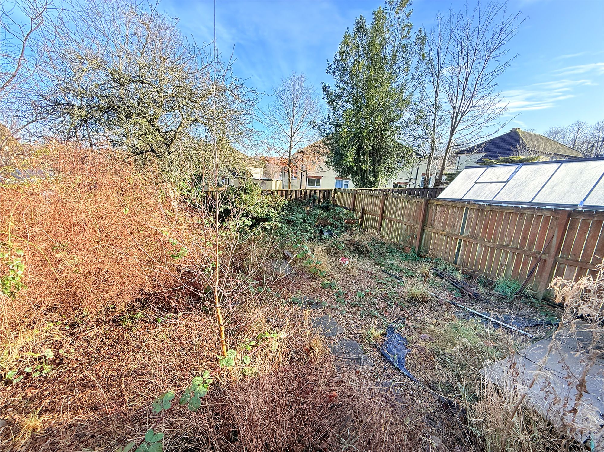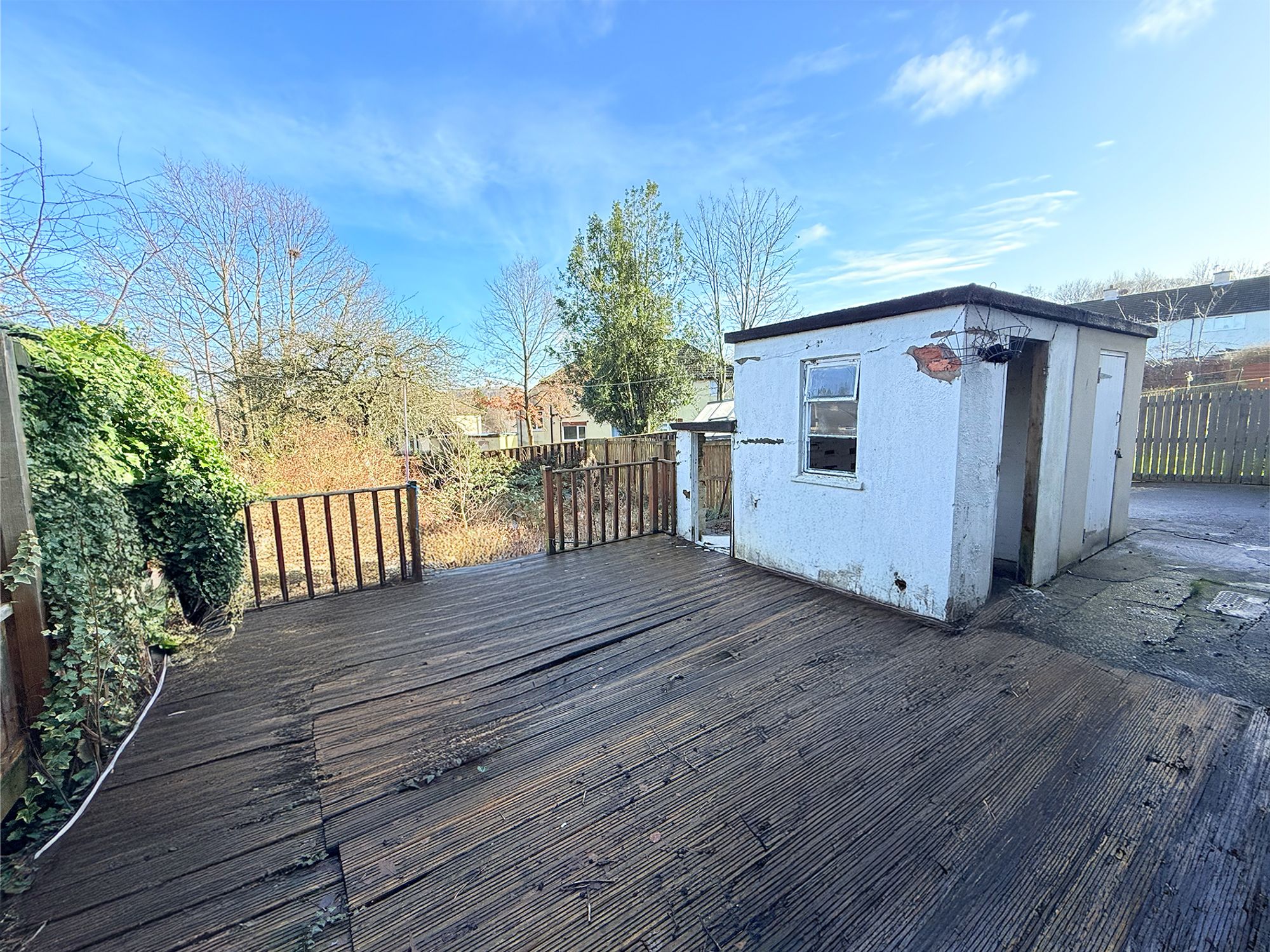 The spacious rear garden can be accessed via the kitchen or a convenient side passage from the front of the property. The garden features a decking area (in need of repair) which leads down to a lower-level garden with a pebbled lawn area and established plant beds. The space further benefits from a stone-built shed, along with an additional storage area to the rear, ideal for outdoor equipment and garden tools.