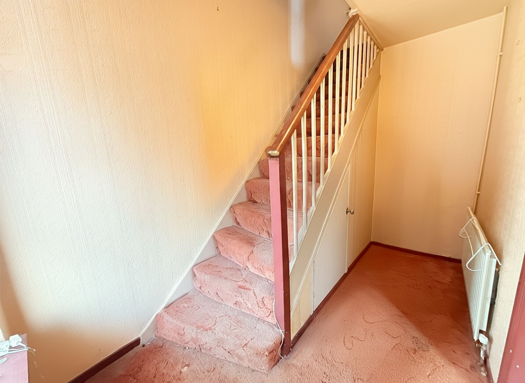 A large and welcoming entrance hall providing access to the living room and first floor. The space offers ample room for shoe and coat storage and further benefits from a convenient understairs storage cupboard, ideal for keeping the hallway neat and clutter-free.