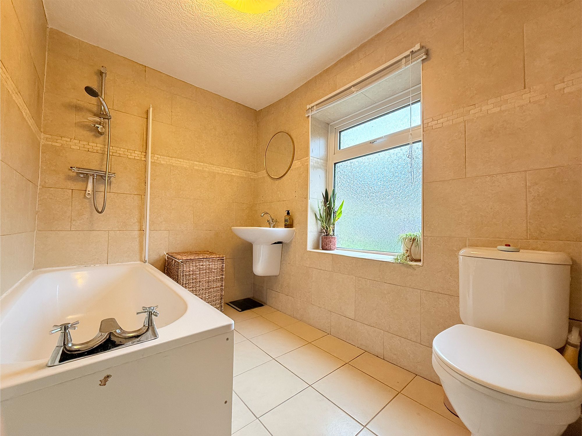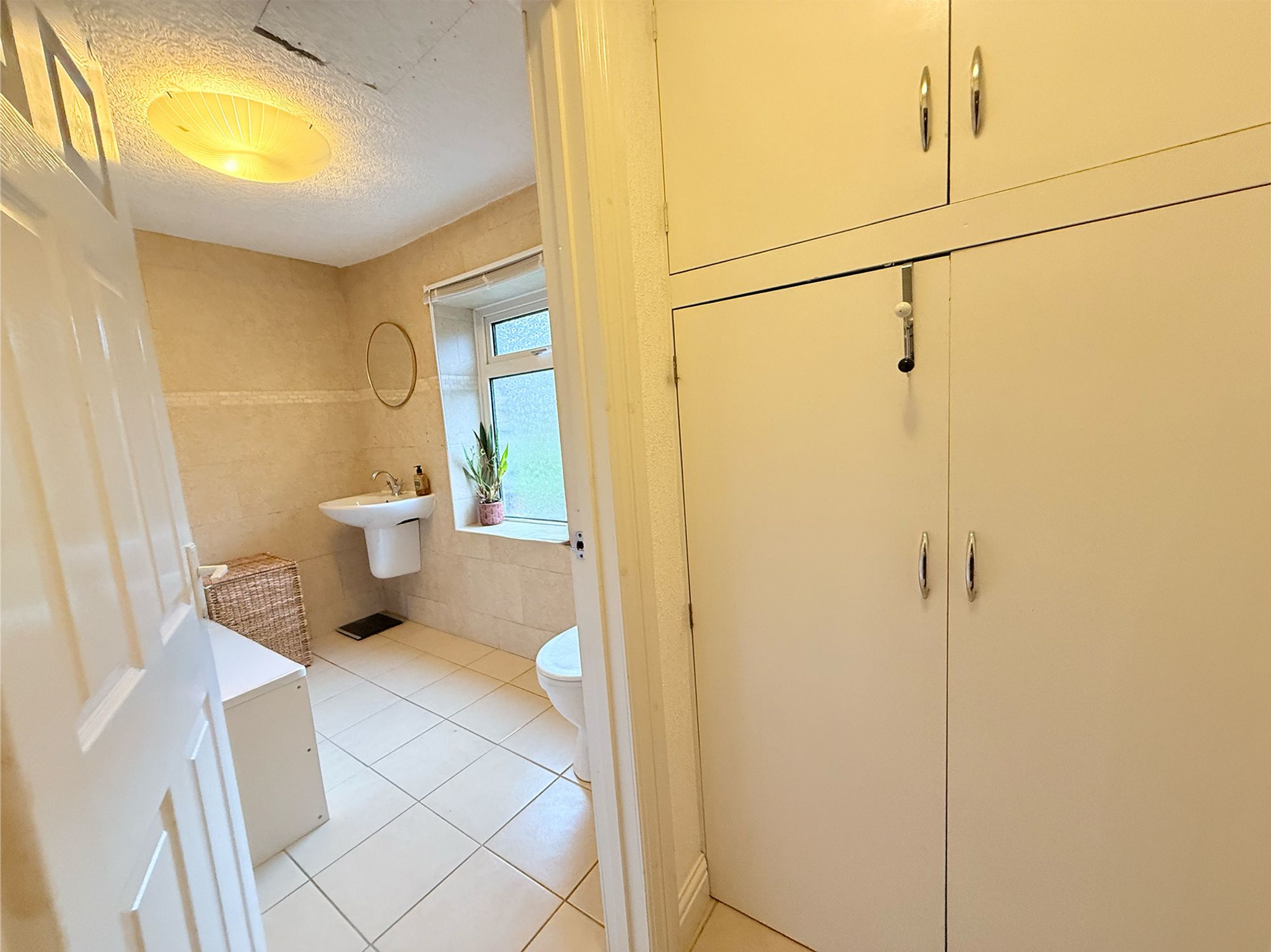 Located on the ground floor, this spacious family bathroom is finished with neutral tiling to both the floors and walls. Upon entry, there is floor-to-ceiling fitted storage which currently houses the washing machine but is also ideal for use as a linen cupboard or for toiletries. The bathroom is fitted with a full-sized bath featuring a chrome mixer tap and shower over with handheld attachment, a WC, and a wash hand basin with chrome mixer tap. A tall heated towel rail completes the space.