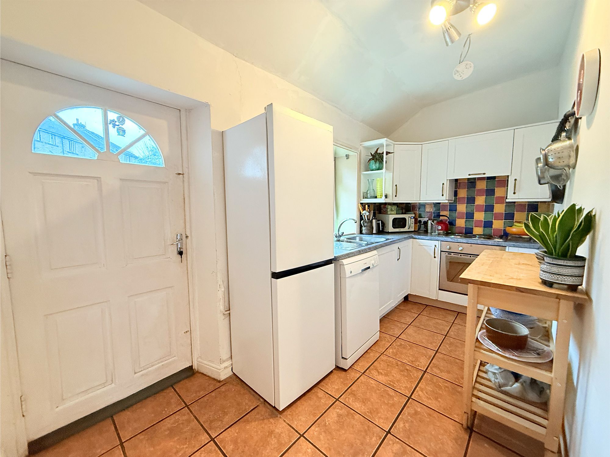 Located to the rear of the property, the kitchen enjoys pleasant views over the rear garden. The space is fitted with shaker-style units complemented by contrasting worktops, bold tiled splashbacks, and tiled flooring. Appliances include an electric oven with four-ring electric hob, along with a chrome sink featuring a mixer tap. There is designated space for a washing machine or tumble dryer, as well as ample room for a freestanding fridge freezer. An understairs cupboard provides valuable storage and could easily be converted into a pantry or used for shoe and coat storage. A rear door offers direct access into the garden, making it ideal for indoor-outdoor living.
