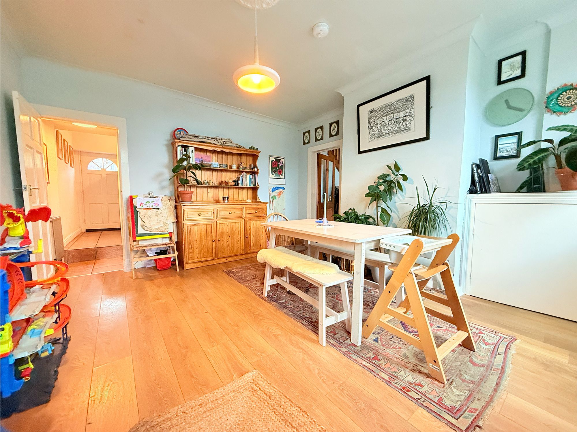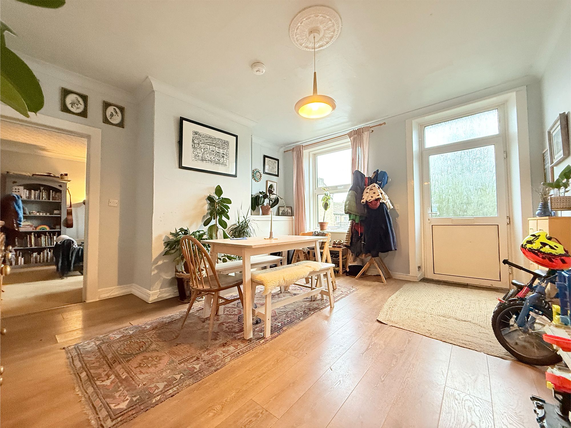 Located to the front of the property, this spacious dining room benefits from dual aspect windows, flooding the room with natural light. The space features a built-in shoe storage area by the front door along with an additional built in unit providing excellent storage. Neutrally decorated and finished with wood-effect laminate flooring, the room offers ample space for a full family dining suite as well as additional furniture. The dining room provides access to both the living room and the kitchen.