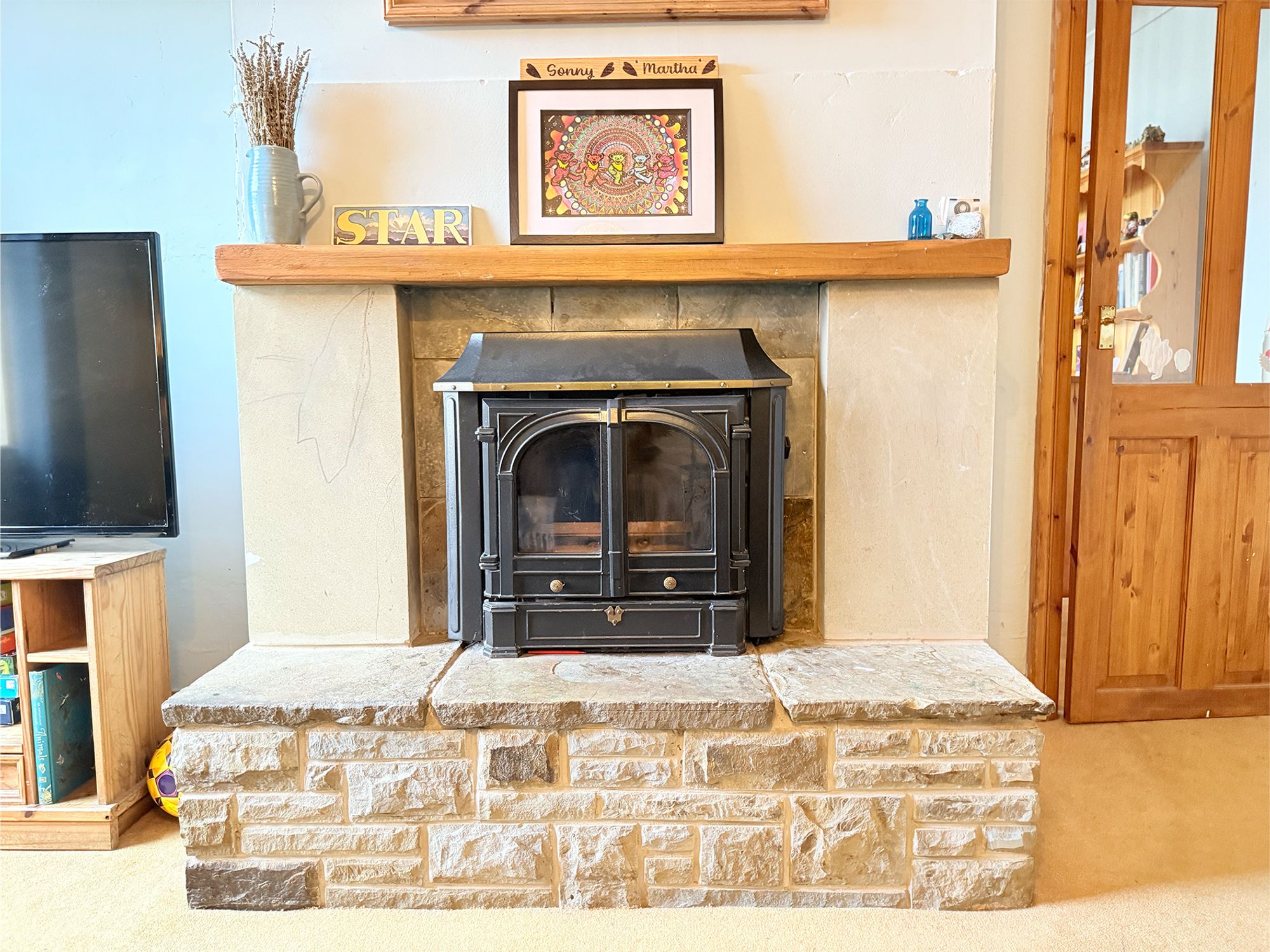 A spacious living room located to the front of the property, offering ample space for a variety of family seating arrangements. Neutrally decorated throughout, the room is enhanced by a striking wooden staircase that creates a feature focal point, alongside a stone fireplace fitted with a wood burning stove. This space offers access to the upper floor and the bathroom.