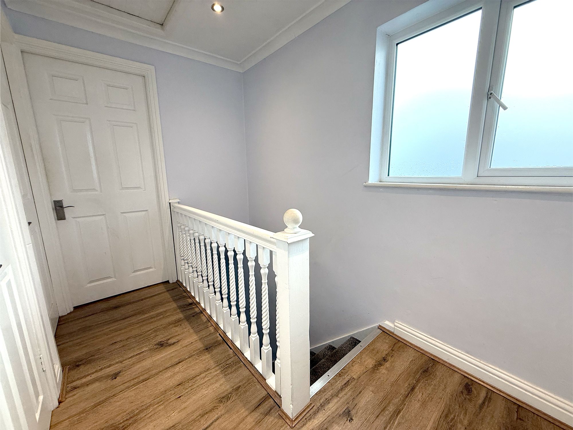 A bright and airy landing finished in neutral tones with wood-effect laminate flooring, creating a clean and cohesive feel. It provides access to all bedrooms and the family bathroom, while also benefiting from a useful built-in storage cupboard. The landing further offers access to the loft via a hatch, adding to the home’s practical storage options.