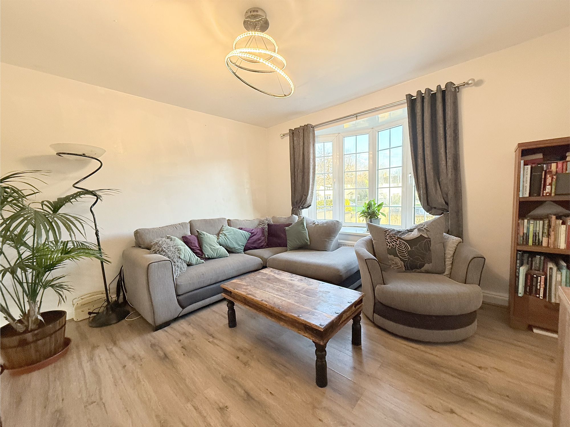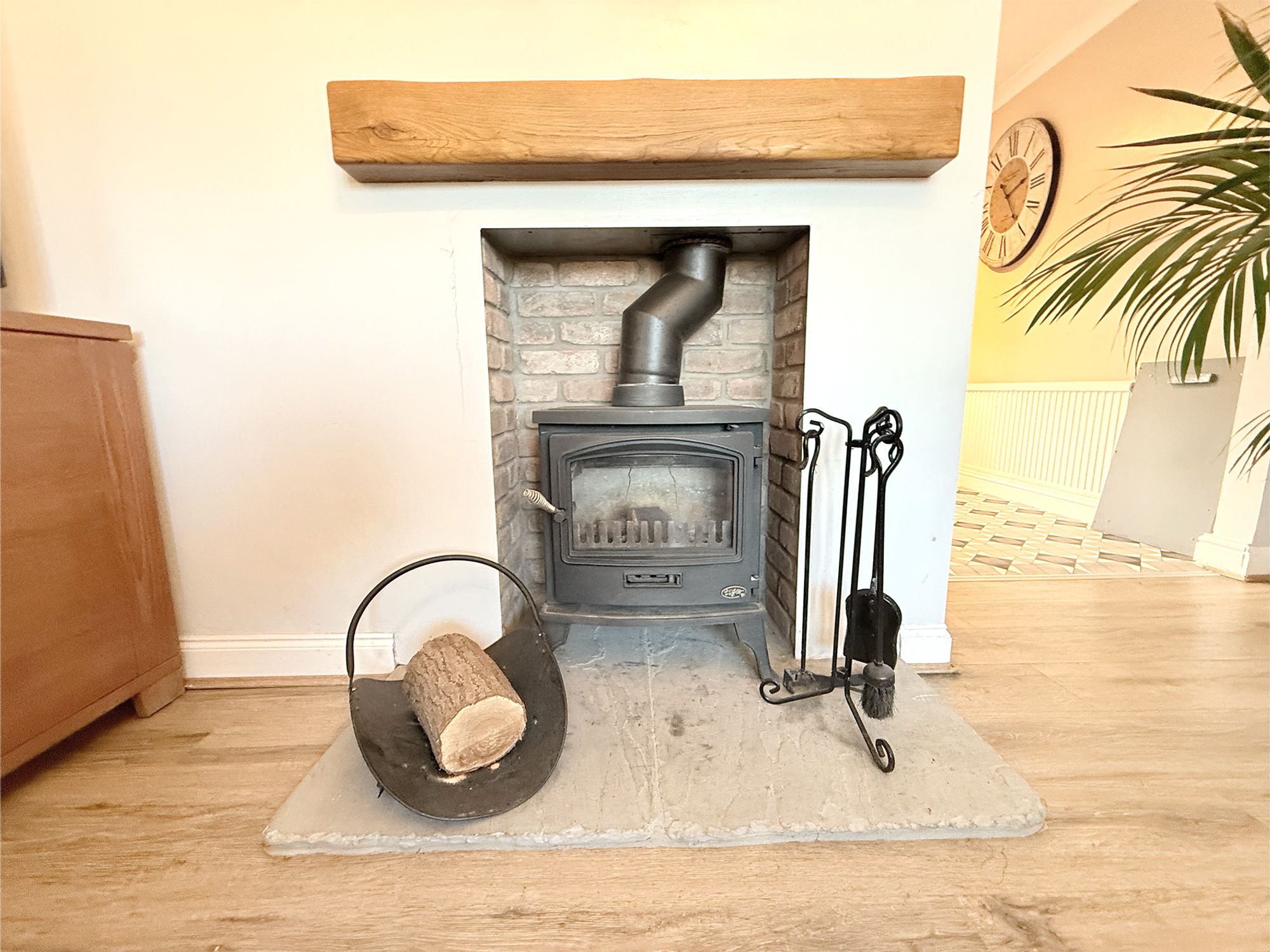 Located to the front of the property, this well-proportioned living room offers a warm and inviting space for everyday family life. Finished with wood-effect laminate flooring and neutral décor, it provides ample room for free-standing furniture and a variety of seating arrangements. A large bay window floods the room with natural light, enhancing the bright and airy feel. The focal point is a newly fitted wood burner, beautifully set within an exposed brick fireplace with a wood-style surround, adding character and cosy charm.