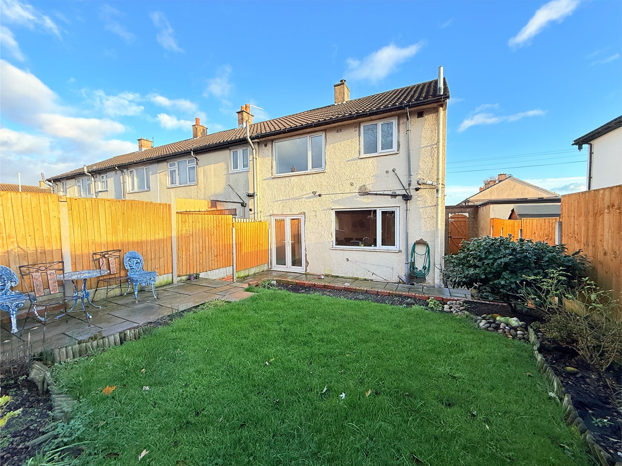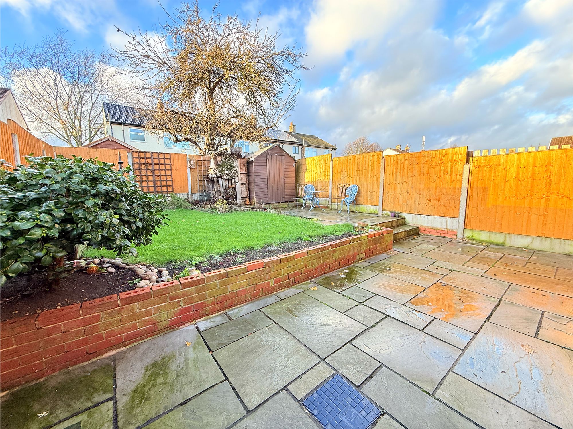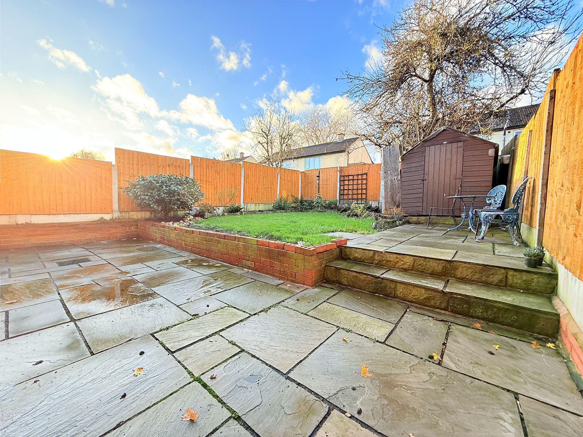 Accessed via French doors from the kitchen, the rear garden opens onto a stone-flagged patio, perfect for alfresco dining and entertaining. Beyond, there is a raised, grassed lawn and a second paved seating area, bordered by well-stocked flower beds. A large shed provides excellent storage, and side access leads to a gated pathway connecting to the driveway for added convenience. The space is further enhanced by newly fitted sensor lights.