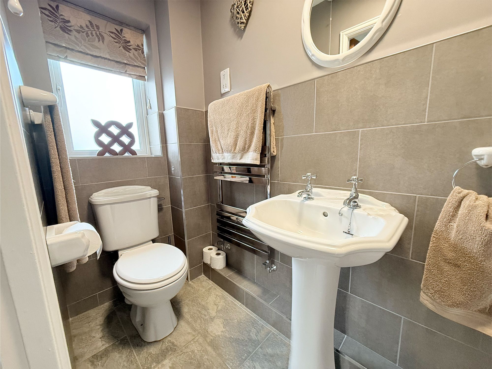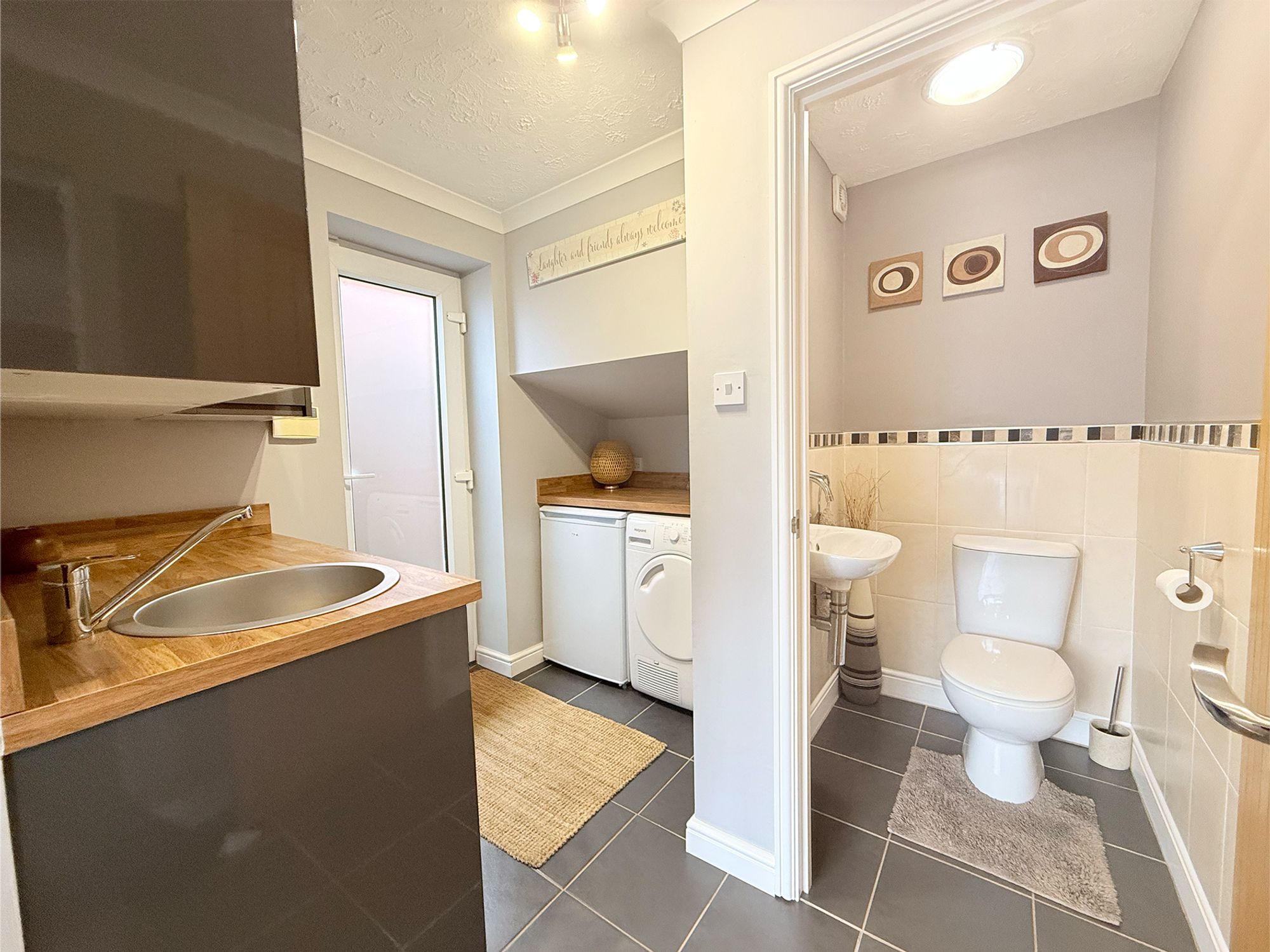 Accessed from the utility, the WC is fitted with a wash basin complete with chrome mixer tap. Finished with neutral tiling in a mid-height design and matching flooring to the utility, this space maintains a clean and cohesive style throughout the home.