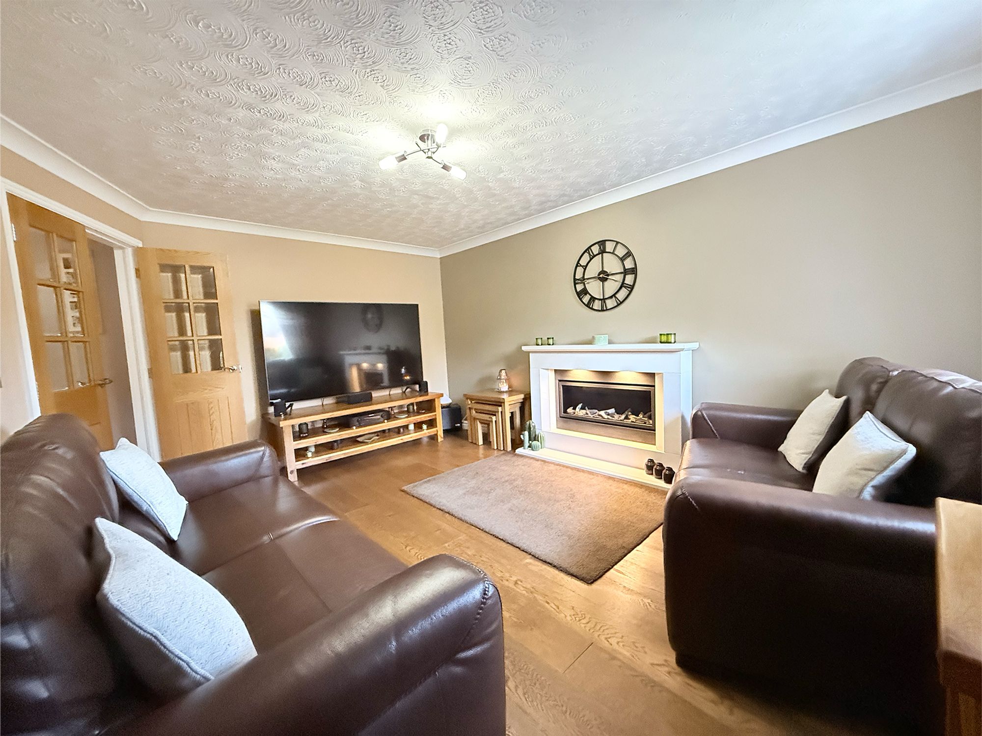 Positioned to the front of the property, the spacious lounge offers an inviting setting for family living. A modern log-effect fireplace with a white surround creates a stylish focal point, while the neutral décor and wood-effect flooring enhance the light and airy feel of the room. With ample space to accommodate a variety of seating arrangements, this is the perfect area for relaxation and family entertainment.