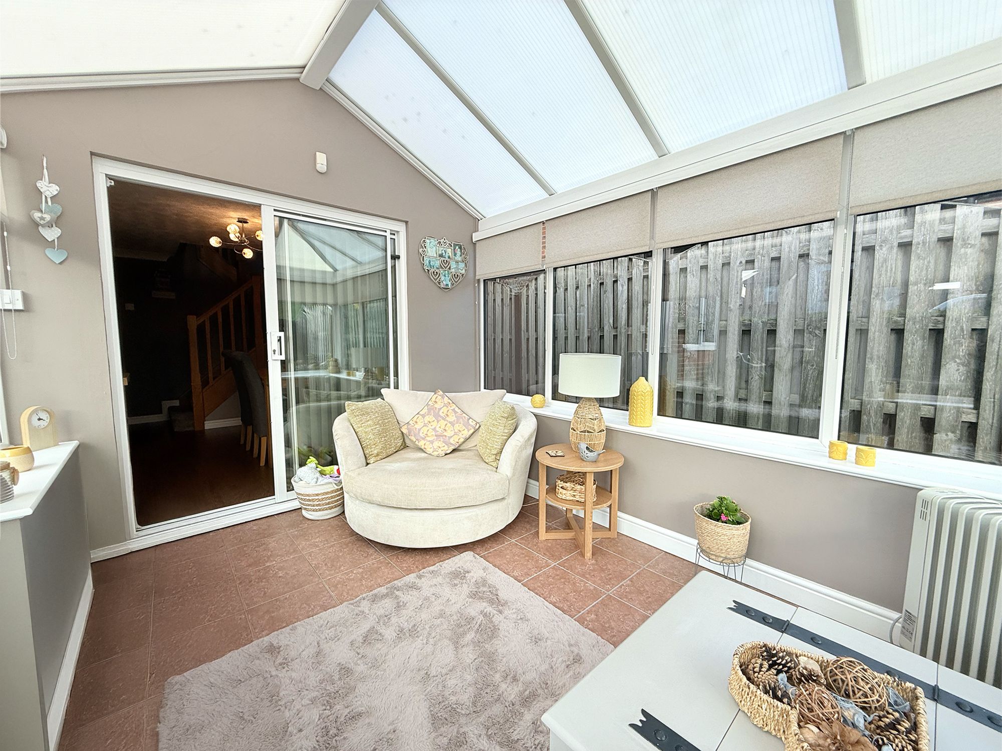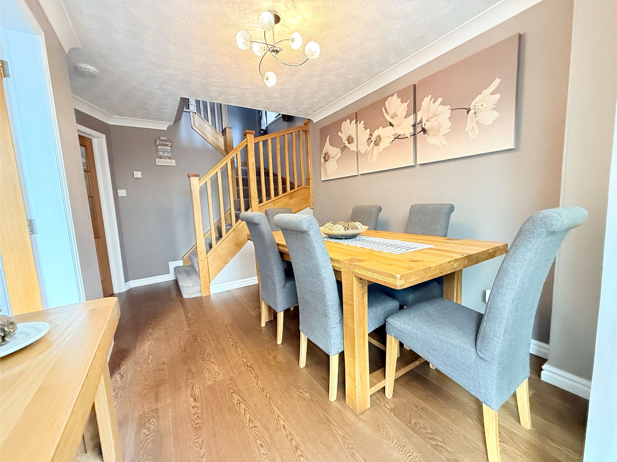 Centrally positioned with access to the lounge, conservatory, kitchen, and upper floor, the dining room serves as a practical and welcoming hub of the home. Benefitting from useful under-stair storage, the room is neutrally presented and finished with the same wood-effect flooring as the lounge, ensuring a seamless flow between spaces. Double doors lead from the lounge, while sliding doors open into the conservatory, enhancing the sense of light and connectivity. With ample room for a full-sized family dining suite, this versatile space is ideal for both everyday living and entertaining.