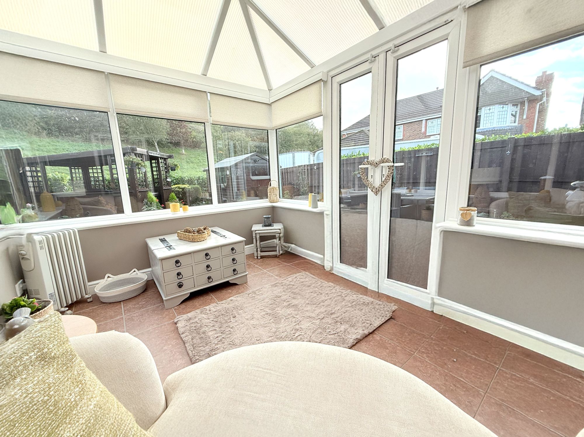 A bright and airy conservatory with windows to three sides, allowing natural light to flood the home while offering peaceful views of the garden. Finished in neutral tones with tiled flooring, this versatile space is perfect for relaxing or entertaining. French doors open directly onto the patio, seamlessly extending the living space into the garden for a true indoor–outdoor lifestyle.