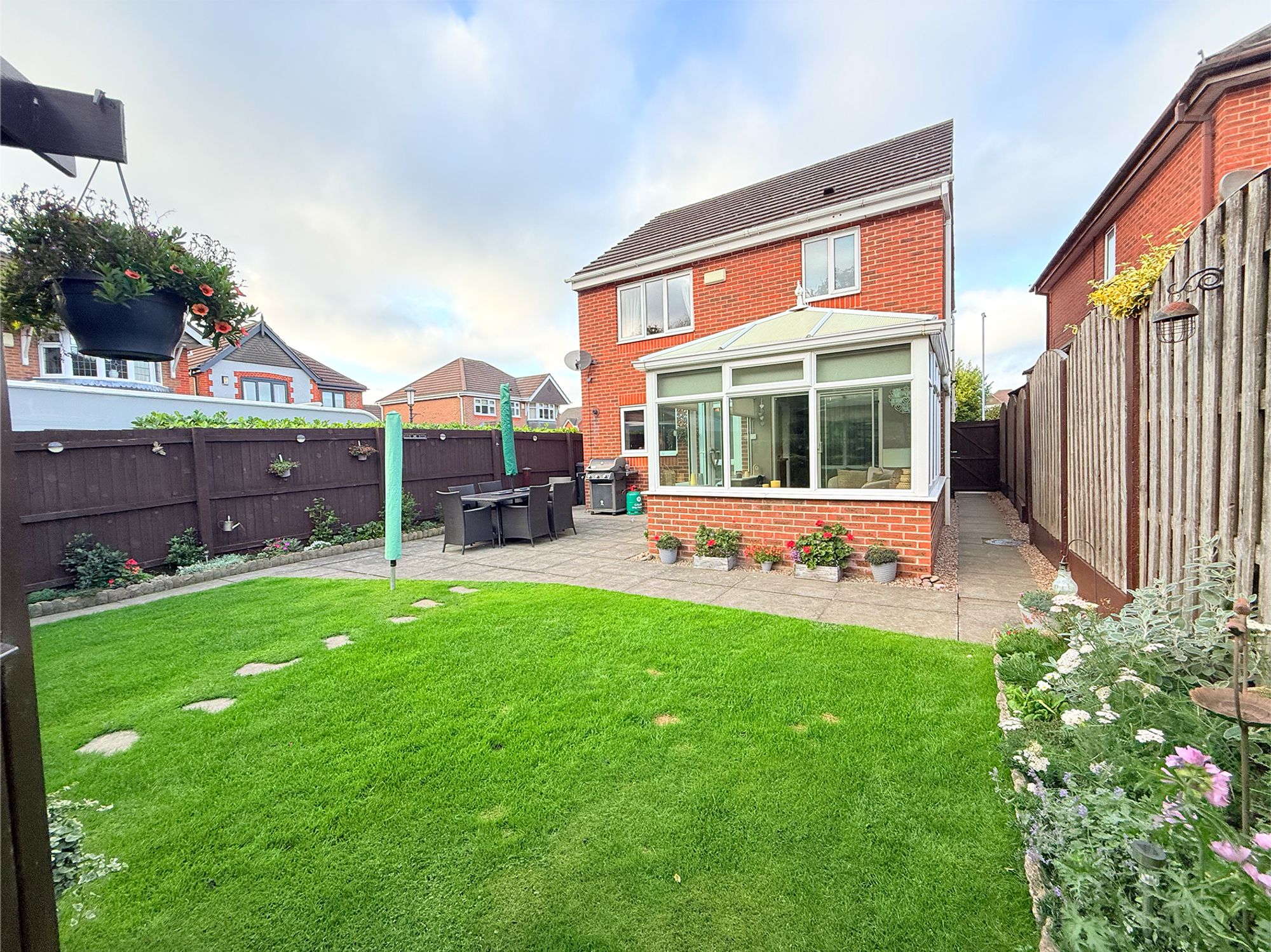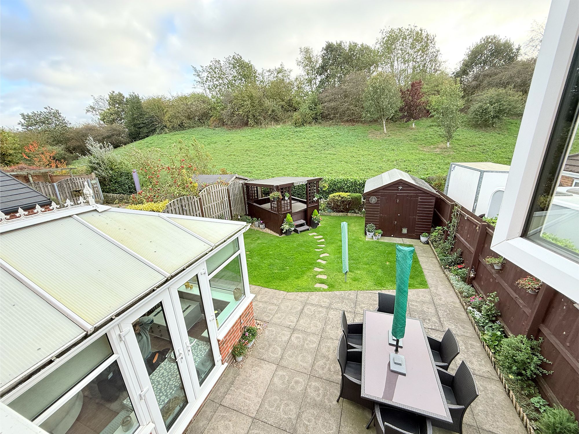 The property boasts a spacious, fully enclosed rear garden, designed for both relaxation and outdoor entertaining. A stone-flagged patio, accessible from either the kitchen or conservatory, provides the perfect setting for alfresco dining, while gated side entrances offer excellent access from the driveway. The garden features a well-maintained lawn bordered by vibrant flowerbeds, alongside a double garden shed offering ample storage. A charming wooden pergola, reached by stone stepping stones across the lawn, currently houses a hot tub but also presents potential for an outdoor seating area, kitchen, or bar. The lawn backs onto banked woodland, creating a private and tranquil outlook.