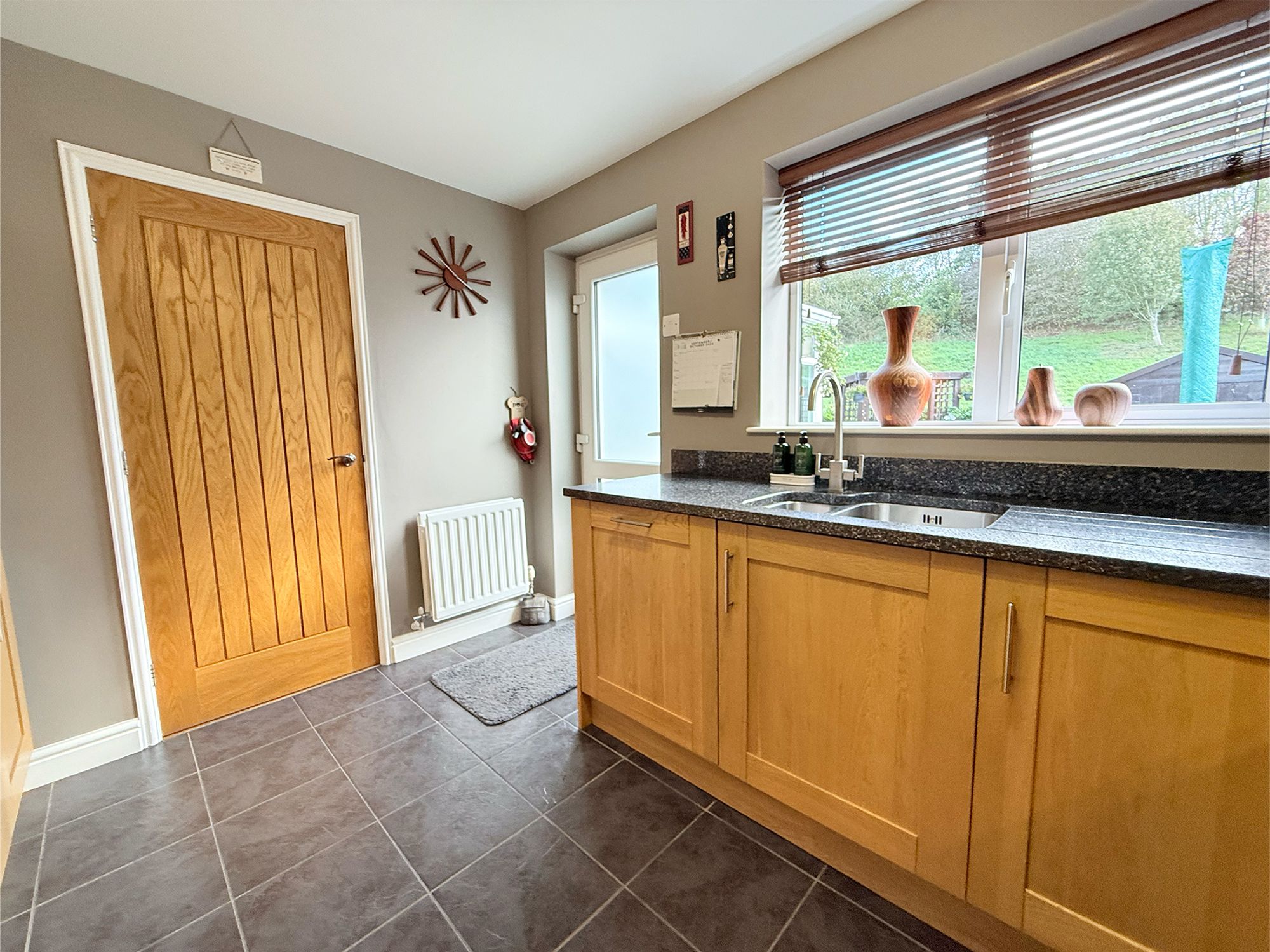 The kitchen is fitted with a range of wood-effect cabinets, complemented by granite worktops, matching splashbacks, and tiled flooring for a timeless finish. Integrated Bosch appliances include a fridge freezer and dishwasher, with the addition of a freestanding range cooker (negotiable within the sale). A door leads directly from the kitchen onto the patio, creating the perfect connection to the outdoor space and making this an ideal setting for entertaining and alfresco dining.