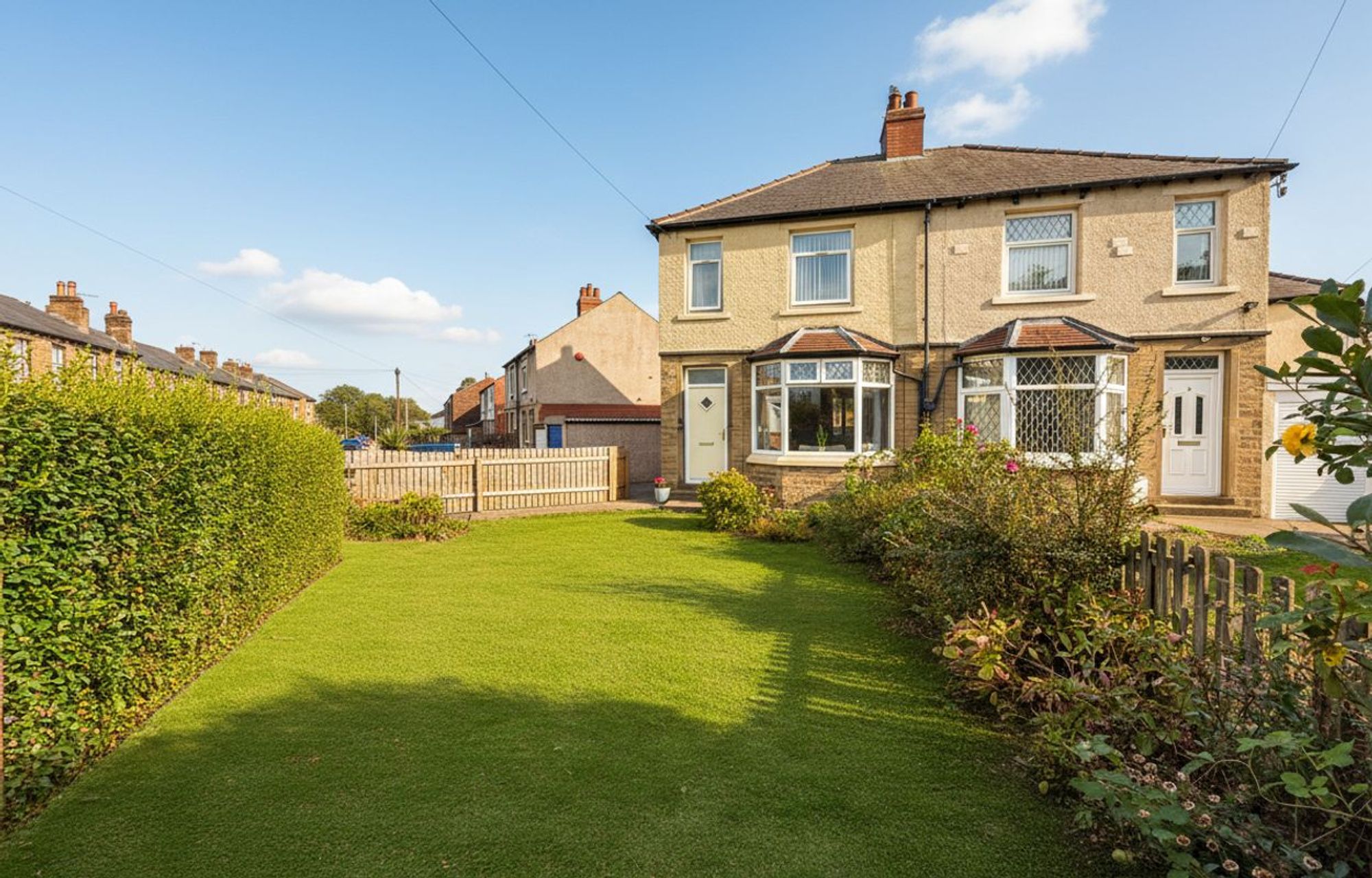 A generous lawned front garden, enclosed by mature hedging, creates an attractive approach to the property. A pathway leads invitingly to the front door, offering a welcoming first impression.