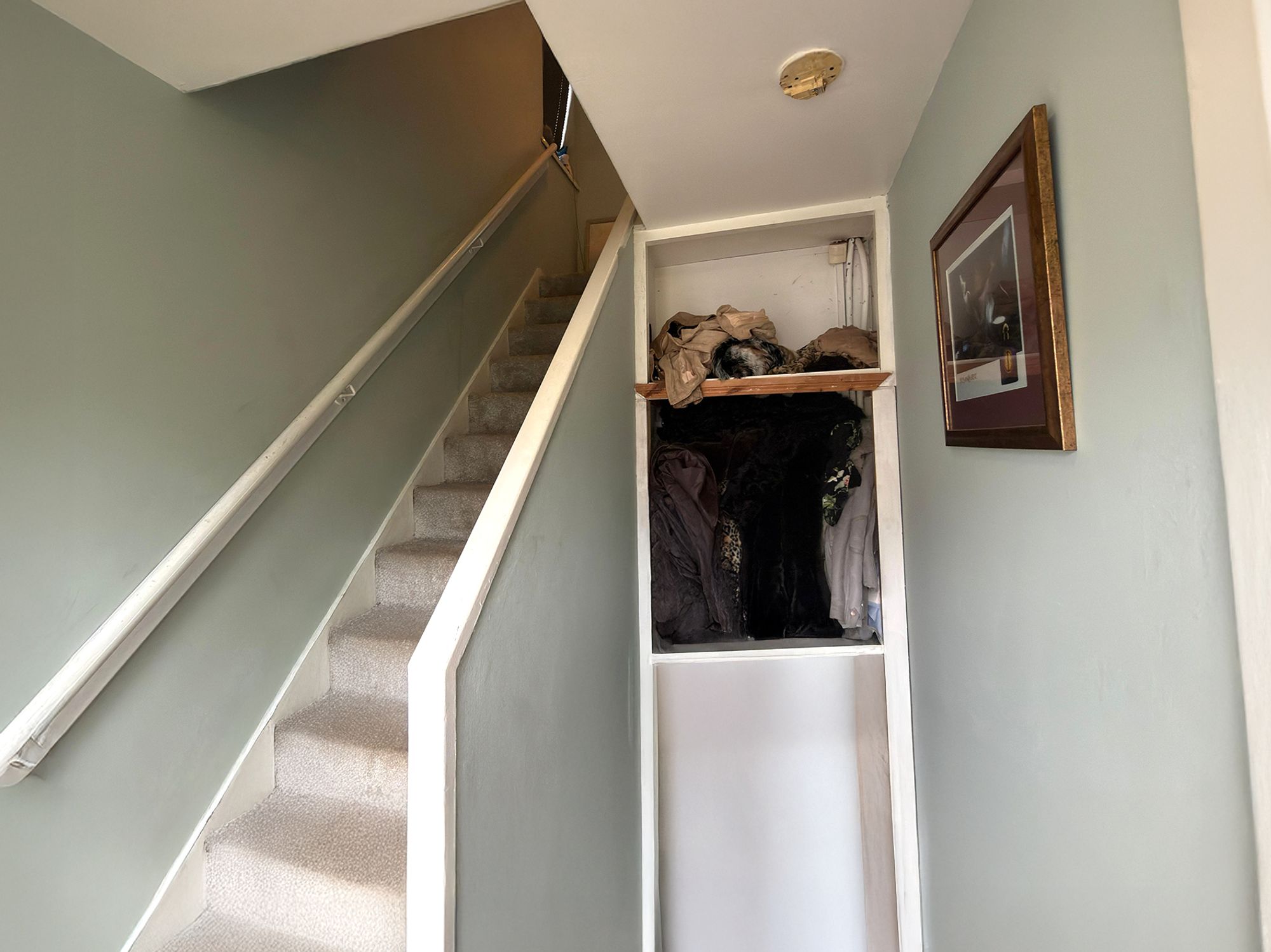 Currently used as a fourth bedroom (not to building regulations), this good-sized double room is accessed via a loft ladder from the landing and offers full head height throughout. Presented in soft tones with a wallpapered feature wall, the space is bathed in natural light from a South East-facing Velux window. There’s ample room for free-standing furniture, along with built-in cabinets, a decorative bookcase, and a separate storage room within the eaves.