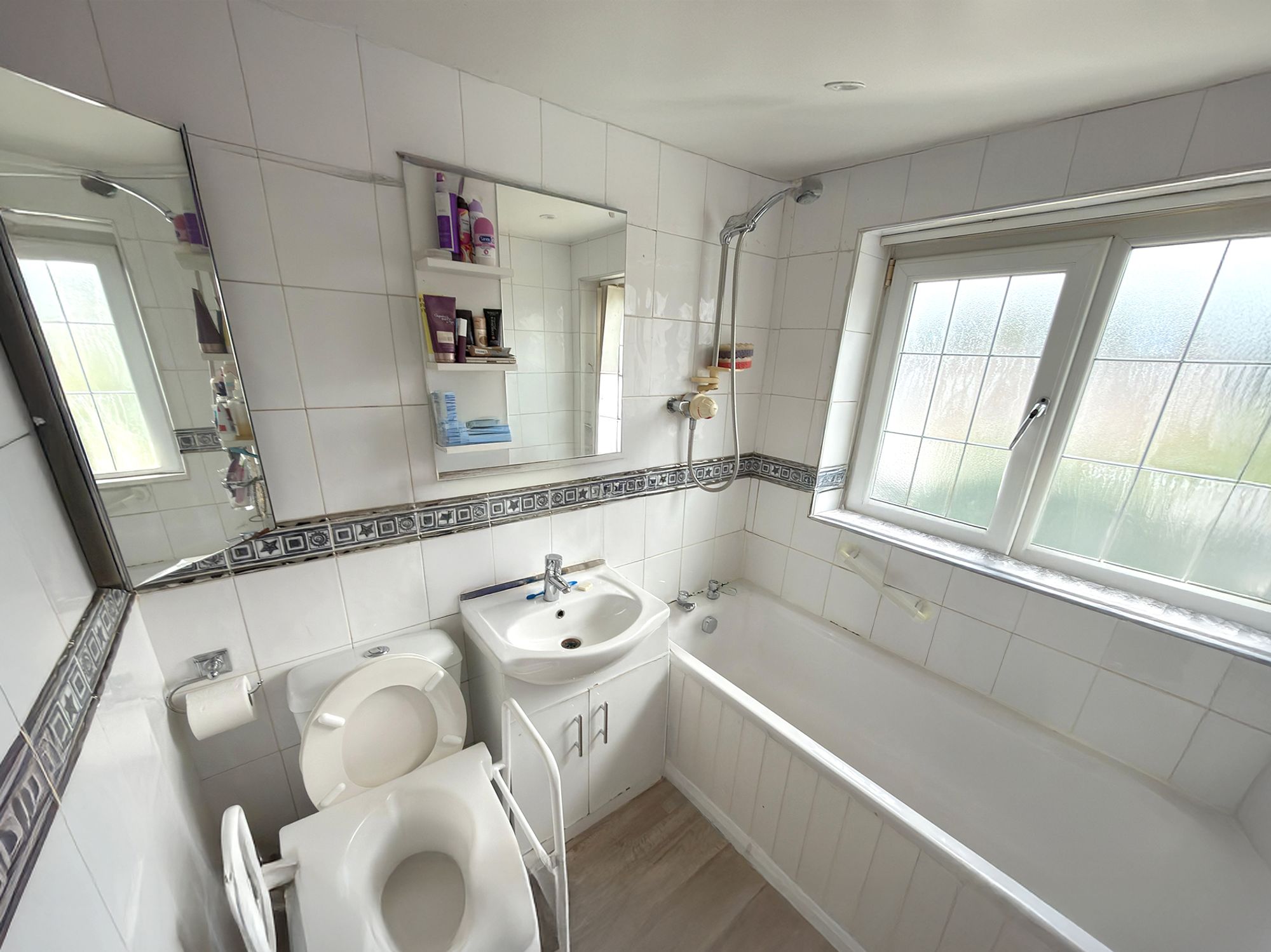 The bathroom features a full-size wood-panelled bath with a chrome shower head and mixer tap, alongside a white vanity sink and WC. Frosted glass windows offer natural light with privacy, while white tiled walls with a decorative border add a touch of detail. The space is finished with wood-effect Linoleum flooring, spotlights, and a white heated towel rail.