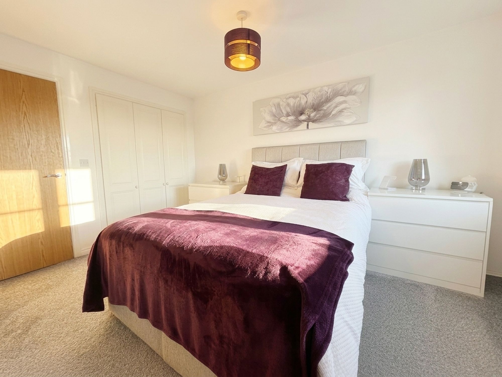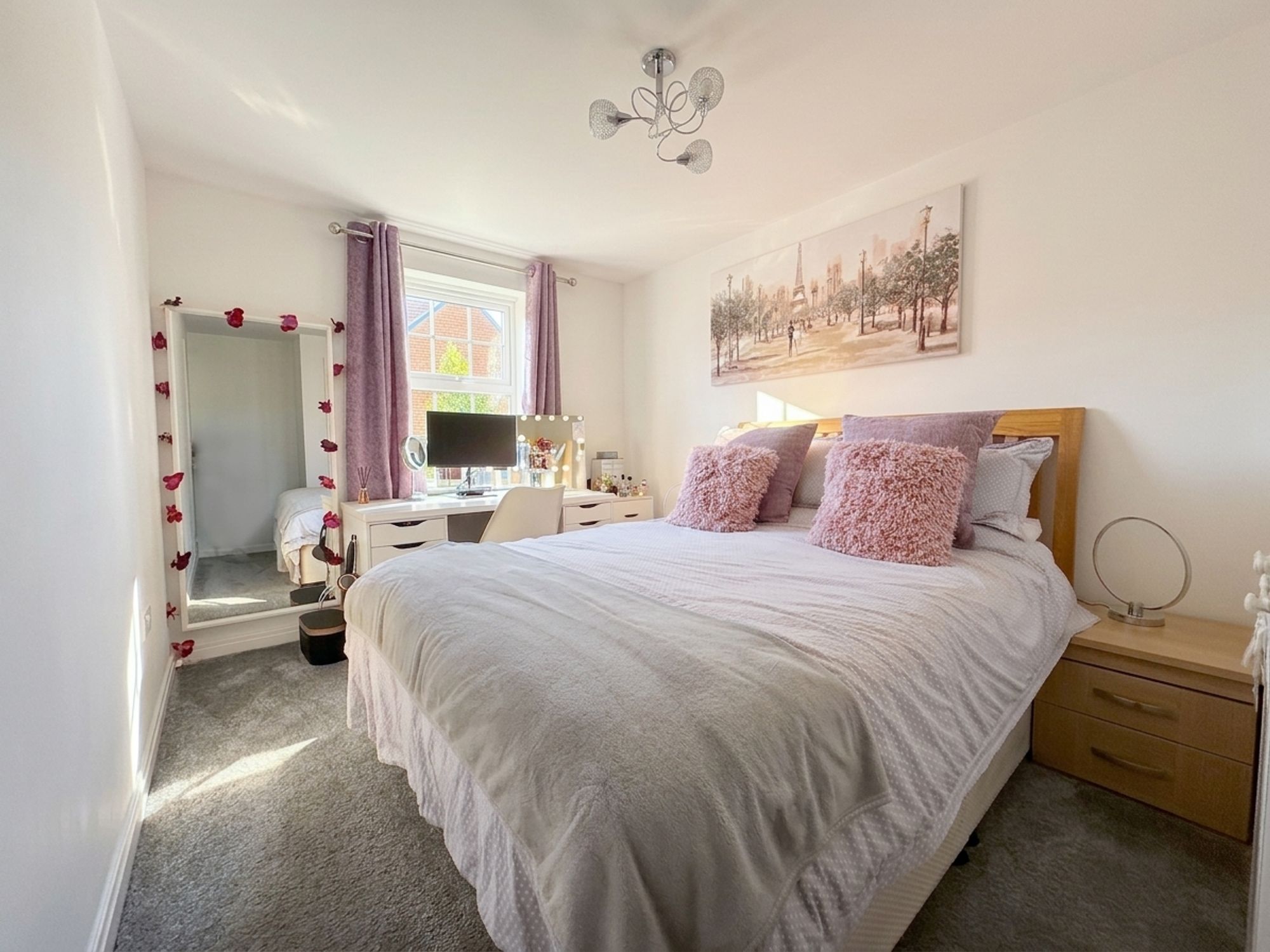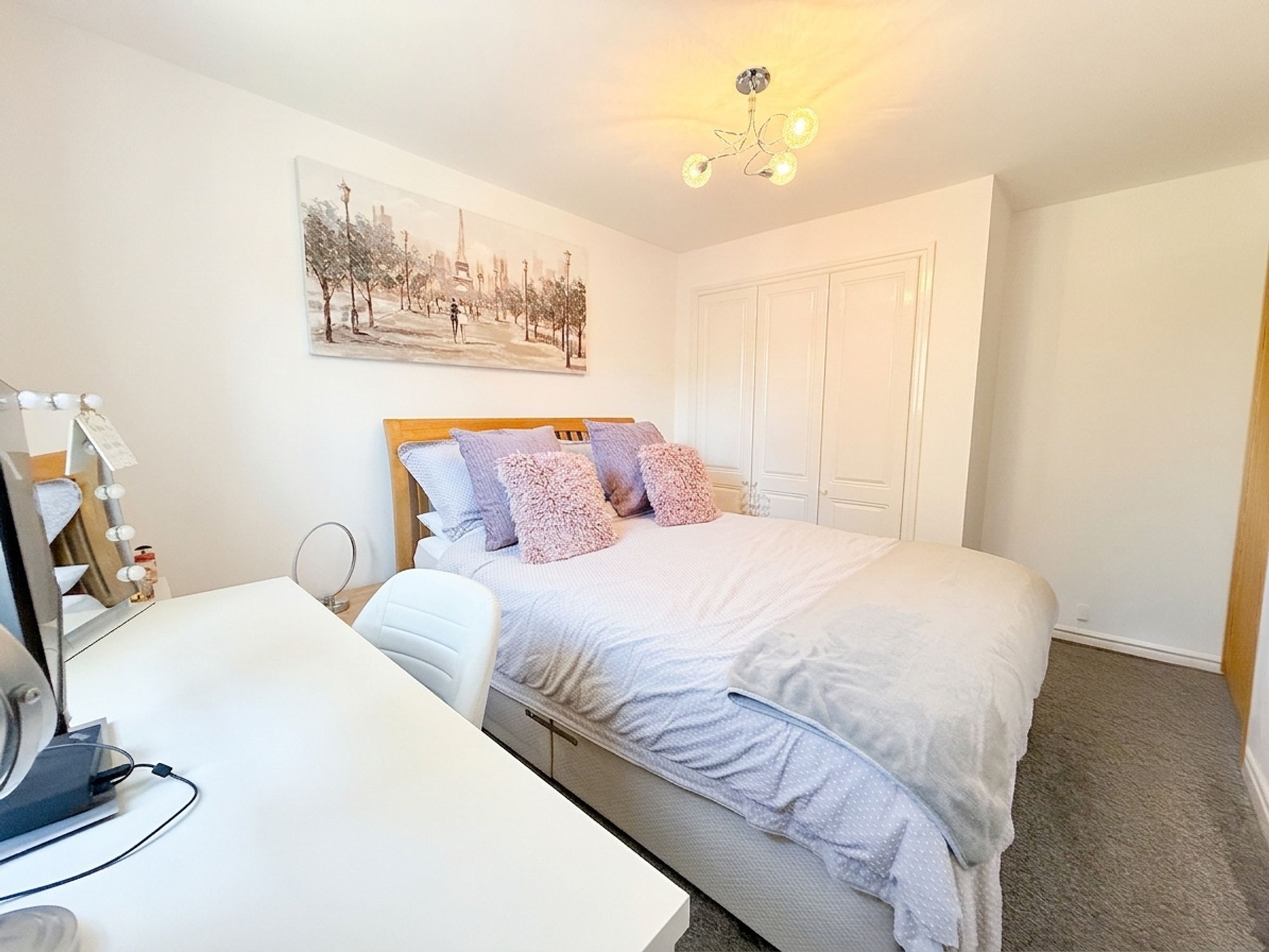 A spacious principal bedroom with ample room for a king-size bed and additional freestanding furniture. Benefits from built-in wardrobes and private access to the ensuite. Neutrally decorated with fitted carpeting.