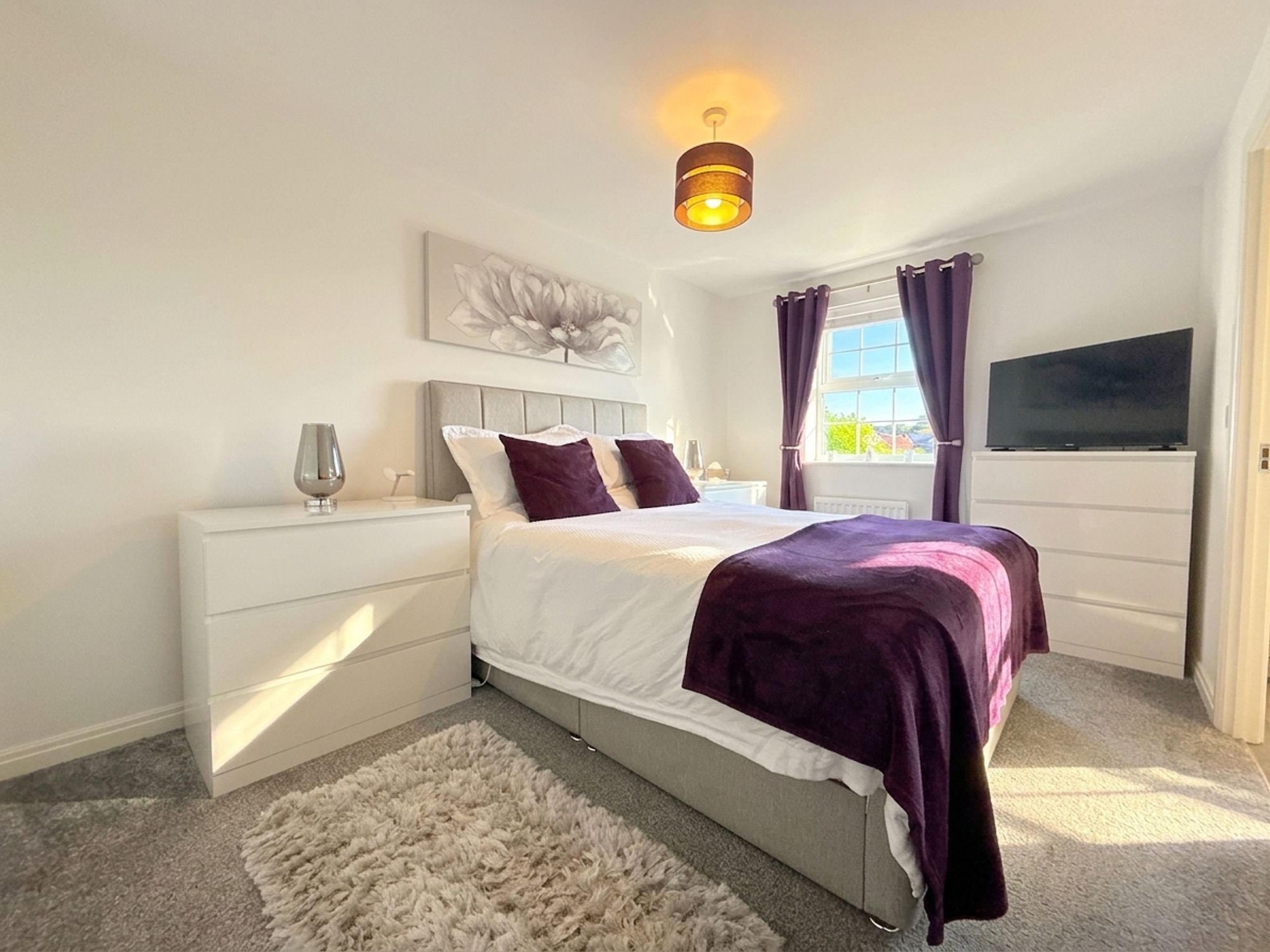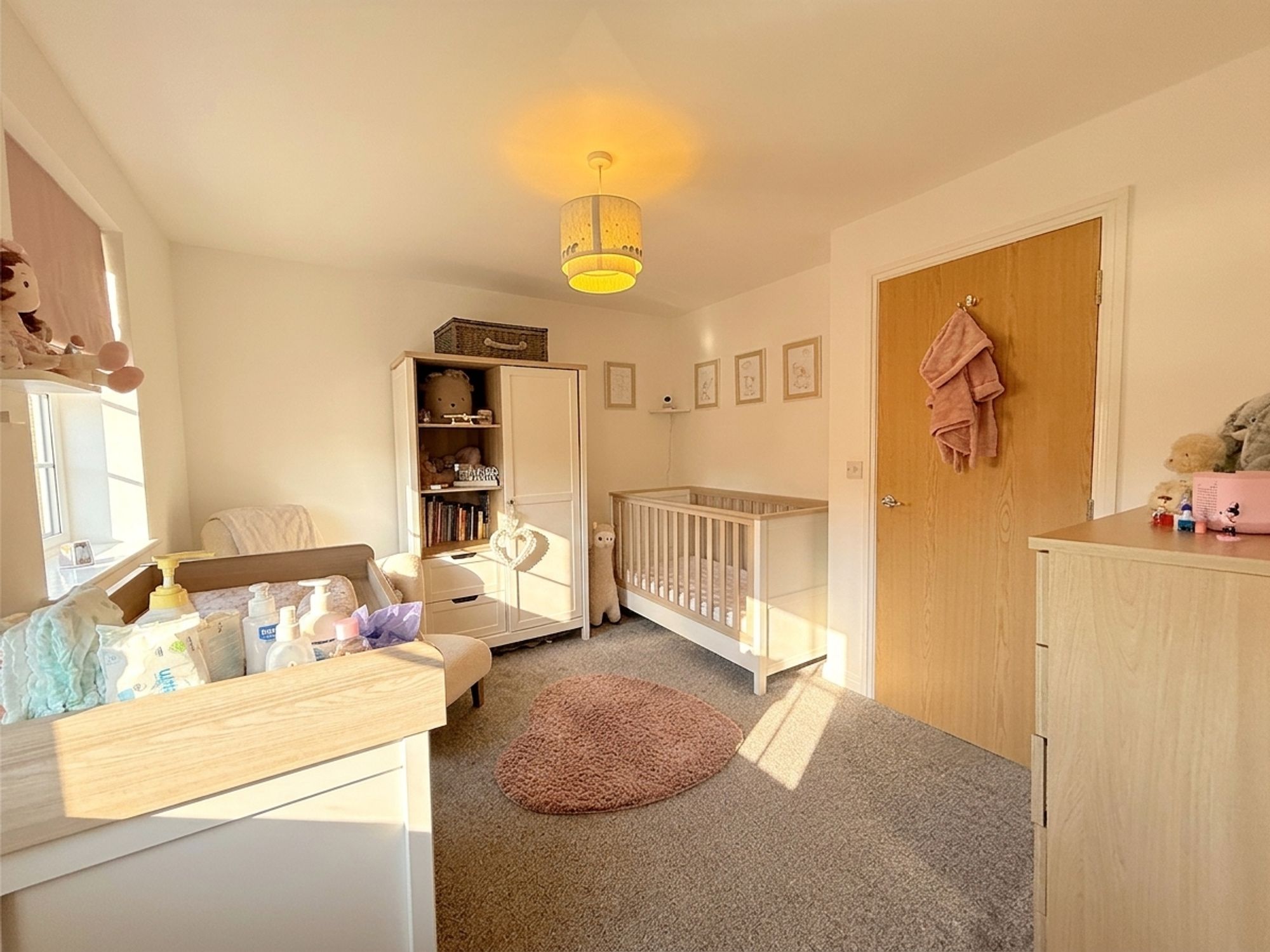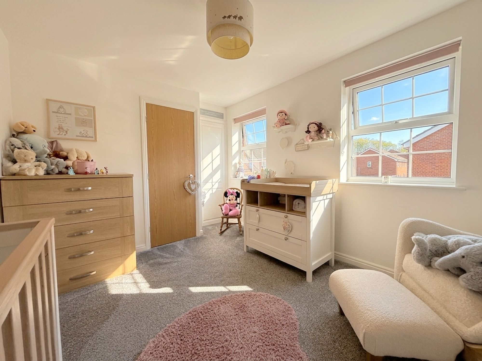 A spacious principal bedroom with ample room for a king-size bed and additional freestanding furniture. Benefits from built-in wardrobes and private access to the ensuite. Neutrally decorated with fitted carpeting.