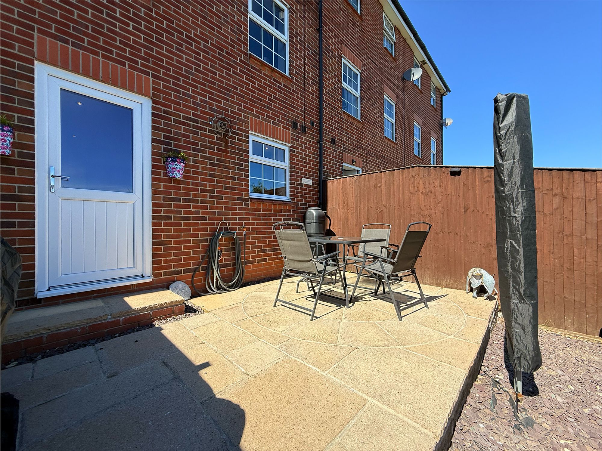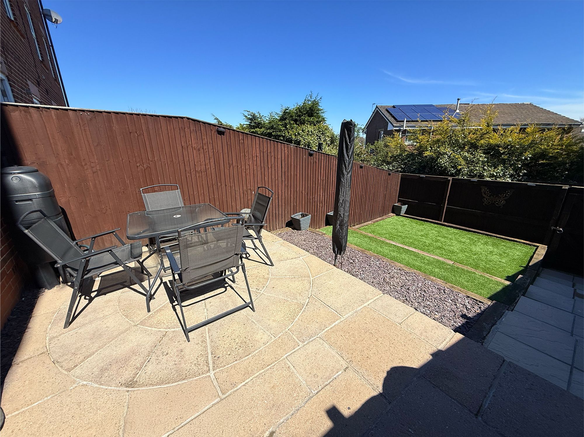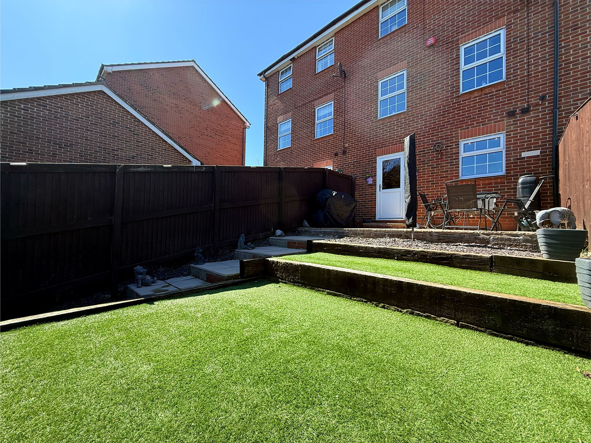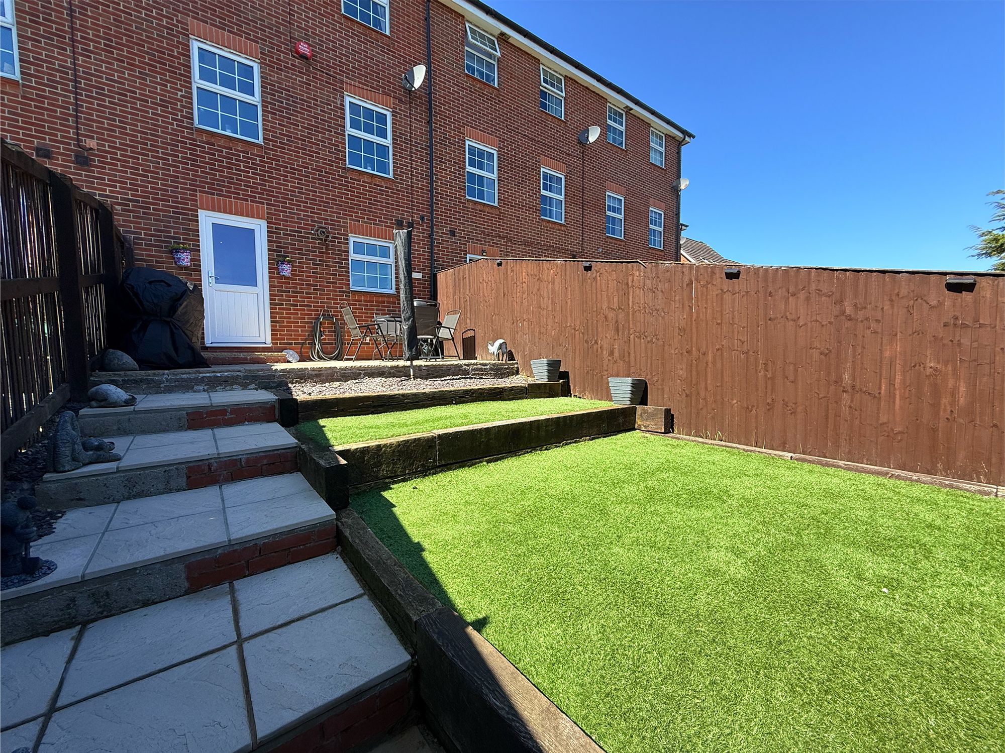 To the rear of the property is a private, enclosed garden featuring a stone-flagged patio area directly accessed from the kitchen, ideal for outdoor seating, BBQs and enjoying the sunshine. Steps lead up to a tiered lawned garden with a wooden retaining wall and a stone pathway. The garden is fully enclosed by wooden fencing, making it perfect for children and pets, and also benefits from a rear access gate.