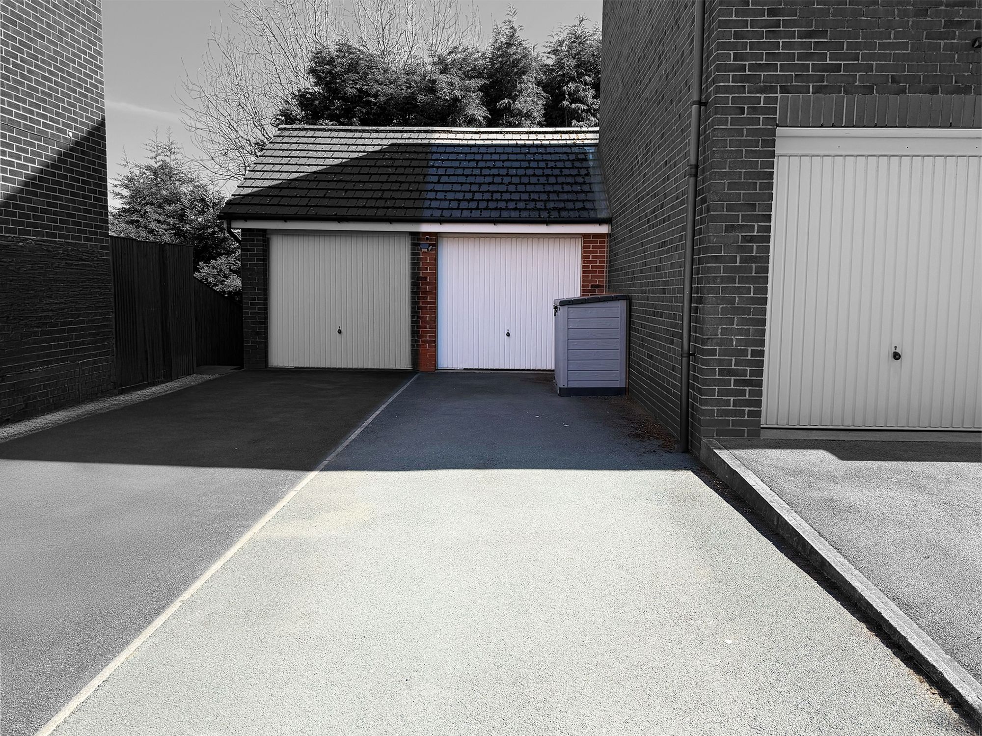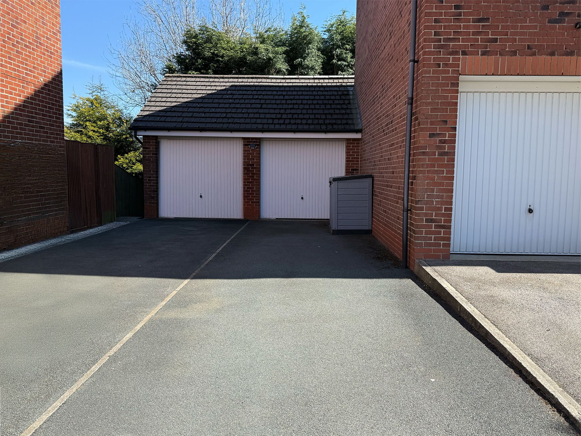 Driveway: 2 spaces - A tarmac driveway offering off-road parking for two vehicles and leading to the single garage.