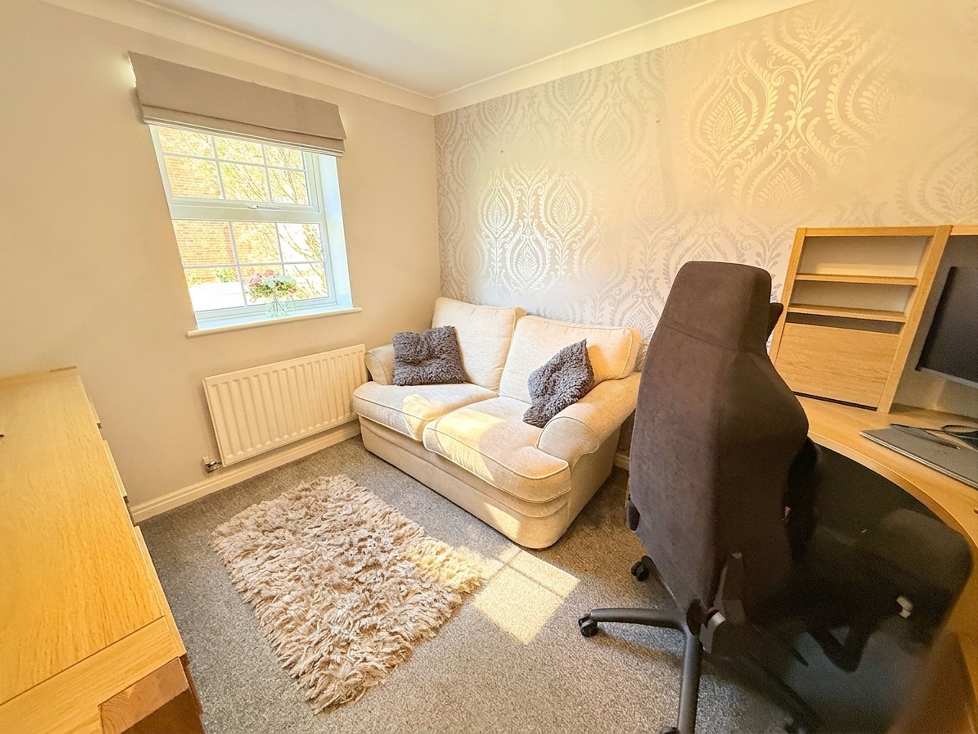 Located on the ground floor and currently utilised as a home office, this versatile room could equally serve as a fourth double bedroom, dining room or study. Positioned to the front of the property, it benefits from plenty of natural light, neutral décor and fitted carpeting.
