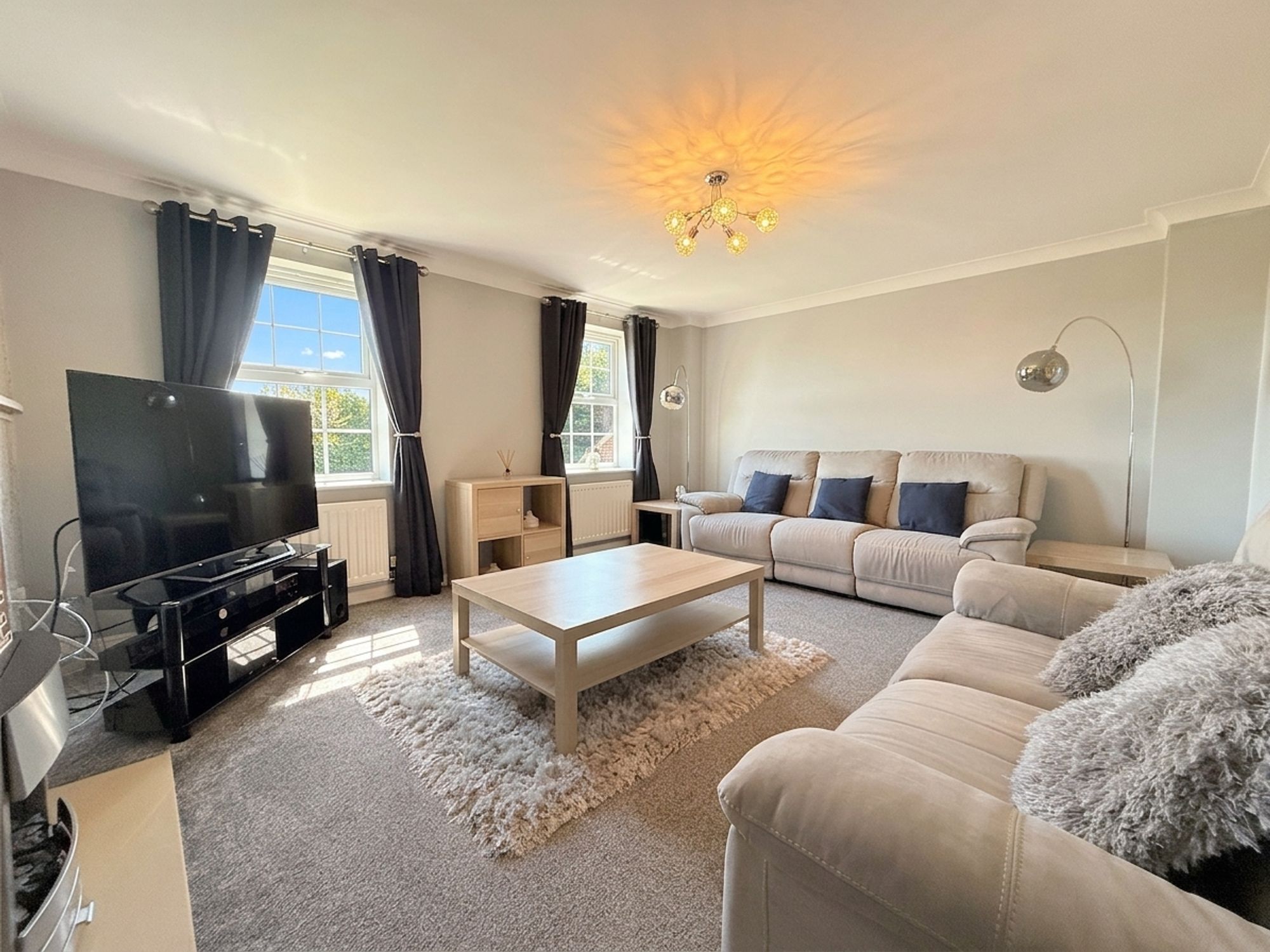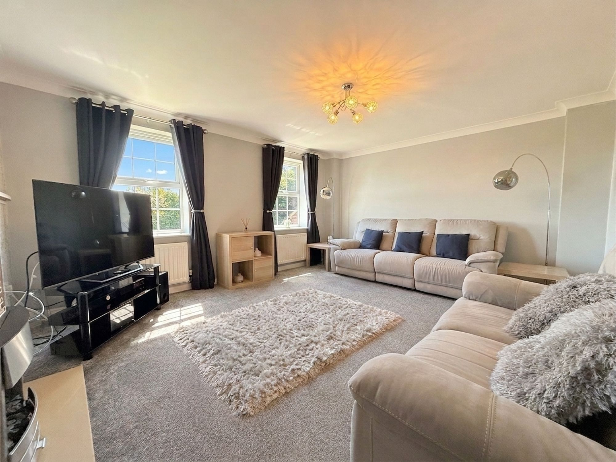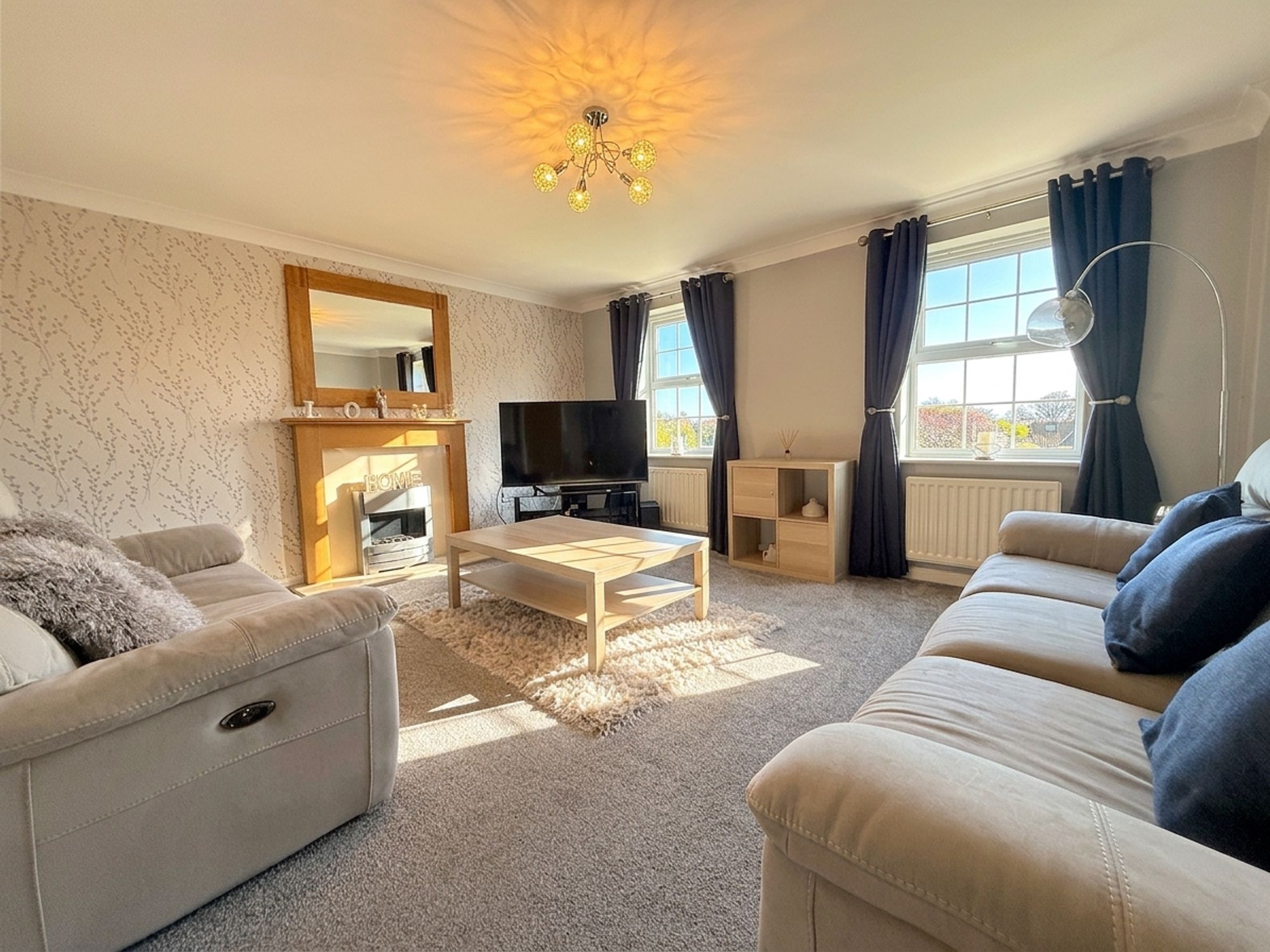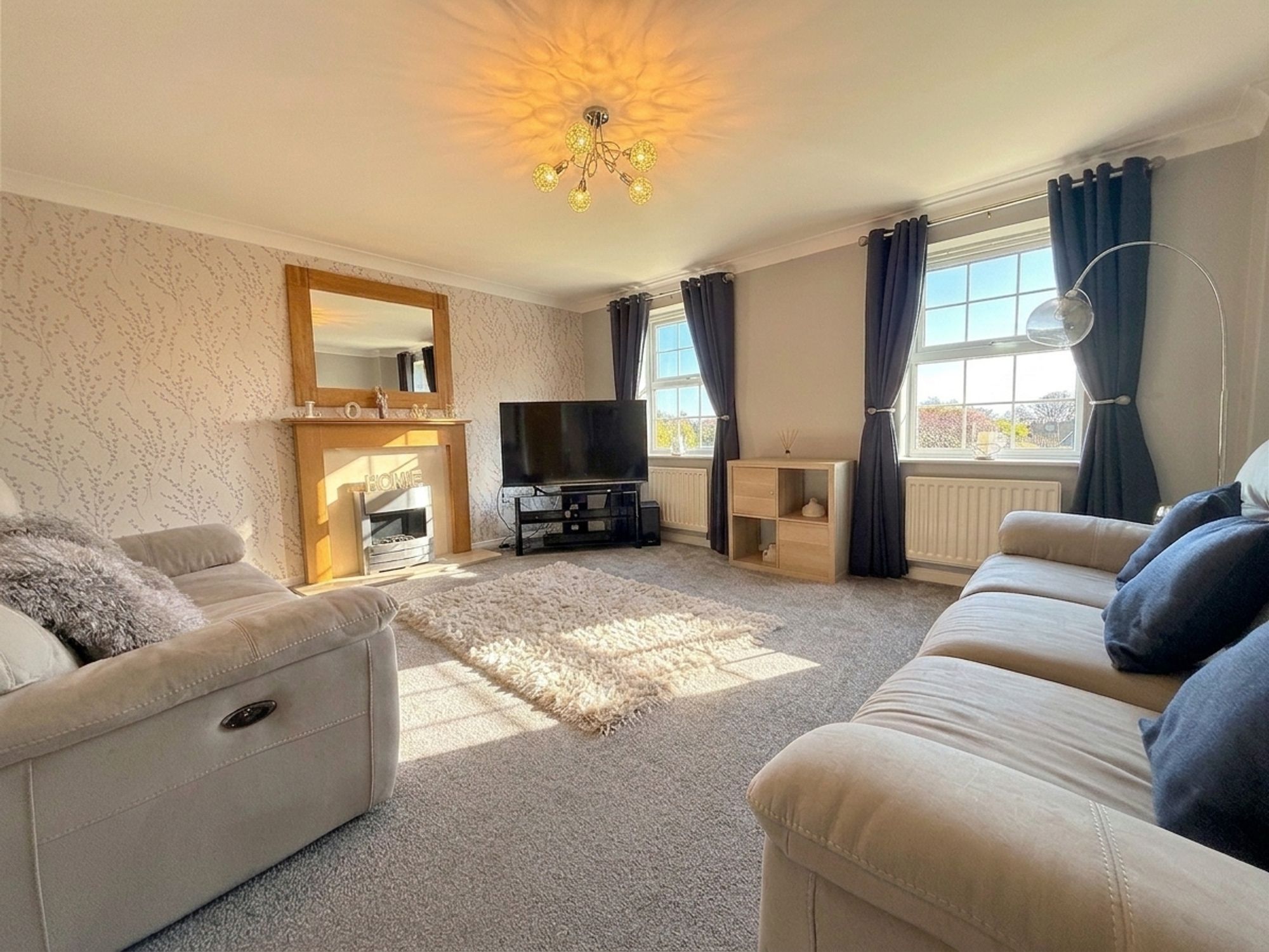 Situated on the first floor, this spacious living room spans the full width of the property and enjoys pleasant views over the rear garden. It offers generous space for a variety of seating arrangements, centred around a modern coal-effect electric fireplace set within an oak mantel and neutral surround. Decorated in soft tones with a stylish feature wall.