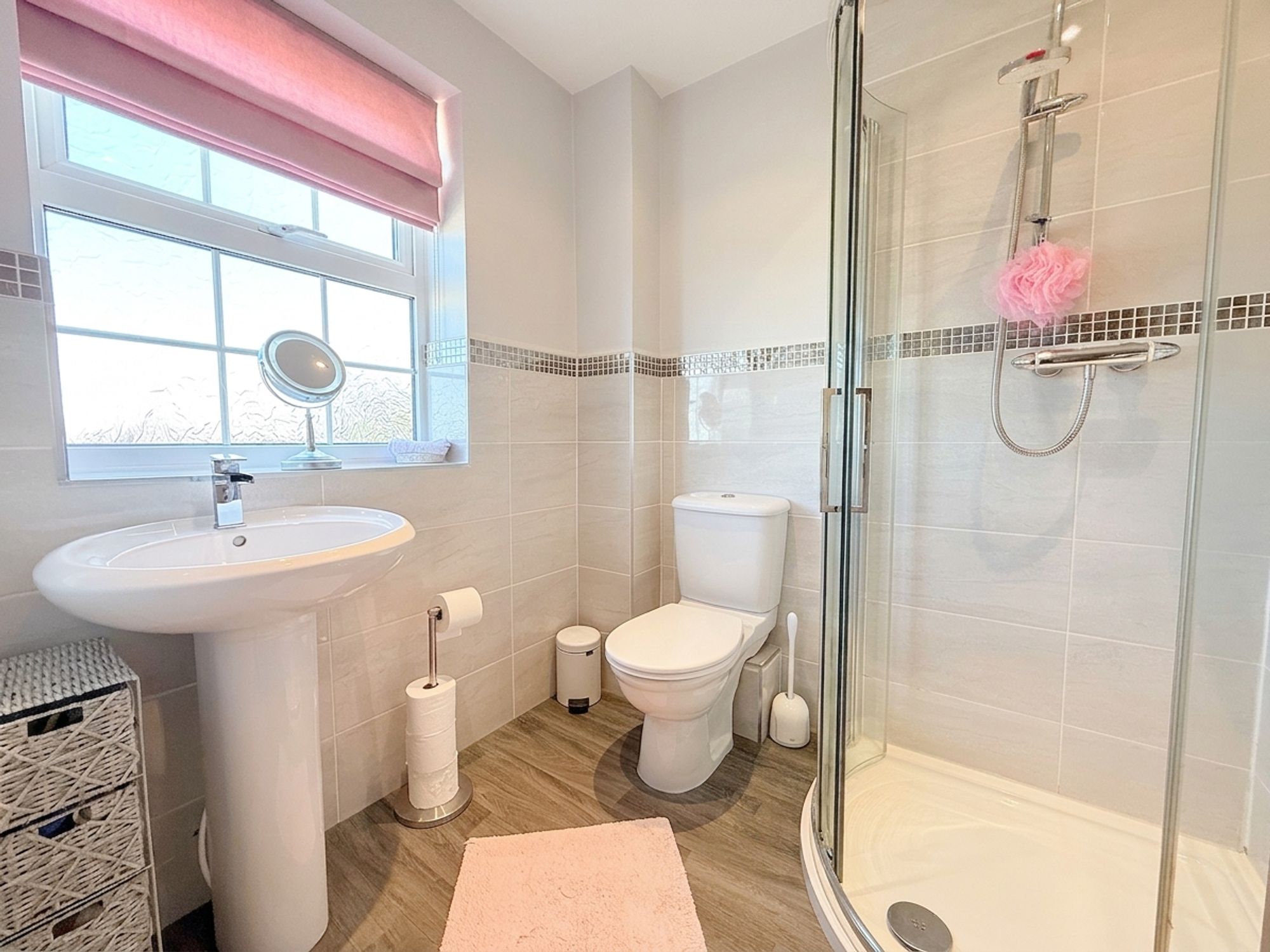 Fitted with a shower enclosure with chrome handheld attachment, WC and pedestal wash basin with chrome mixer tap. Additional features include a white heated towel rail, electric shaver point and frosted window. Finished with neutral wall tiling, decorative accents and wood-effect flooring.