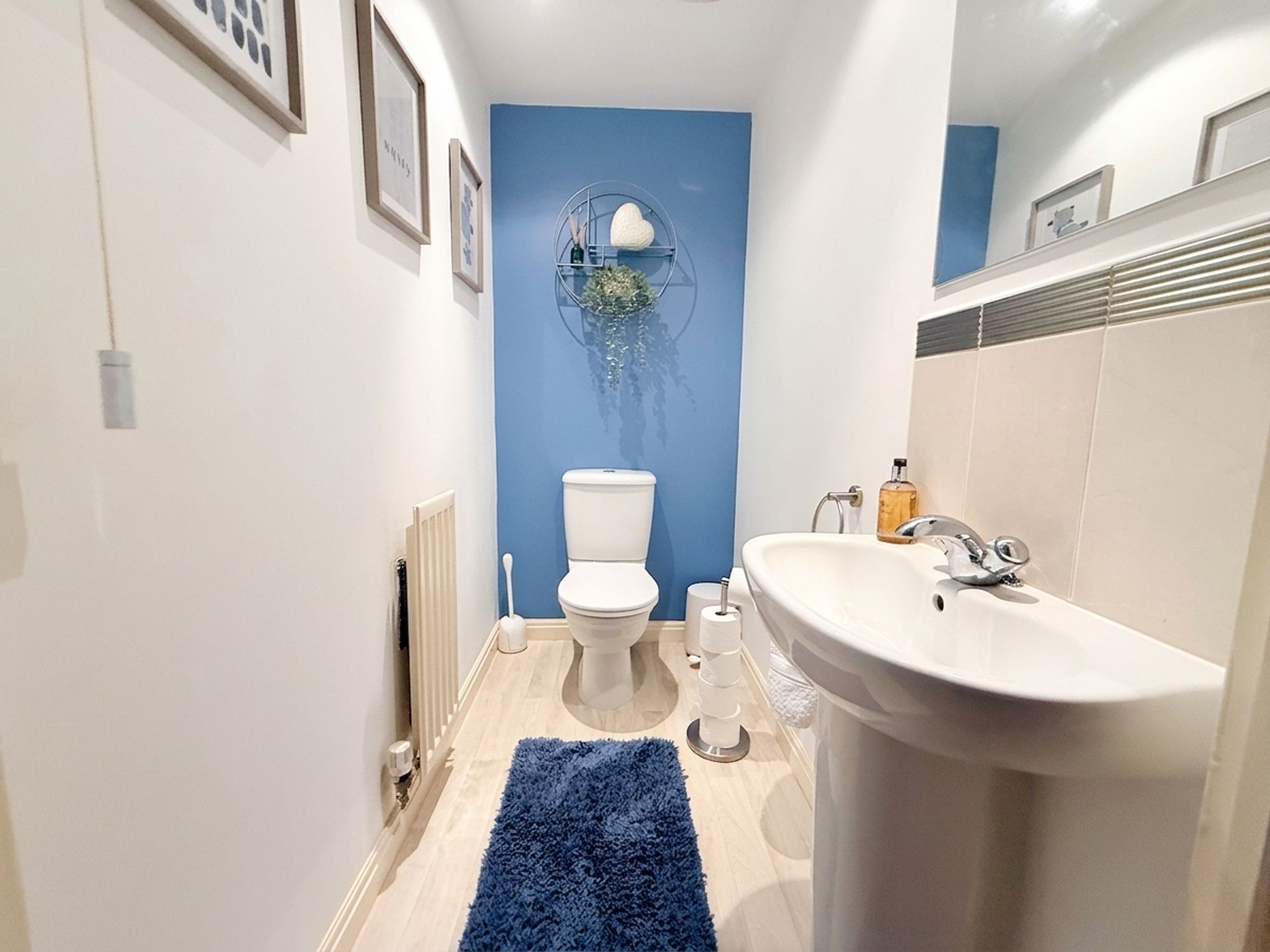 A modern ground floor cloakroom fitted with a WC and pedestal wash basin with chrome mixer tap. Stylishly finished with neutral décor, an accent wall and wood-effect laminate flooring.