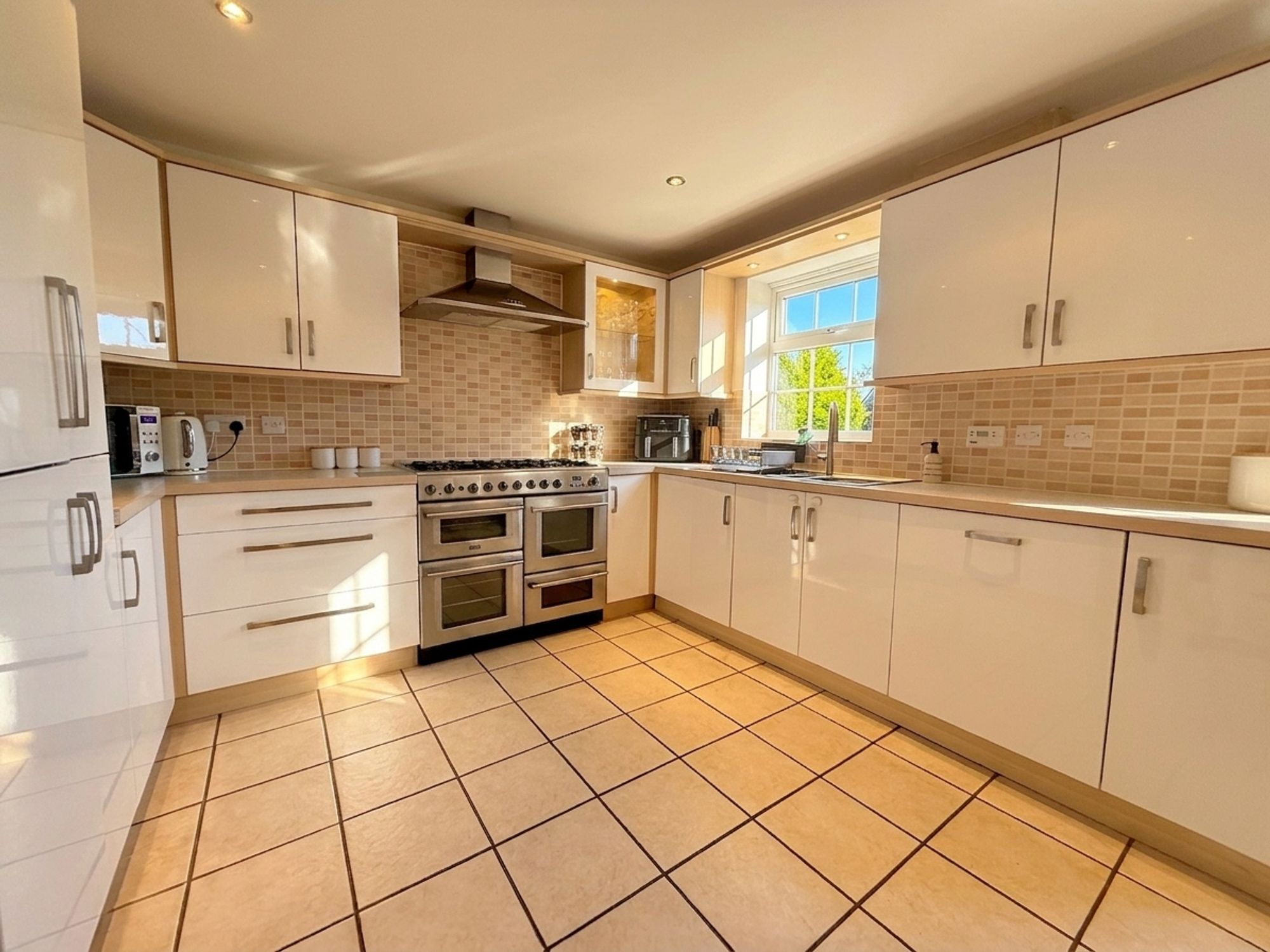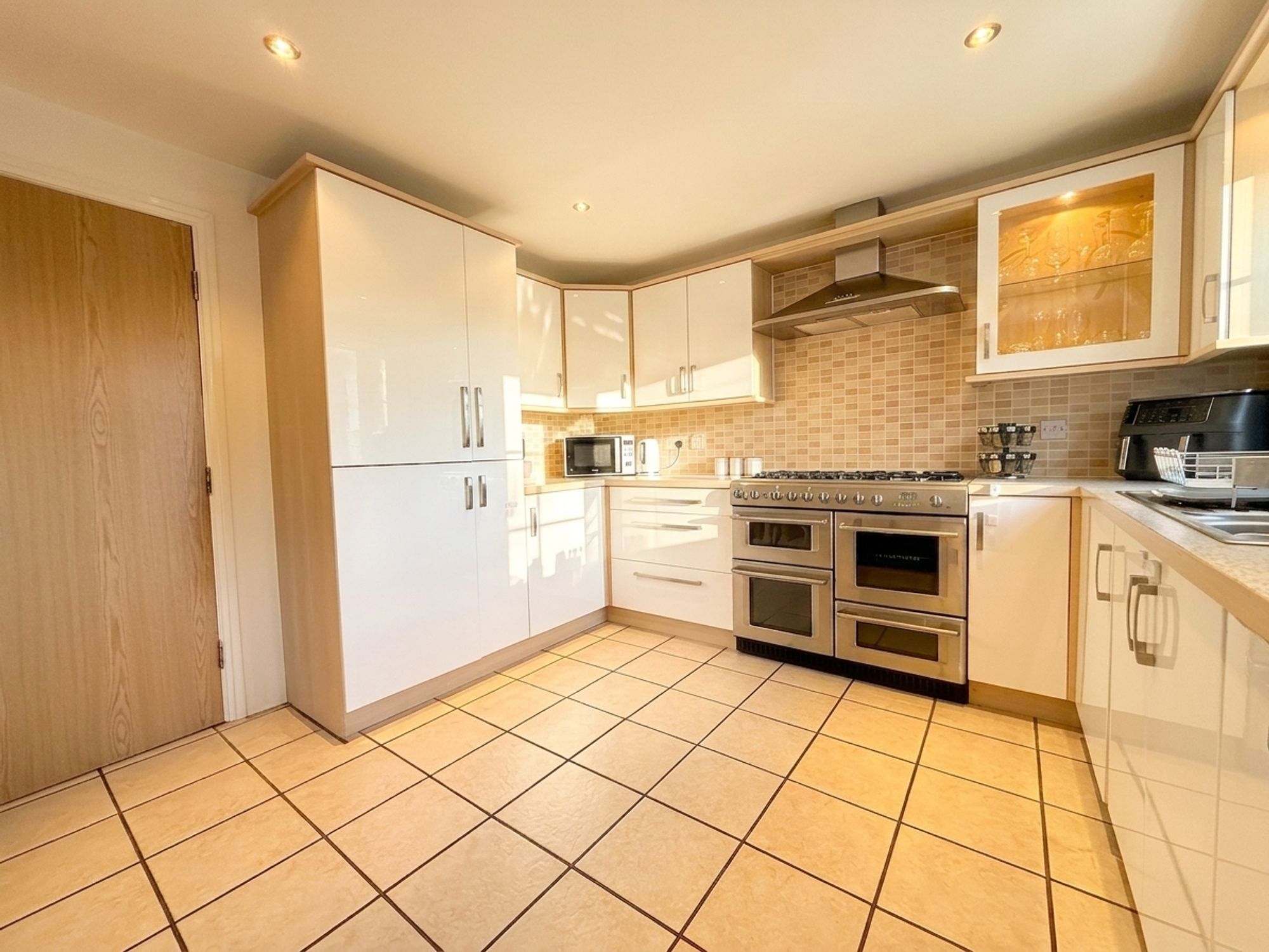 A well-appointed dining kitchen fitted with a range of white wall and base units complemented by matching worktops and tiled flooring. Integrated appliances include a washing machine, dishwasher and fridge freezer, with the boiler neatly concealed within the cabinetry. A standout feature is the range cooker, comprising a six-ring gas hob, grill, fan oven, additional electric oven and plate warmer, with extractor hood above. There is ample space for a full family dining suite, along with a useful understairs cupboard housing electrical utilities. A stylish display glass unit with built-in lighting adds a decorative touch, while a door provides direct access to the rear garden.