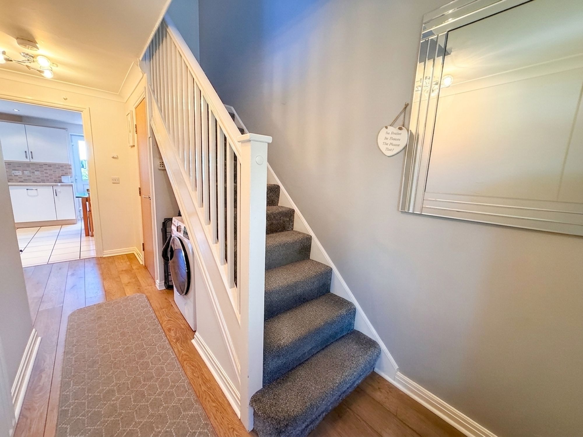 A spacious and welcoming entrance hall, neutrally decorated and finished with wood-effect laminate flooring. Provides access to the study/bedroom four and dining kitchen. There is a useful understairs area ideal for coats and shoes, along with a handy storage cupboard housing the water tank.