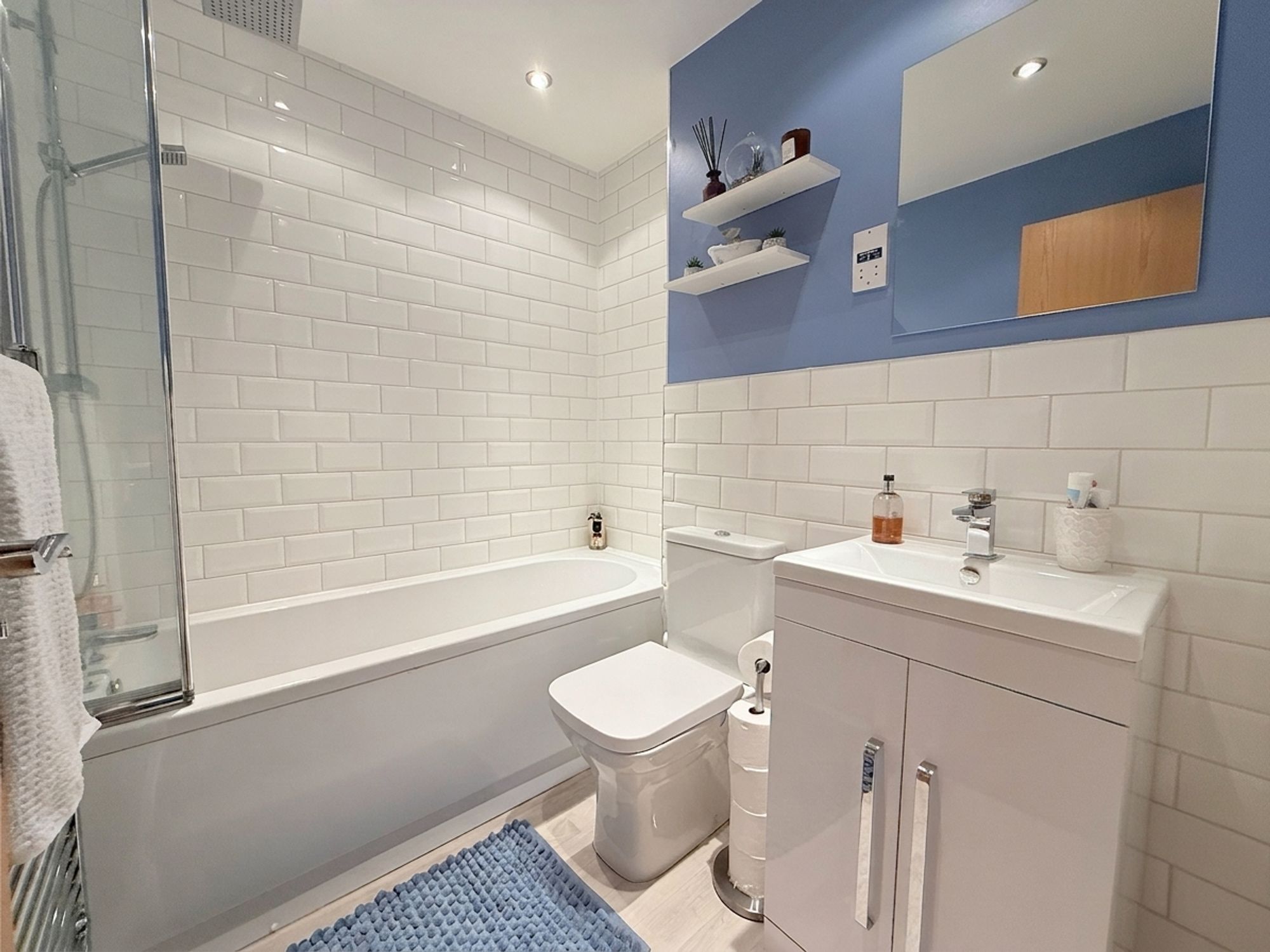 A modern family bathroom comprising a full-size bath with chrome mixer tap and separate shower with rainfall head and handheld attachment. Also includes a vanity sink unit with storage below, WC and chrome heated towel rail. Finished with crisp white wall tiling and wood-effect flooring, along with an electric shaver point and extractor fan.