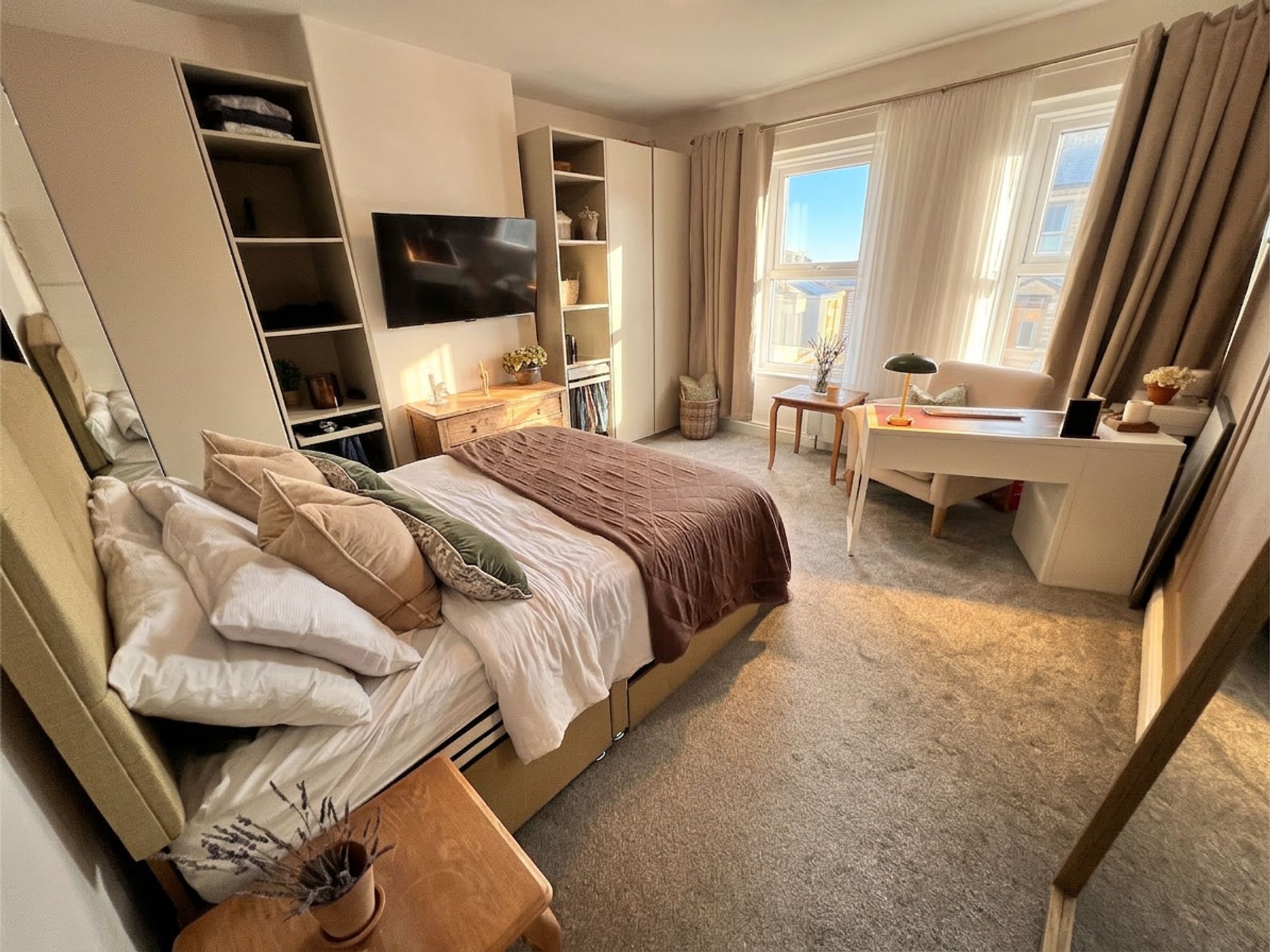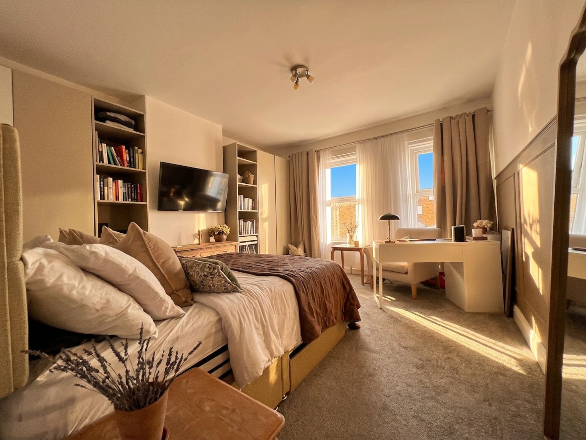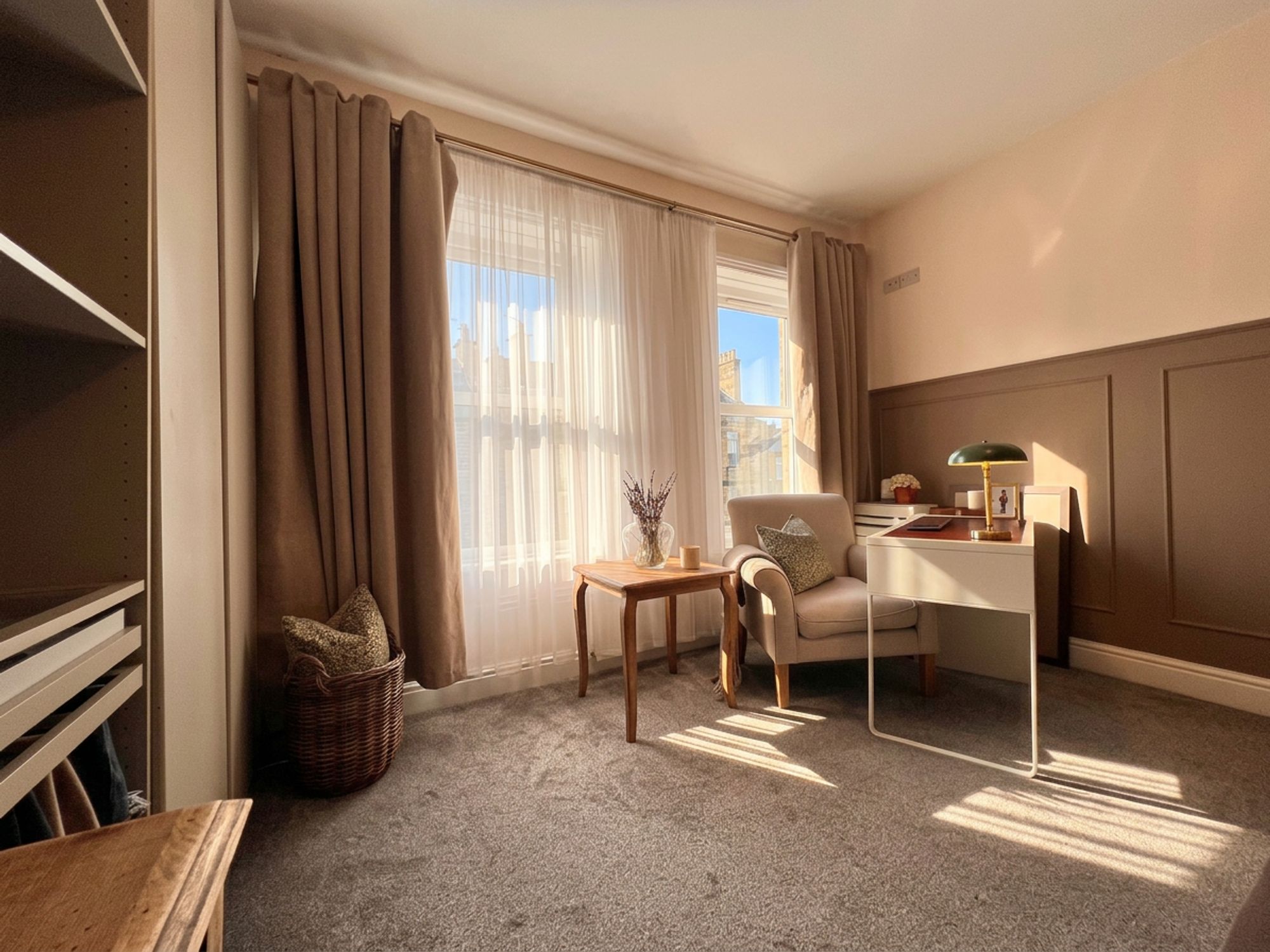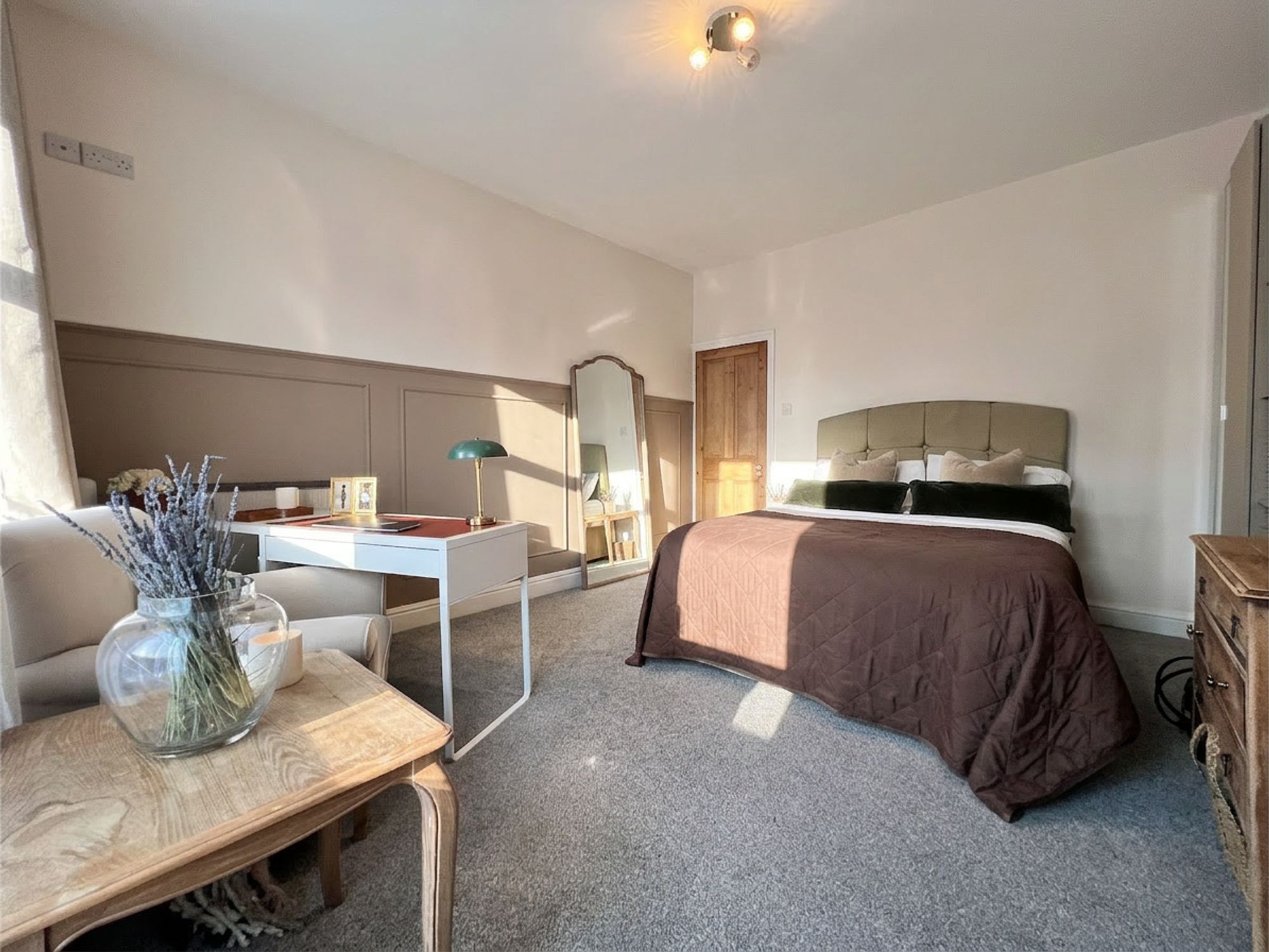 This generously proportioned bedroom is flooded with natural light courtesy of large double front-facing windows, creating a wonderfully bright and airy atmosphere. Presented in soft, tasteful tones with stylish half panelling to one feature wall, the room exudes both elegance and comfort. Offering ample space for a variety of freestanding furniture, it provides a calm and inviting retreat, a true adult sanctuary for rest and relaxation.