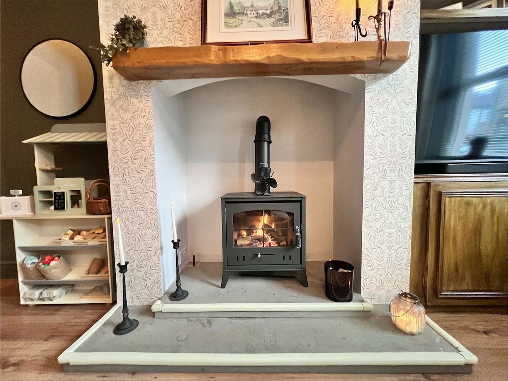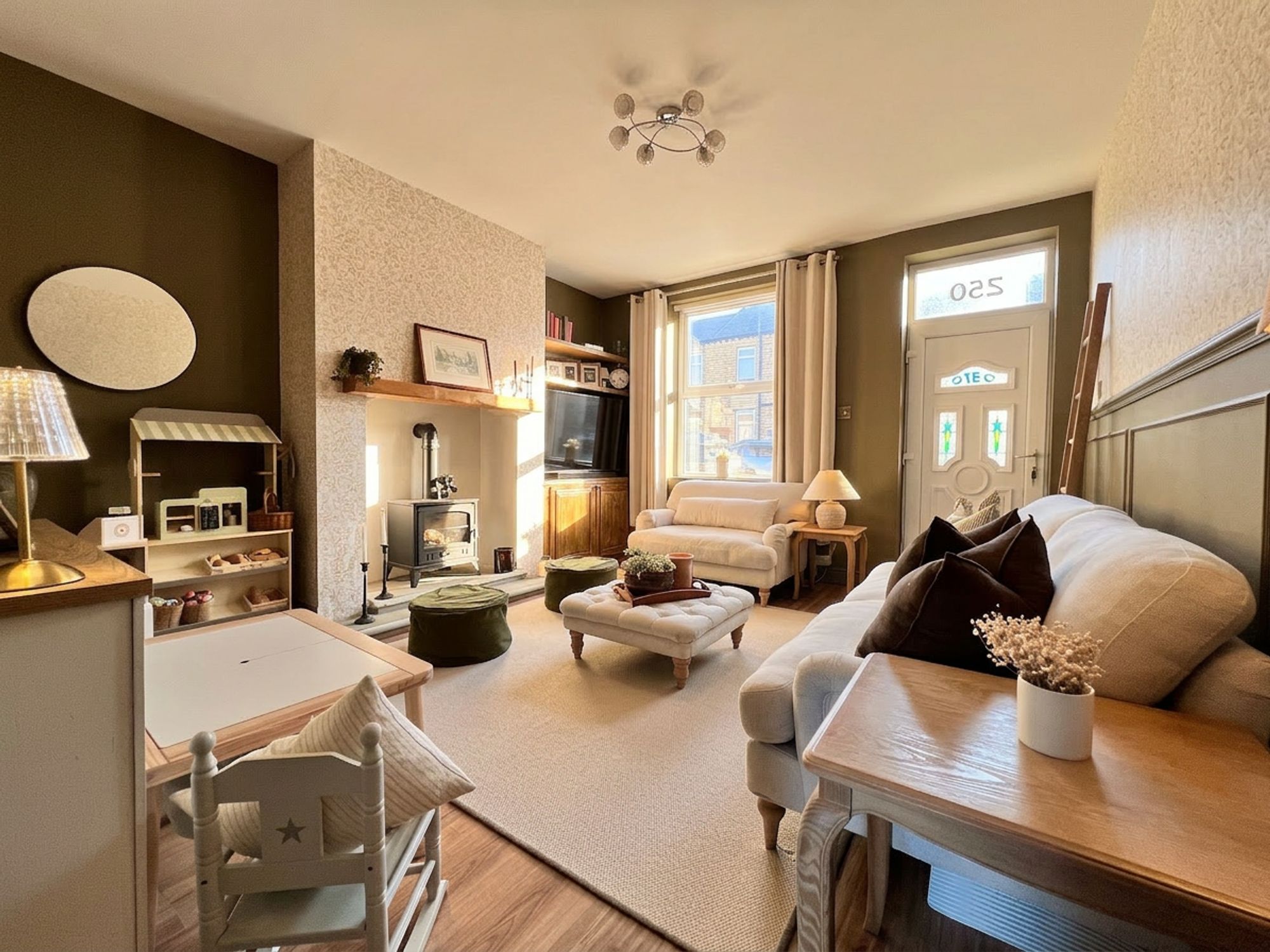 From the moment you step into this stunning property, the immediate sense of design and style effortlessly envelops you. The fantastic-sized lounge is beautifully presented in tasteful tones, enhanced by elegant feature wallpaper that adds character and sophistication. Immaculately maintained and bathed in natural light courtesy of the front-facing window, the room also enjoys pleasant views over the manicured front garden. The striking focal point is the beautiful bio-ethanol inglenook-style fire, set within an impressive chimney breast and finished with a charming oak mantle above. To the right-hand side of the chimney breast, cleverly designed fitted cupboards provide additional storage while maintaining the room’s sleek and considered aesthetic. Warm, inviting and stylishly appointed, this is a truly fabulous lounge, a cosy yet elegant space perfectly suited to both relaxed family living and entertaining.