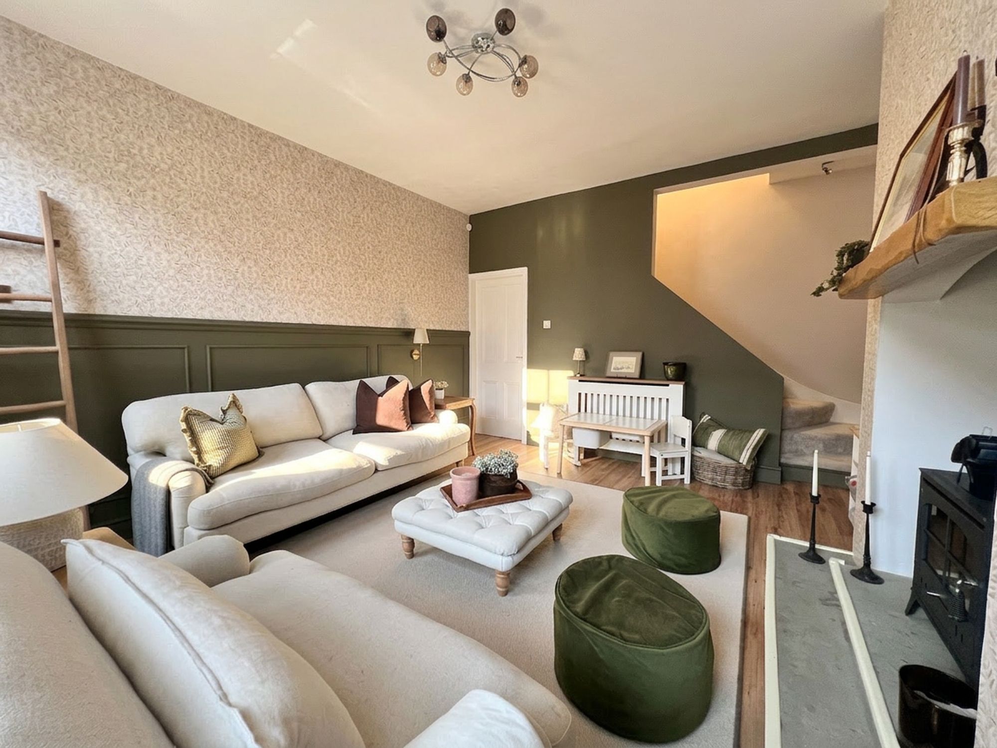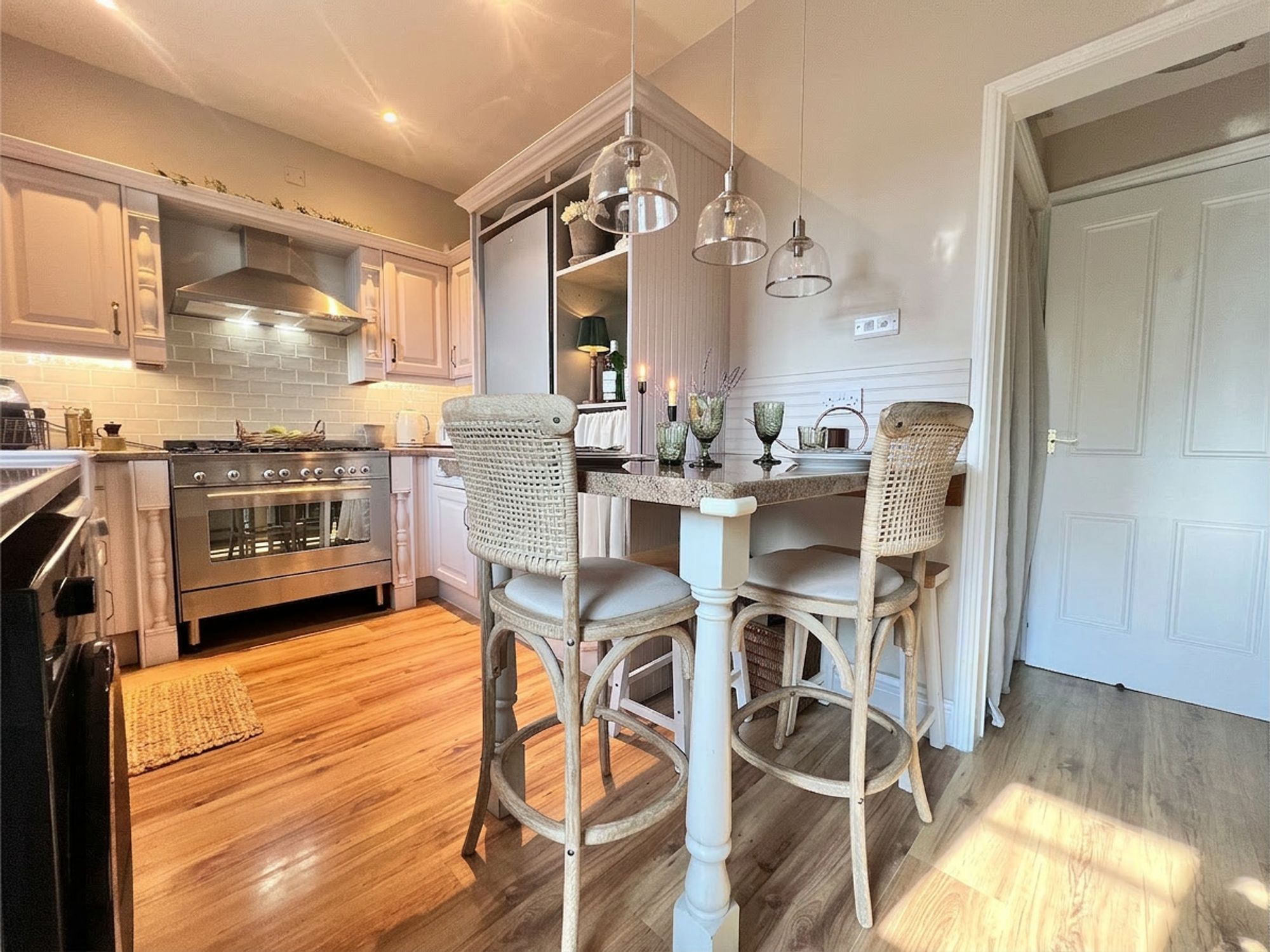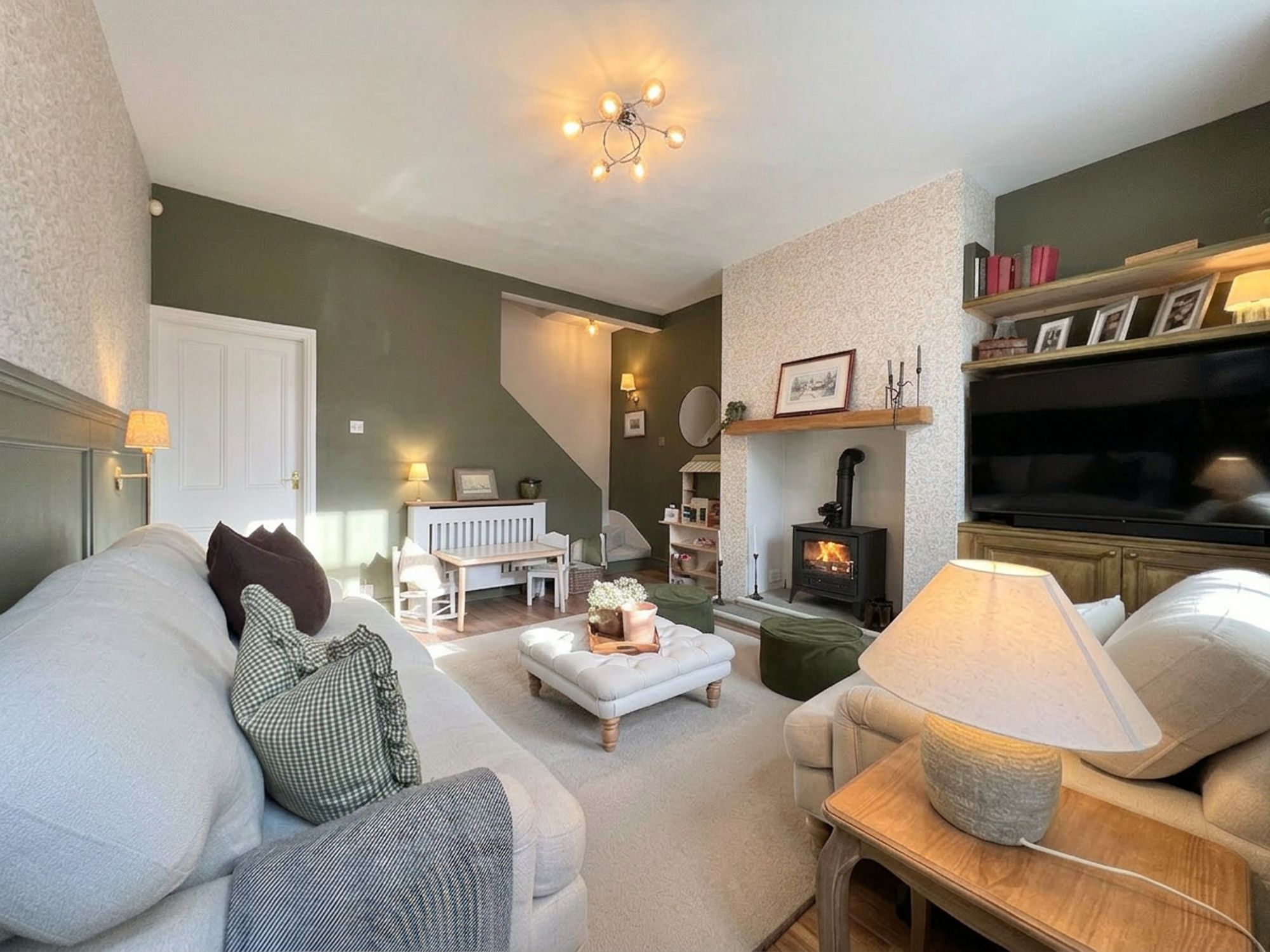 The kitchen is beautifully appointed with a range of chic shaker-style units complemented by coordinating work surfaces, perfectly blending classic design with modern living. Stylish yet highly practical, the space has been thoughtfully arranged to cater to everyday life. A charming Belfast-style sink is ideally positioned beneath a window, allowing natural light to flood the room while framing pleasant views of the rear garden. The kitchen is further enhanced by a fabulous stainless steel range cooker with extractor above, along with a dishwasher, space for a fridge freezer and plumbing for a washing machine. A breakfast peninsula provides a wonderful spot for casual dining, morning coffee or socialising while cooking, while a door leads directly out to the rear garden, allowing entertaining to effortlessly spill outdoors during the warmer months. The kitchen also benefits from a large walk-in cupboard, perfect for storing household items neatly out of sight.
