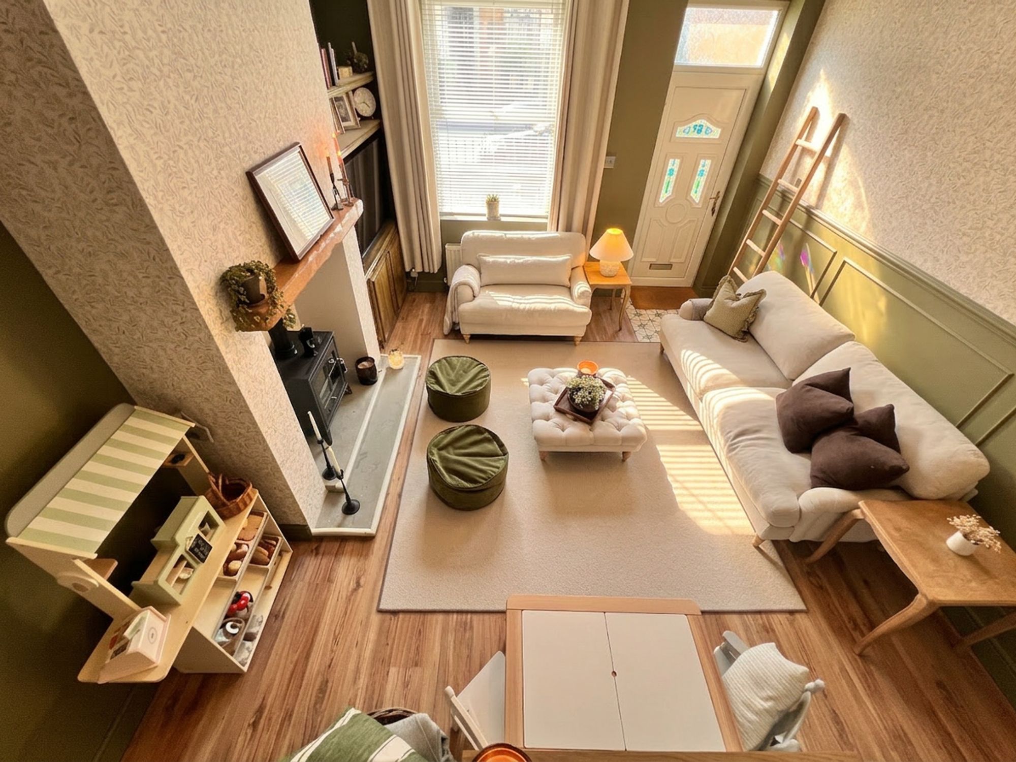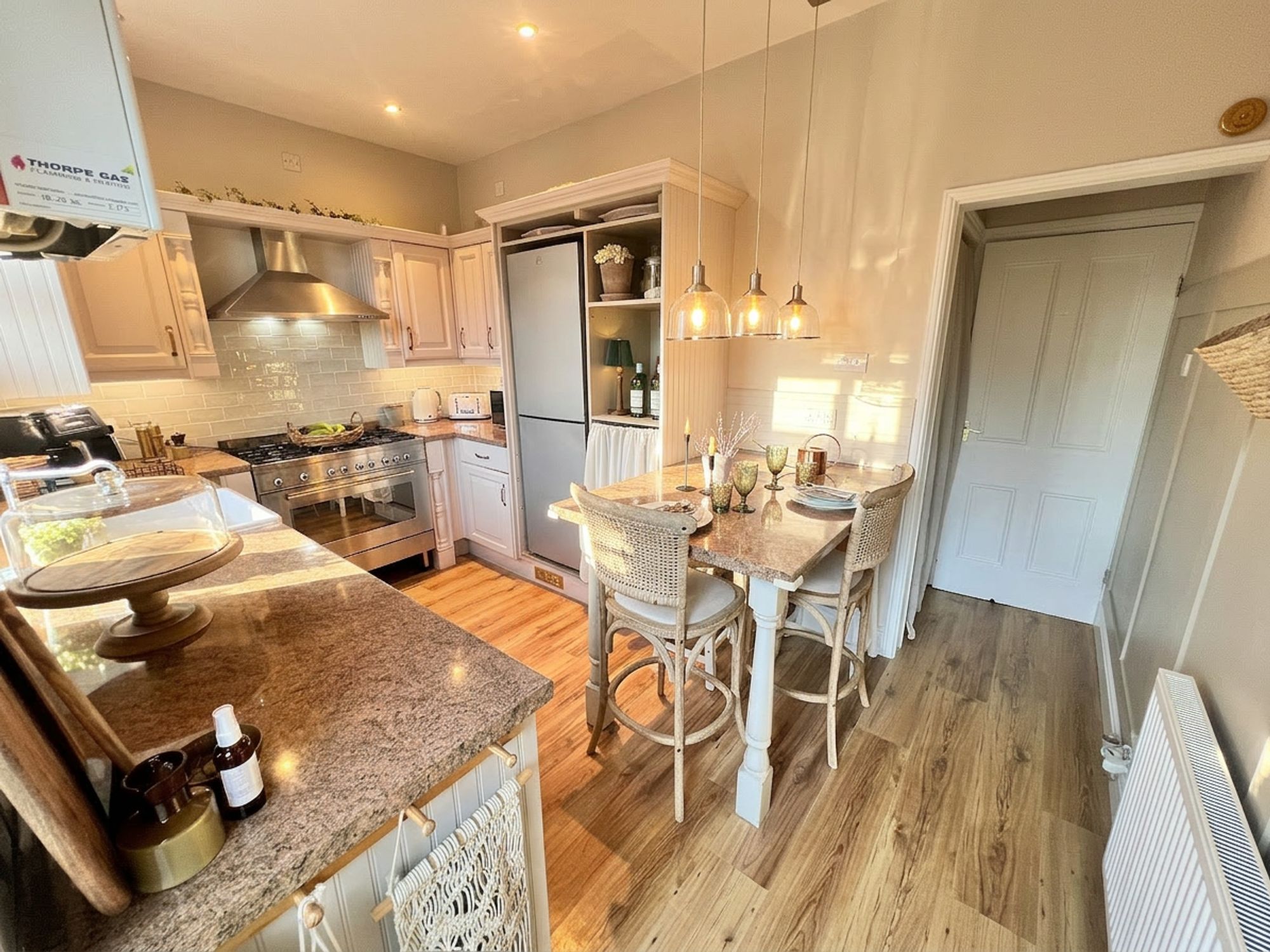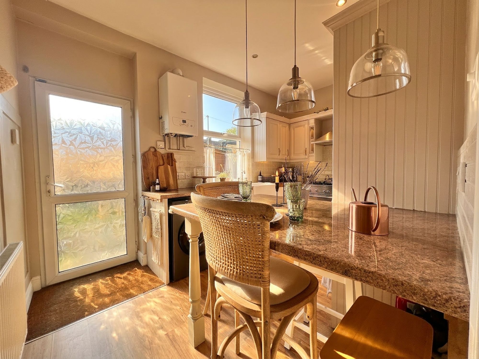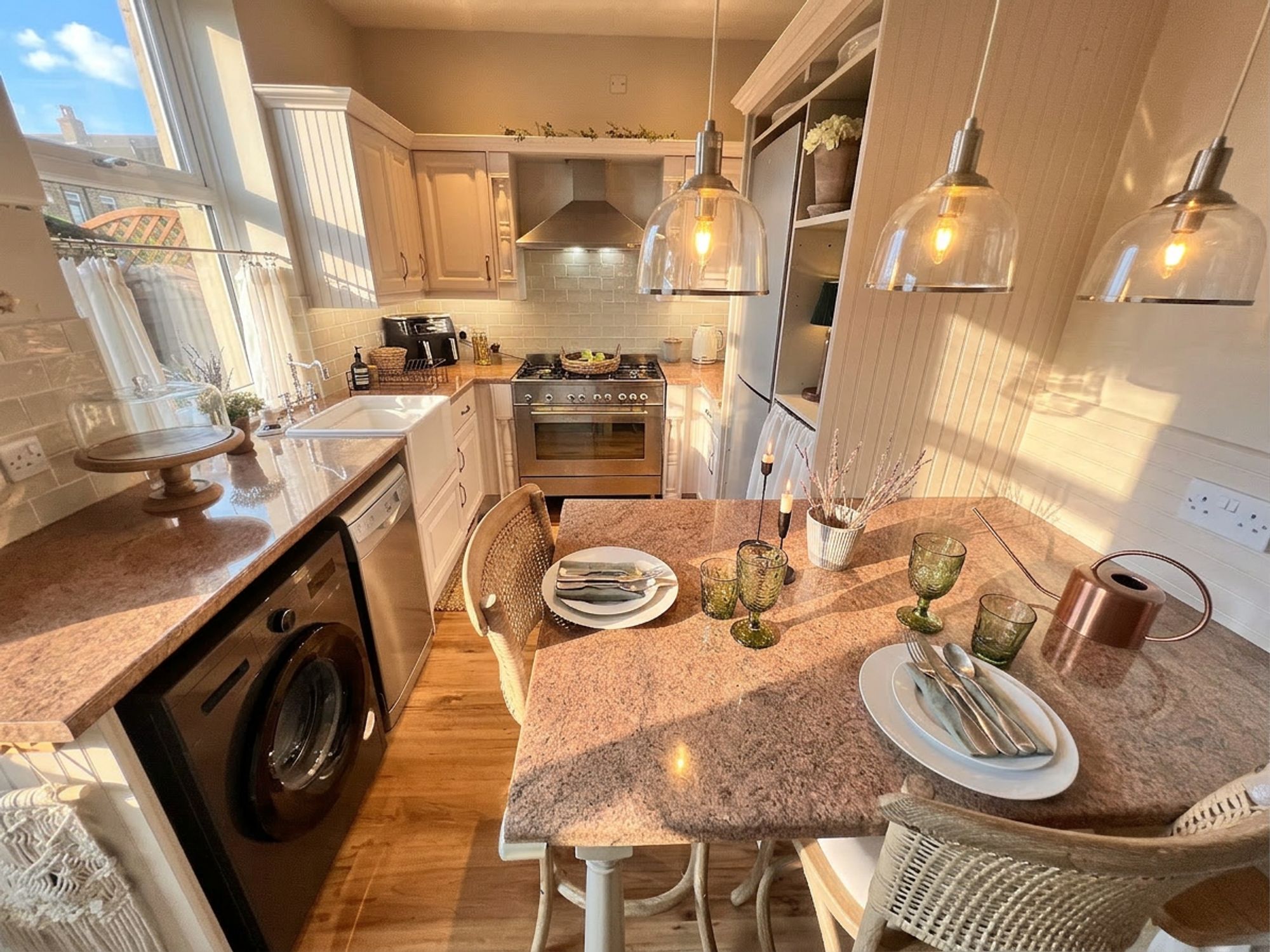 The kitchen is beautifully appointed with a range of chic shaker-style units complemented by coordinating work surfaces, perfectly blending classic design with modern living. Stylish yet highly practical, the space has been thoughtfully arranged to cater to everyday life. A charming Belfast-style sink is ideally positioned beneath a window, allowing natural light to flood the room while framing pleasant views of the rear garden. The kitchen is further enhanced by a fabulous stainless steel range cooker with extractor above, along with a dishwasher, space for a fridge freezer and plumbing for a washing machine. A breakfast peninsula provides a wonderful spot for casual dining, morning coffee or socialising while cooking, while a door leads directly out to the rear garden, allowing entertaining to effortlessly spill outdoors during the warmer months. The kitchen also benefits from a large walk-in cupboard, perfect for storing household items neatly out of sight.
