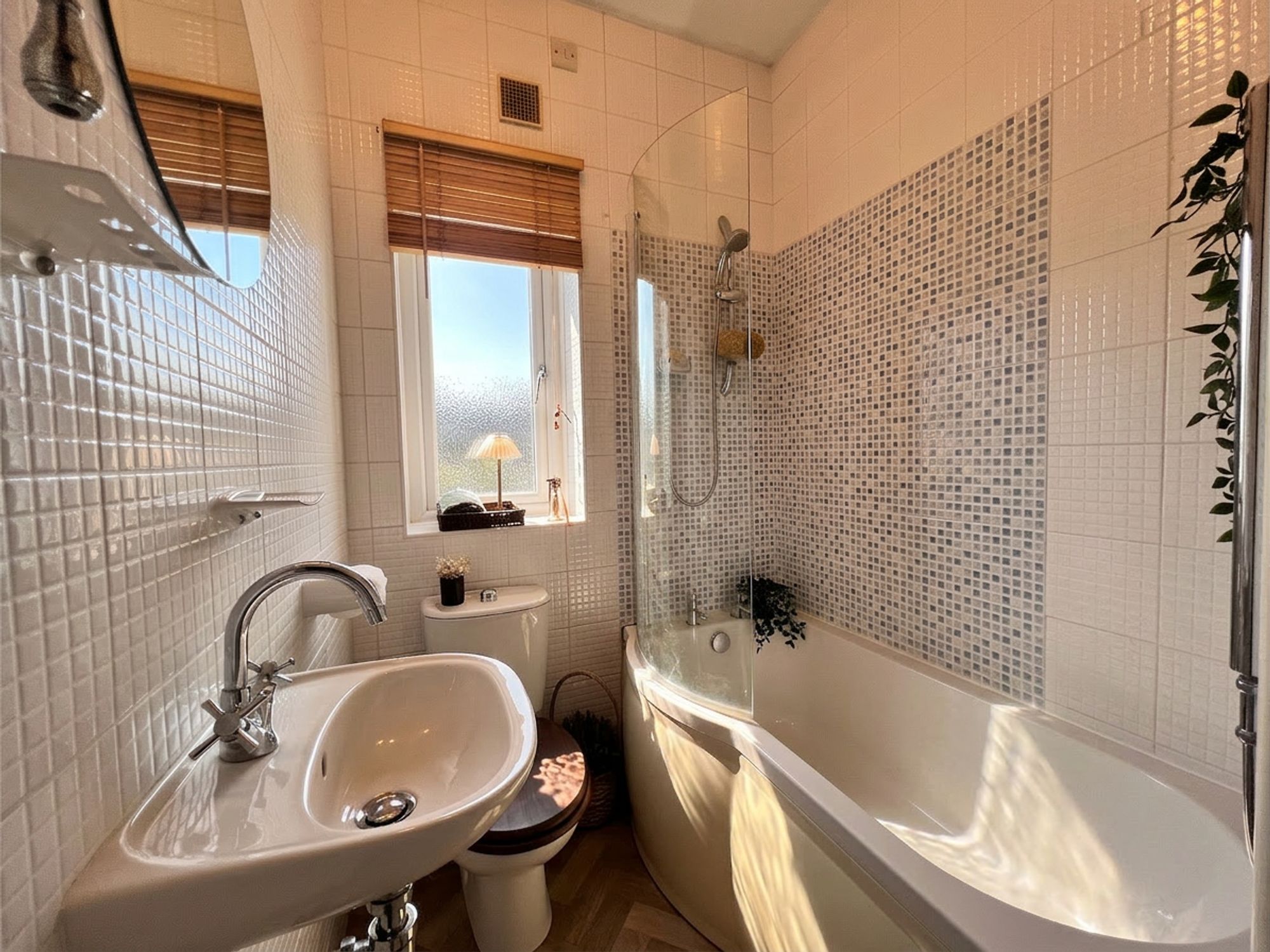 The house bathroom is crisp and contemporary in design, featuring a full-size bath with shower over and curved glass screen, along with a wash basin and W.C. The walls are fully tiled in white, complemented by an attractive mosaic feature within the shower area. Herringbone-effect flooring completes the space, tying the entire aesthetic together to create a stylish and cohesive finish.
