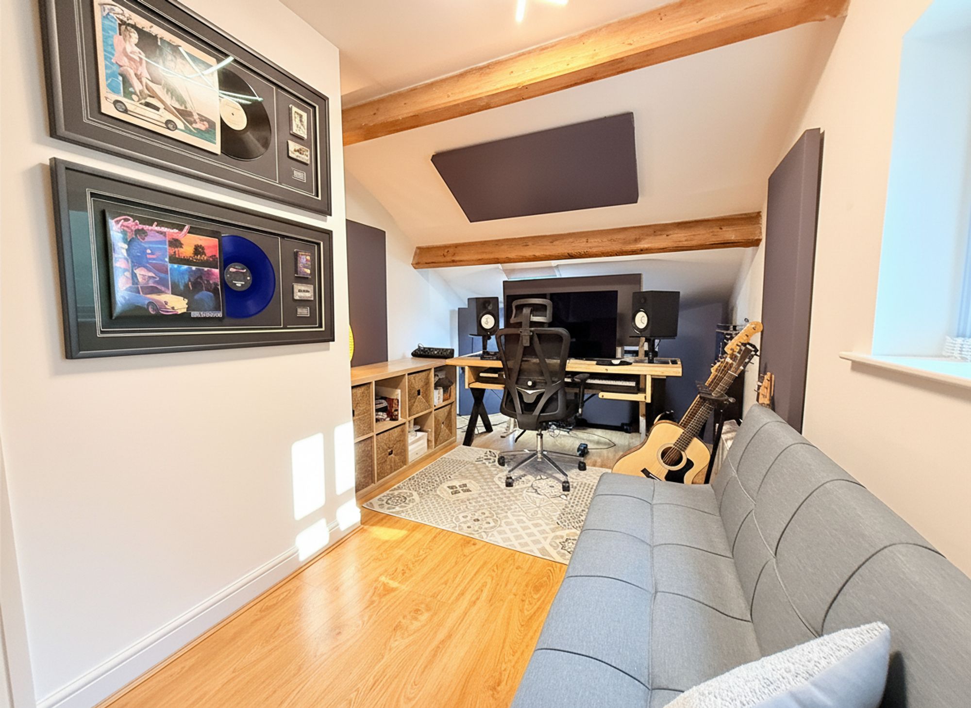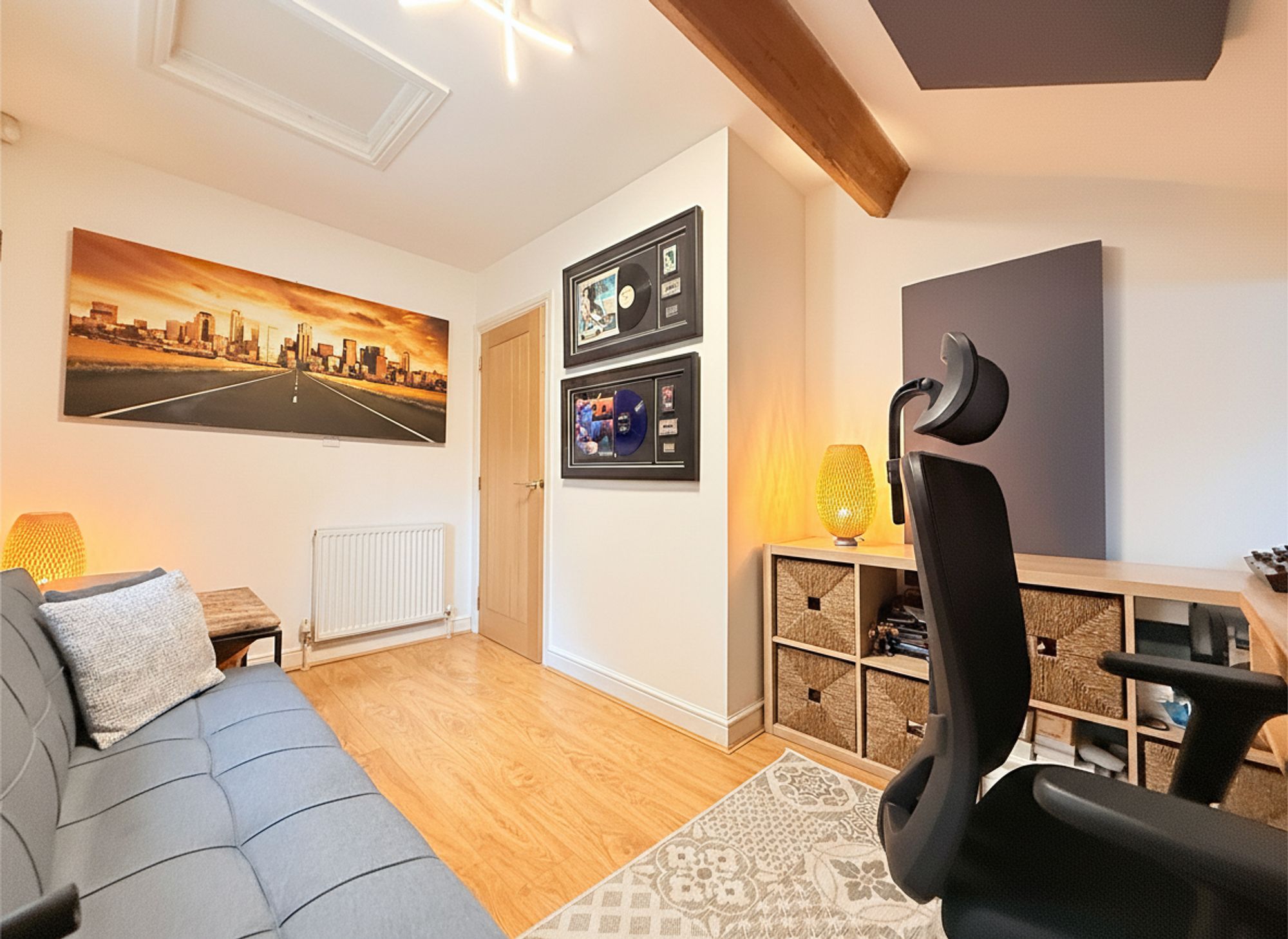 A spacious second bedroom, currently utilised as a home office, finished in neutral décor with wood-effect laminate flooring. The room benefits from dual-aspect windows, including a Velux window, allowing plenty of natural light to fill the space. There is ample room for a bed and additional freestanding furniture, making it a versatile room to suit a variety of needs. Characterful exposed wooden beam details add charm and continuity with the principal bedroom.